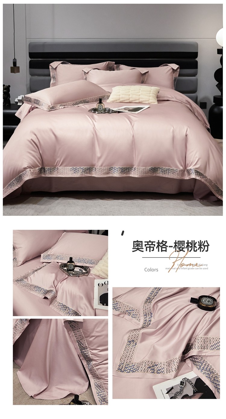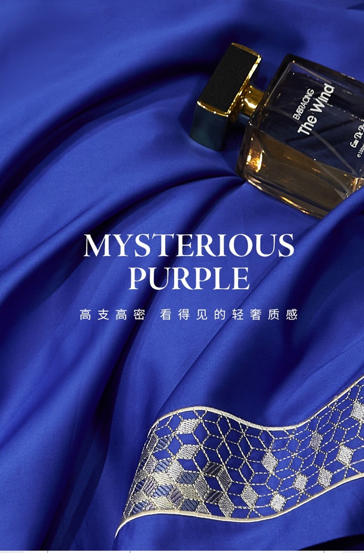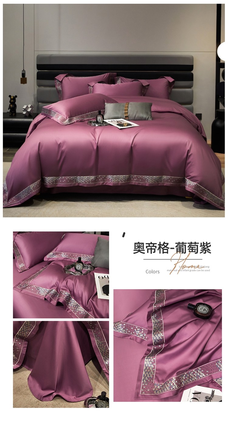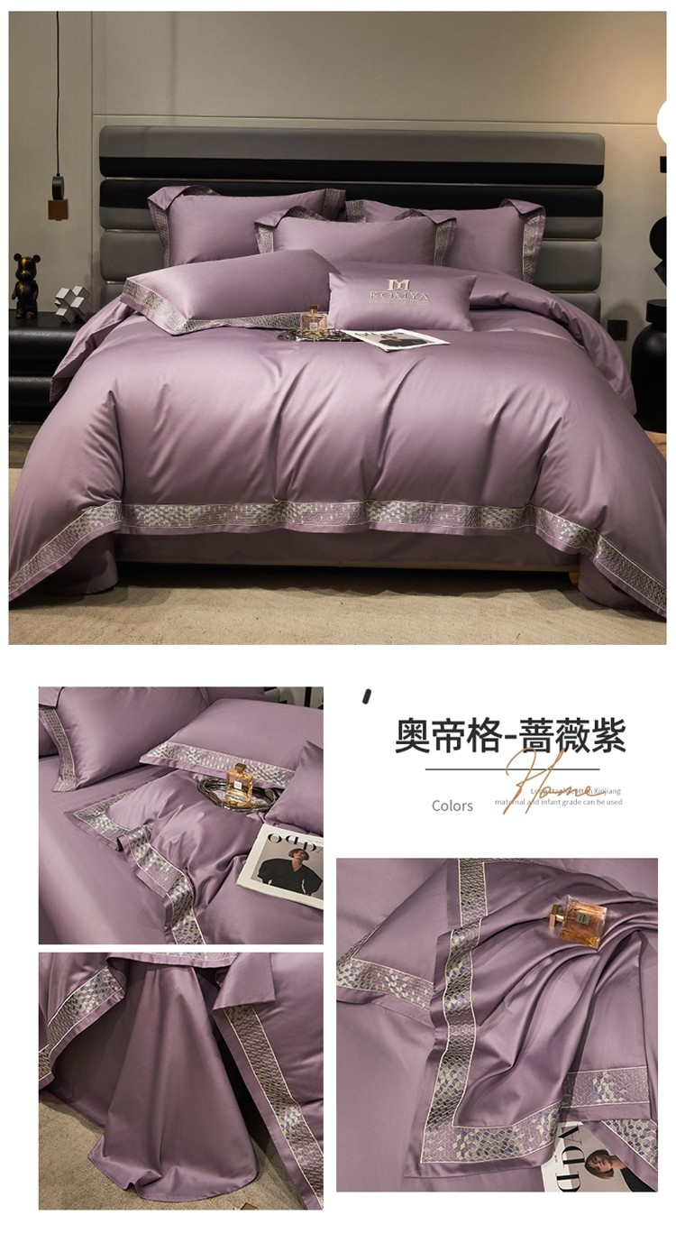 柔觉家纺 天丝刺绣贡缎提花全棉四件套,卡曼时尚-粉紫
