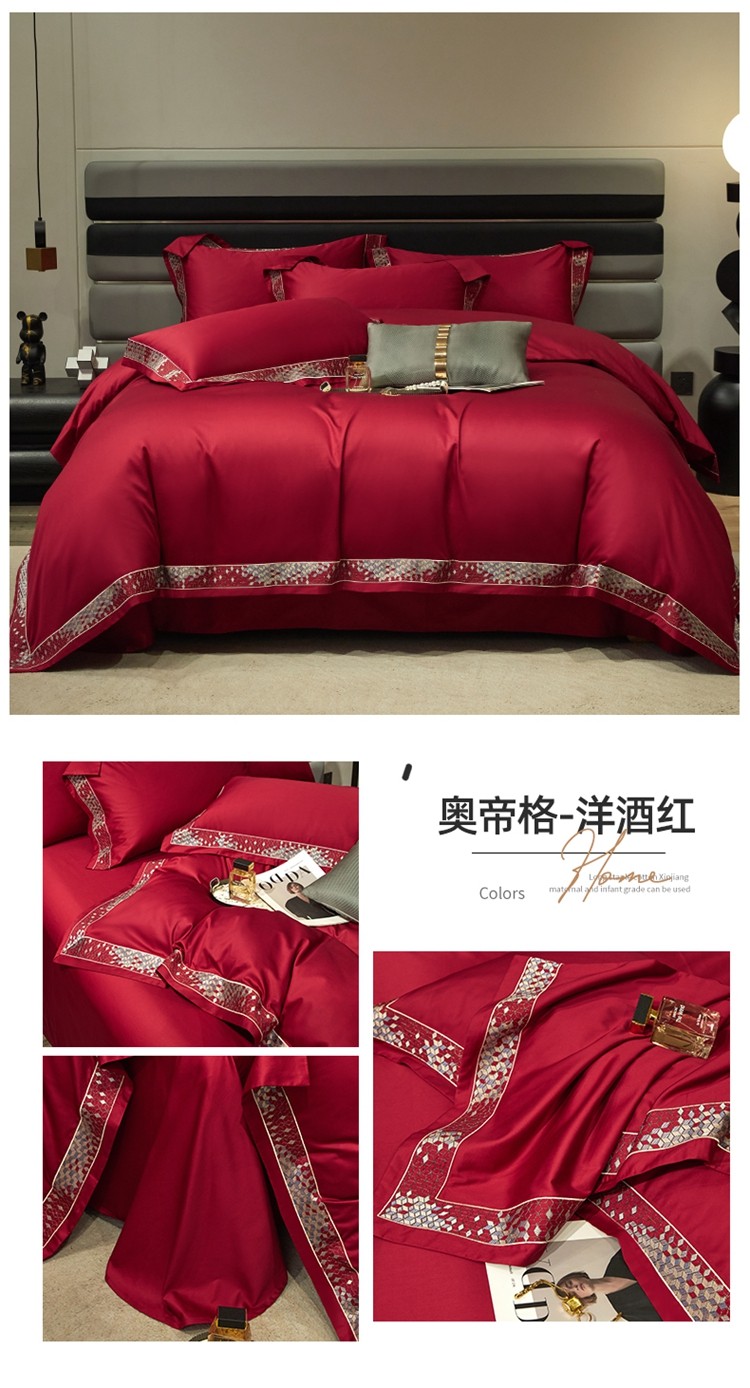 柔觉家纺 天丝刺绣贡缎提花全棉四件套,雅普诺-红灰