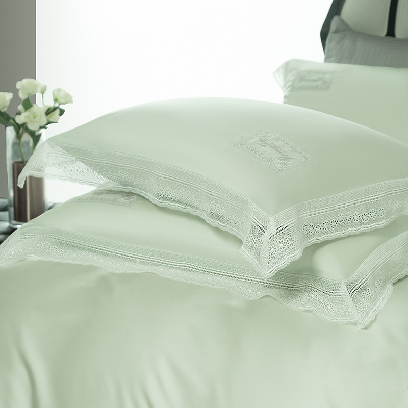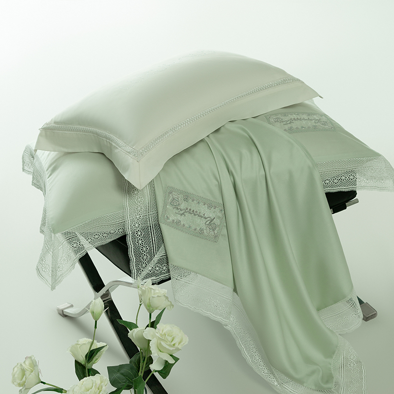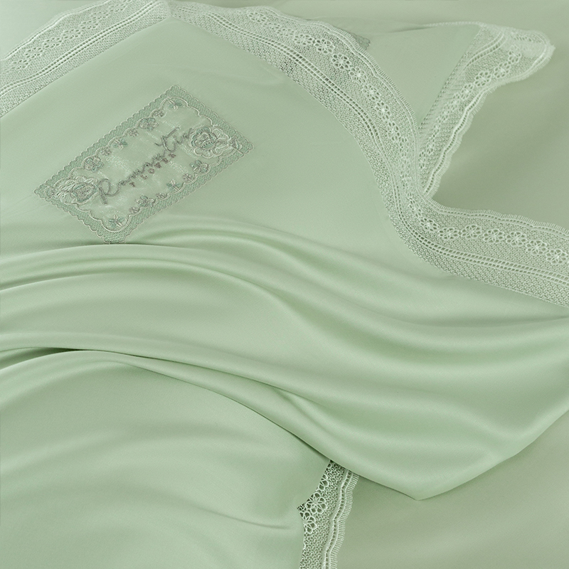 商品名称:诗黛尔 2025新款春夏100%莱赛尔蕾丝绣花四件套-朵芮雅系列 朵芮雅-枝条绿