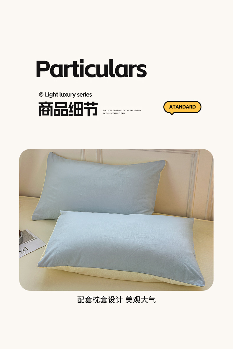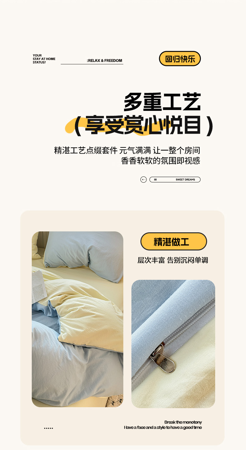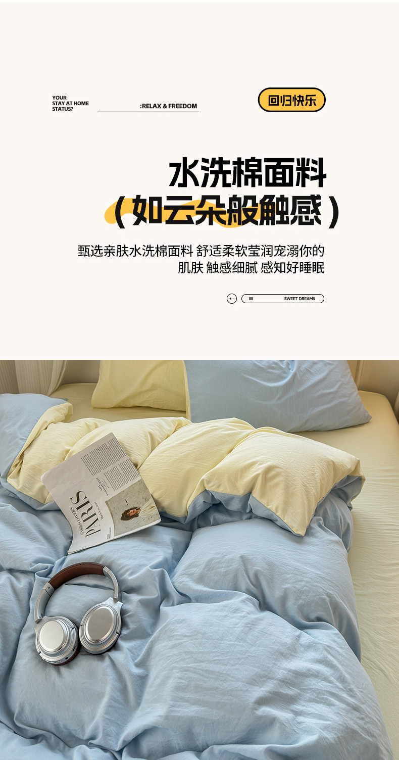 商品名称:冕悠家纺 2025新款A类105克超柔褶皱水洗棉拼色四件套-单被套 月白蓝+芝士黄