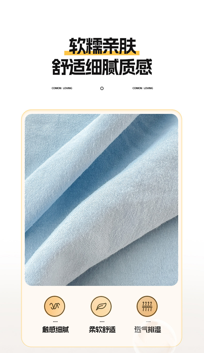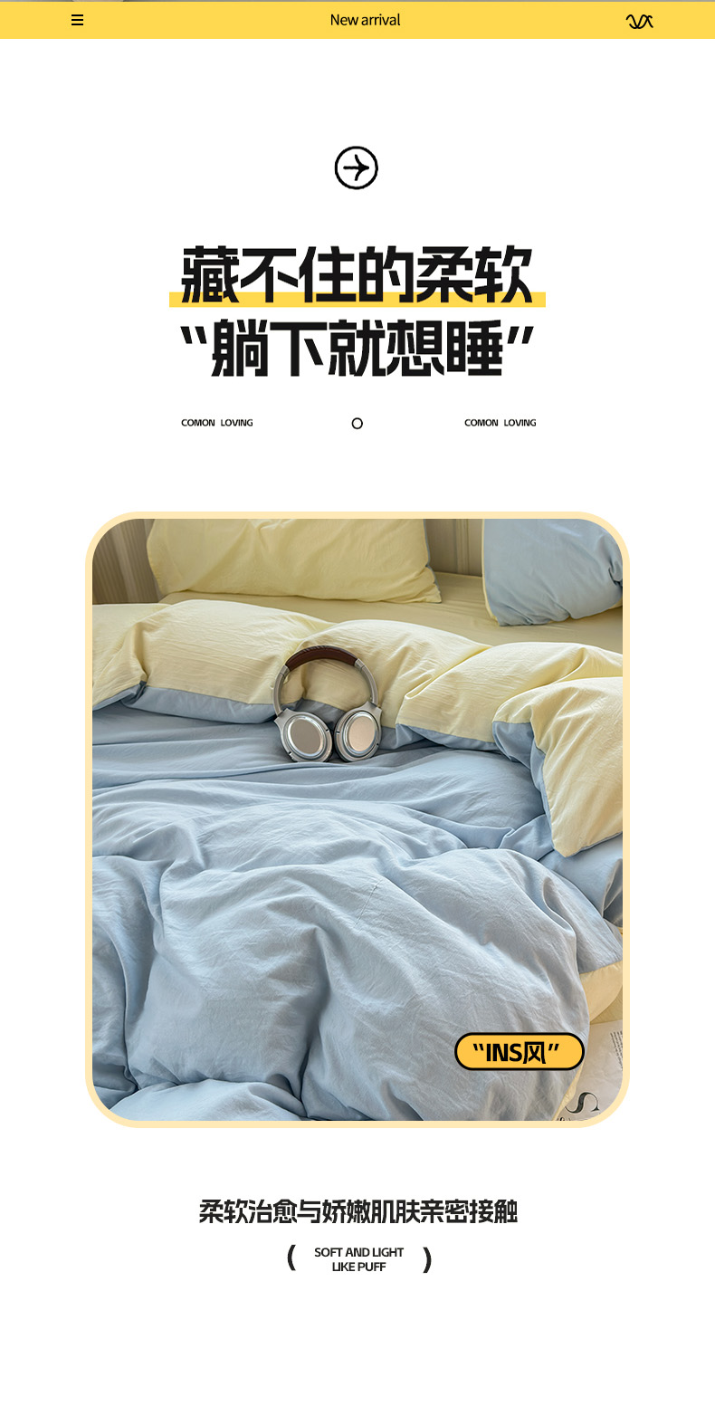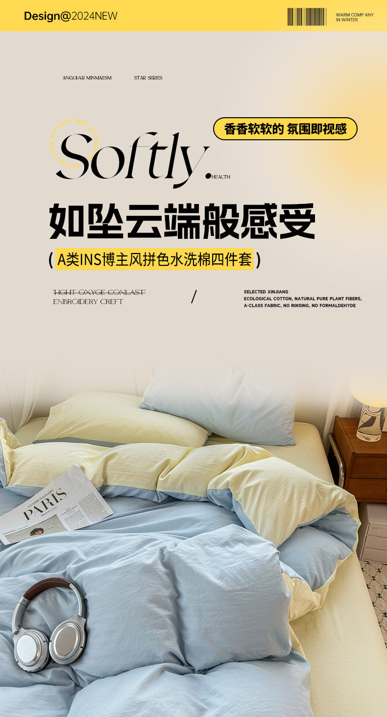 商品名称:冕悠家纺 2025新款A类105克超柔褶皱水洗棉拼色四件套-单被套 月白蓝+芝士黄