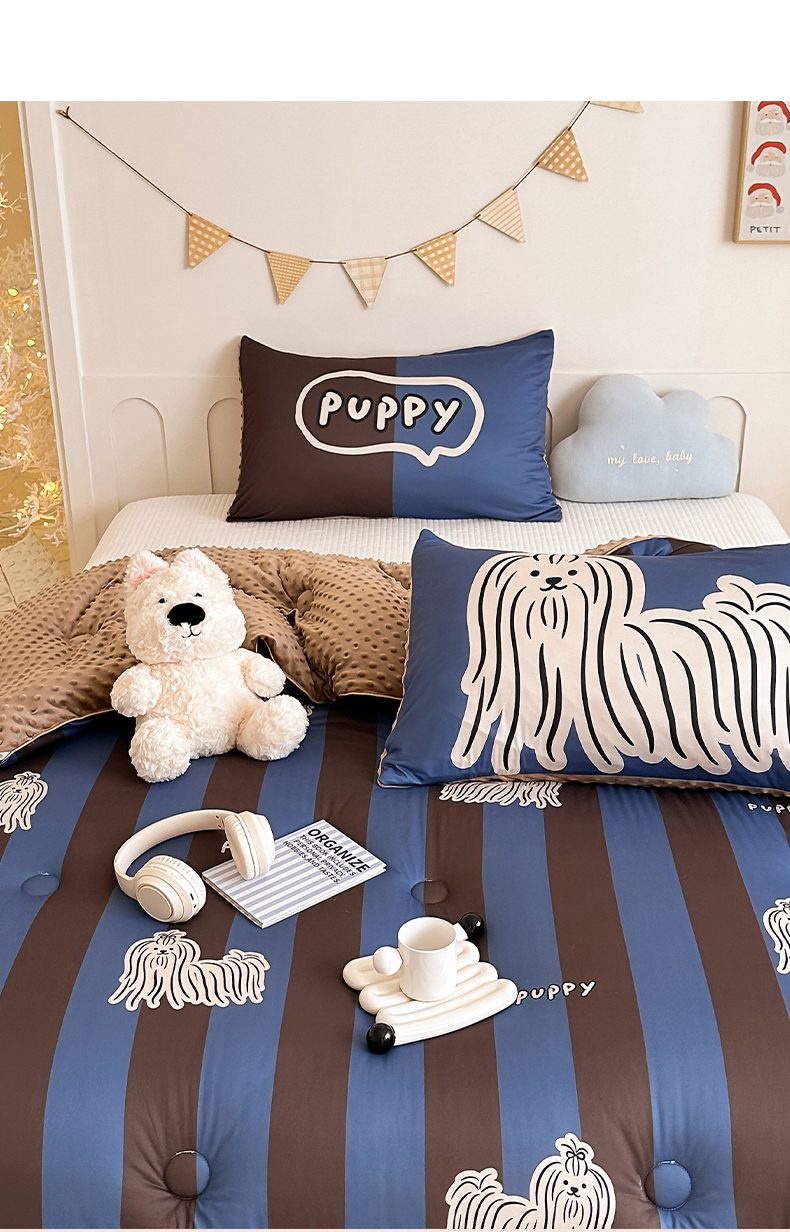 (总)RYB红黄兰 2025新款设计师原创A版抽条兔兔绒B版牛奶绒印花四件套,咖色潦草狗,波点黑猫,包装展示图,星星蝴蝶结,蓝色兔兔,奶油西高地