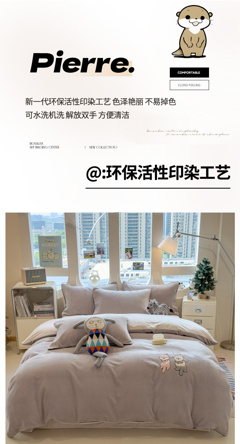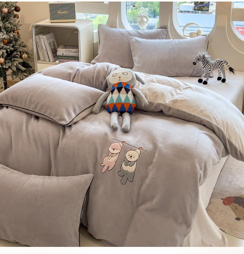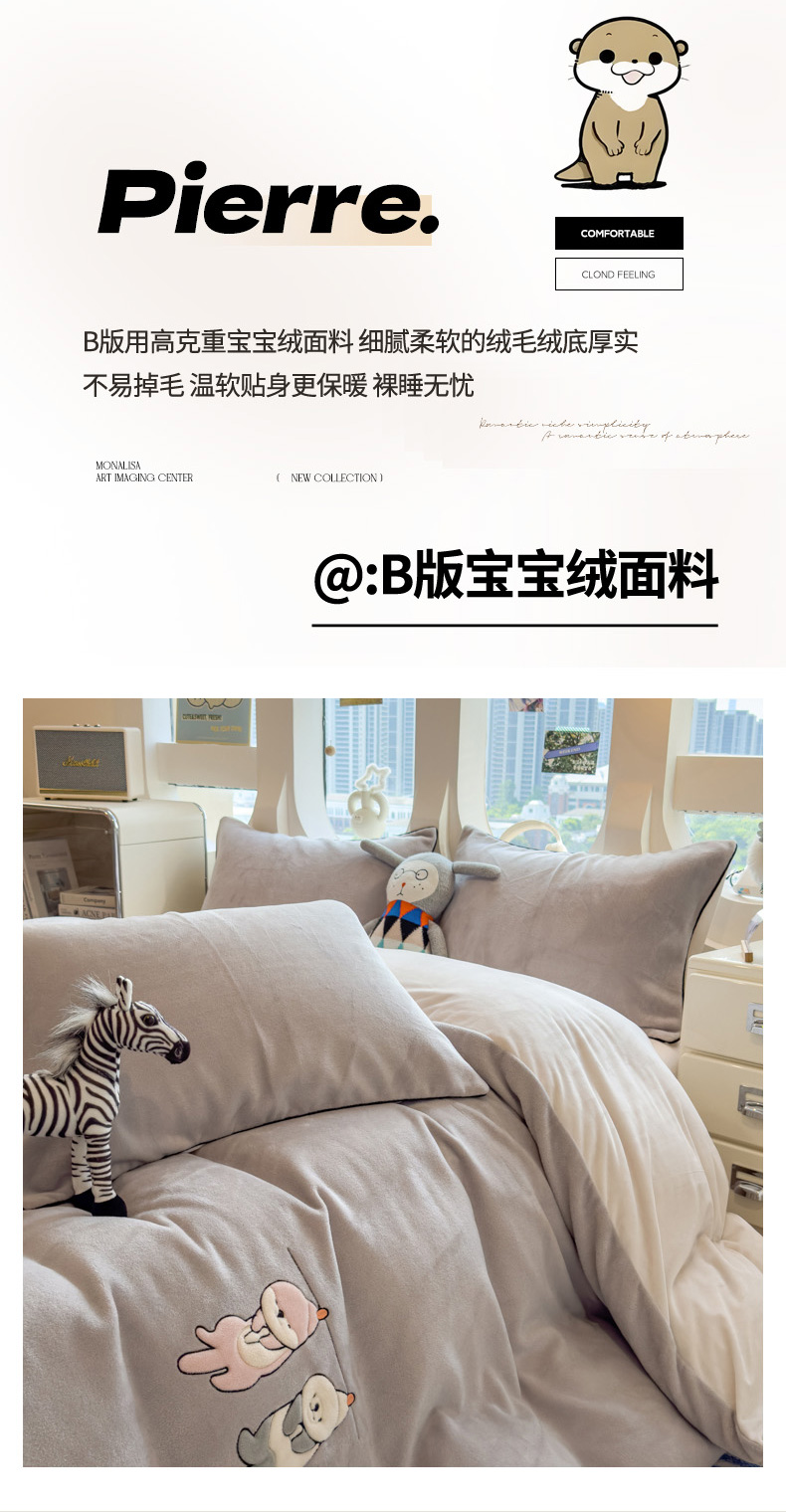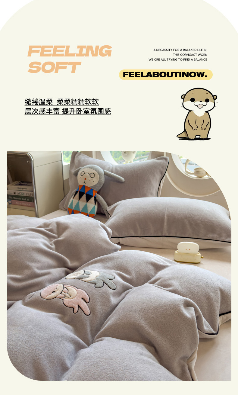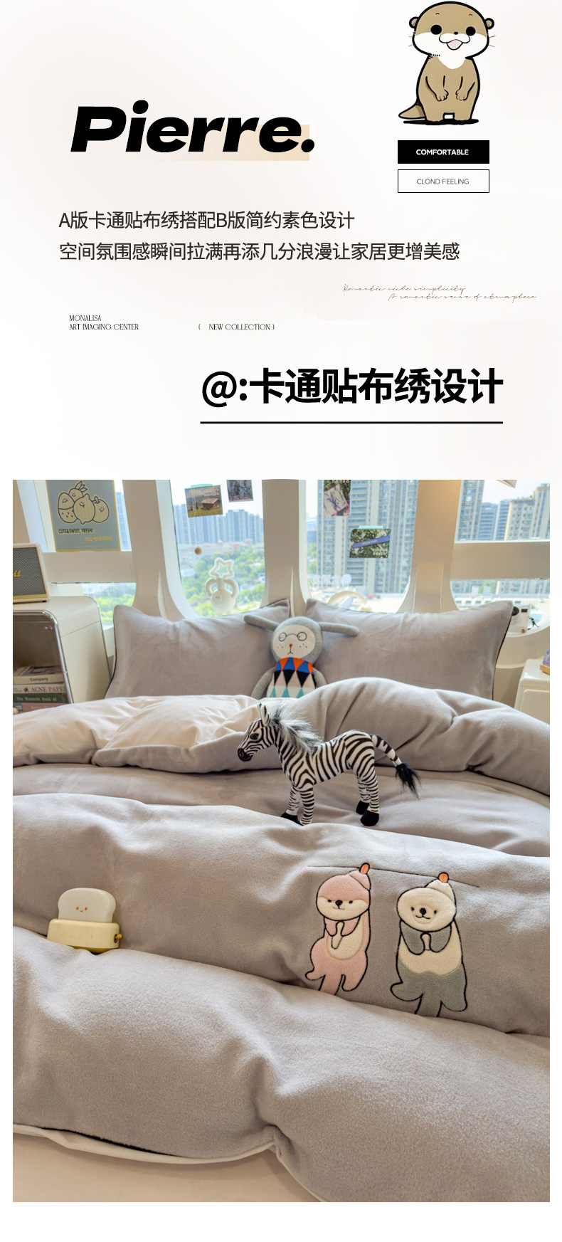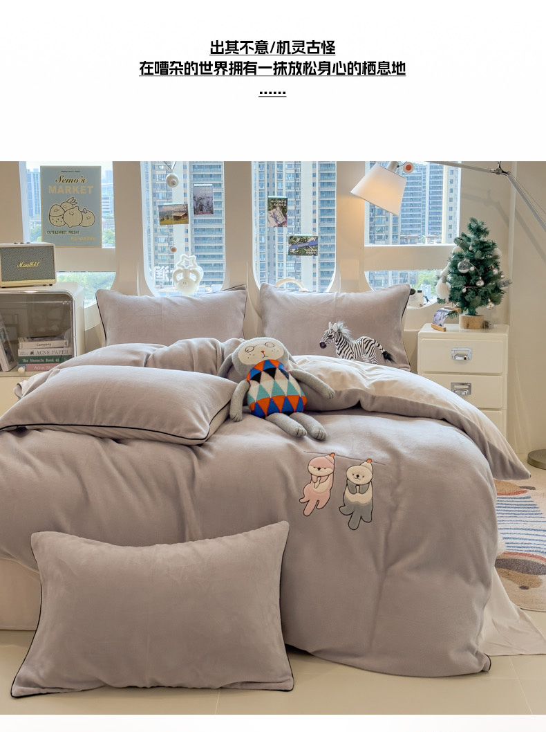 当前位置: 91家纺网 > 商品网购 > 床品套件 > 四件套 > 其它四件套 > 印季家纺 2025新款小两口海獭绒贴布绣四件套 小两口-浅灰-粉灰