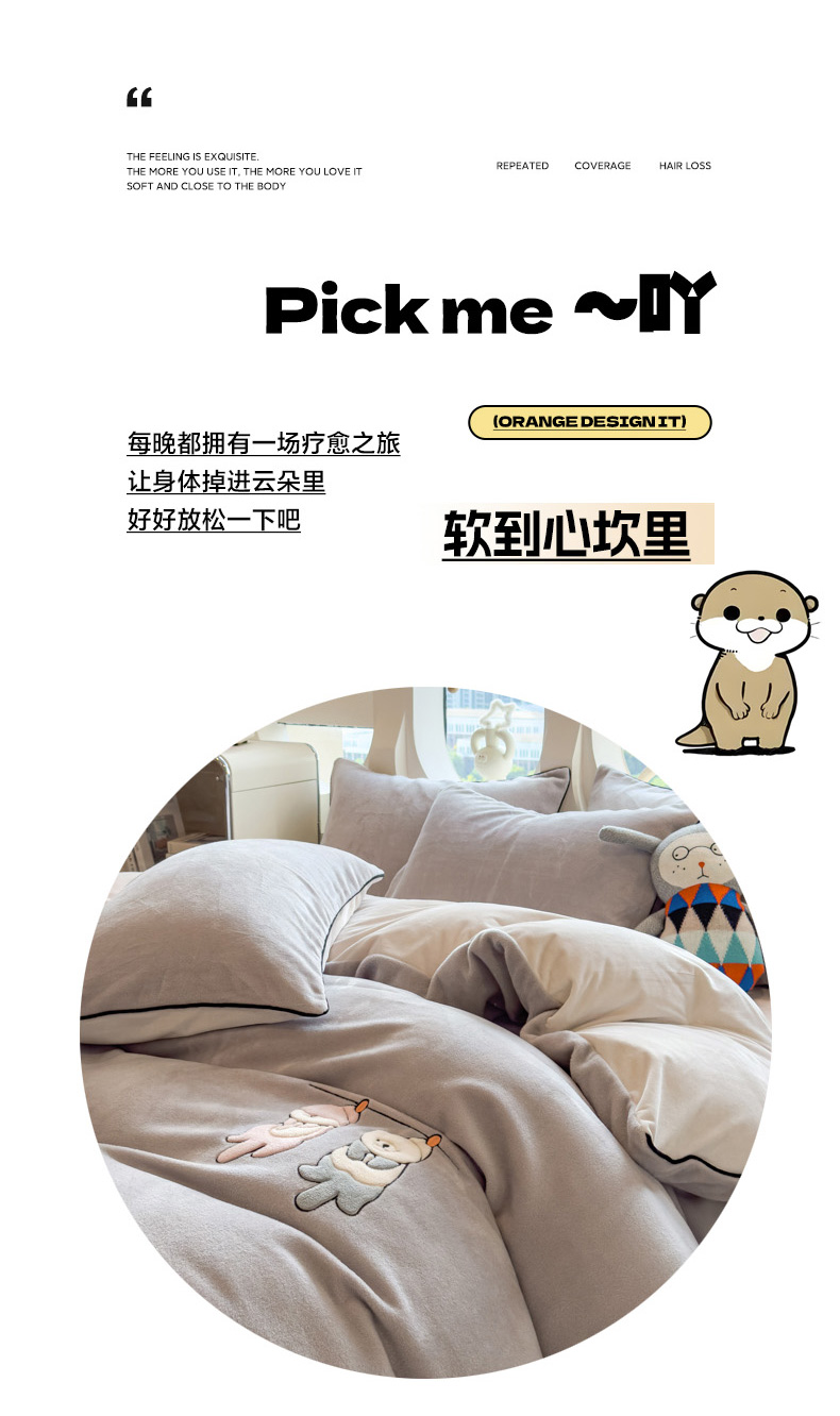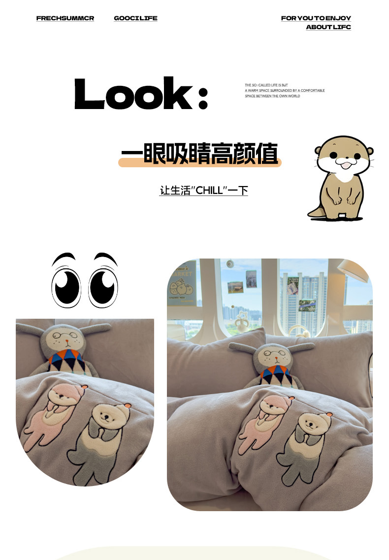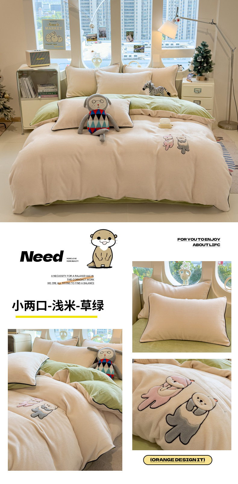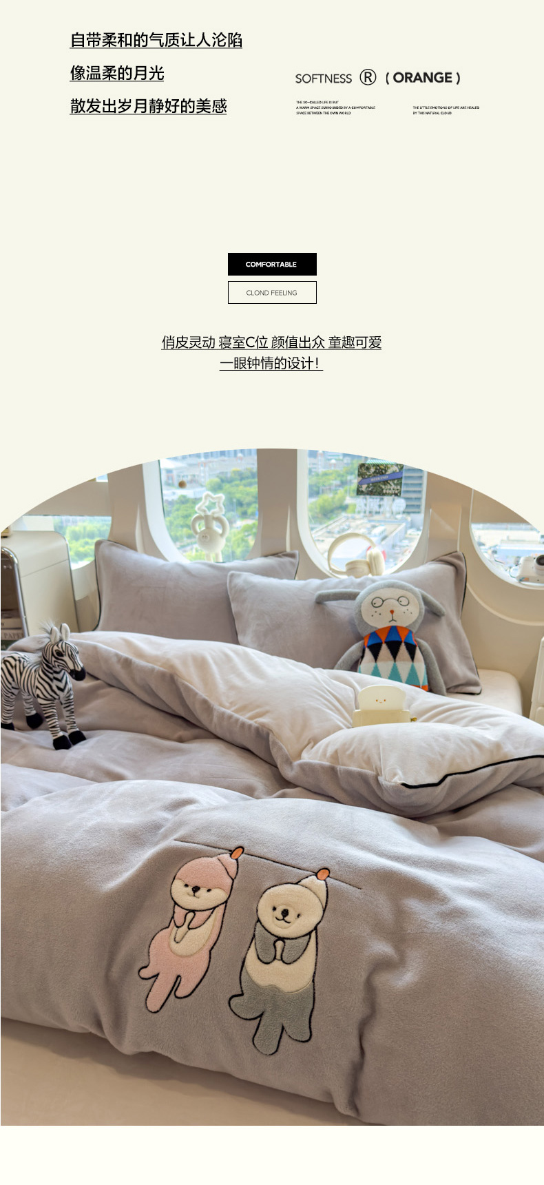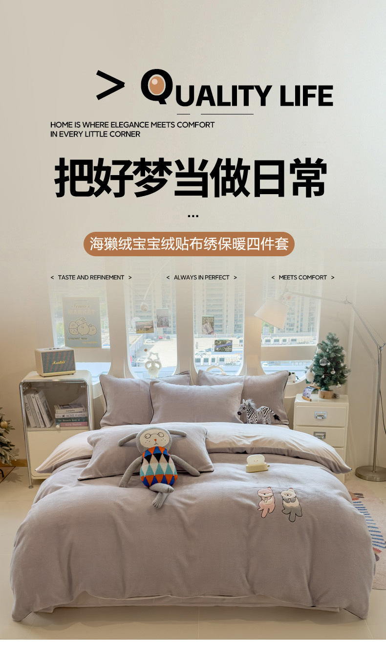 当前位置: 91家纺网 > 商品网购 > 床品套件 > 四件套 > 其它四件套 > 印季家纺 2025新款小两口海獭绒贴布绣四件套 小两口-浅灰-粉灰