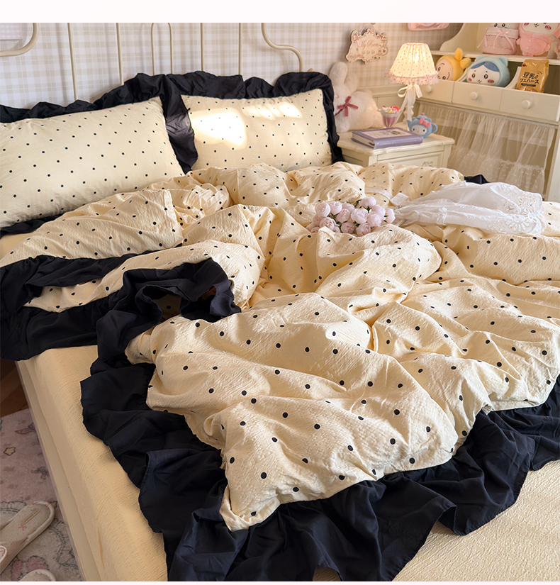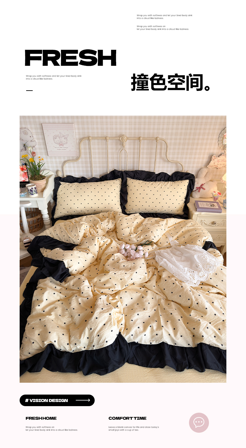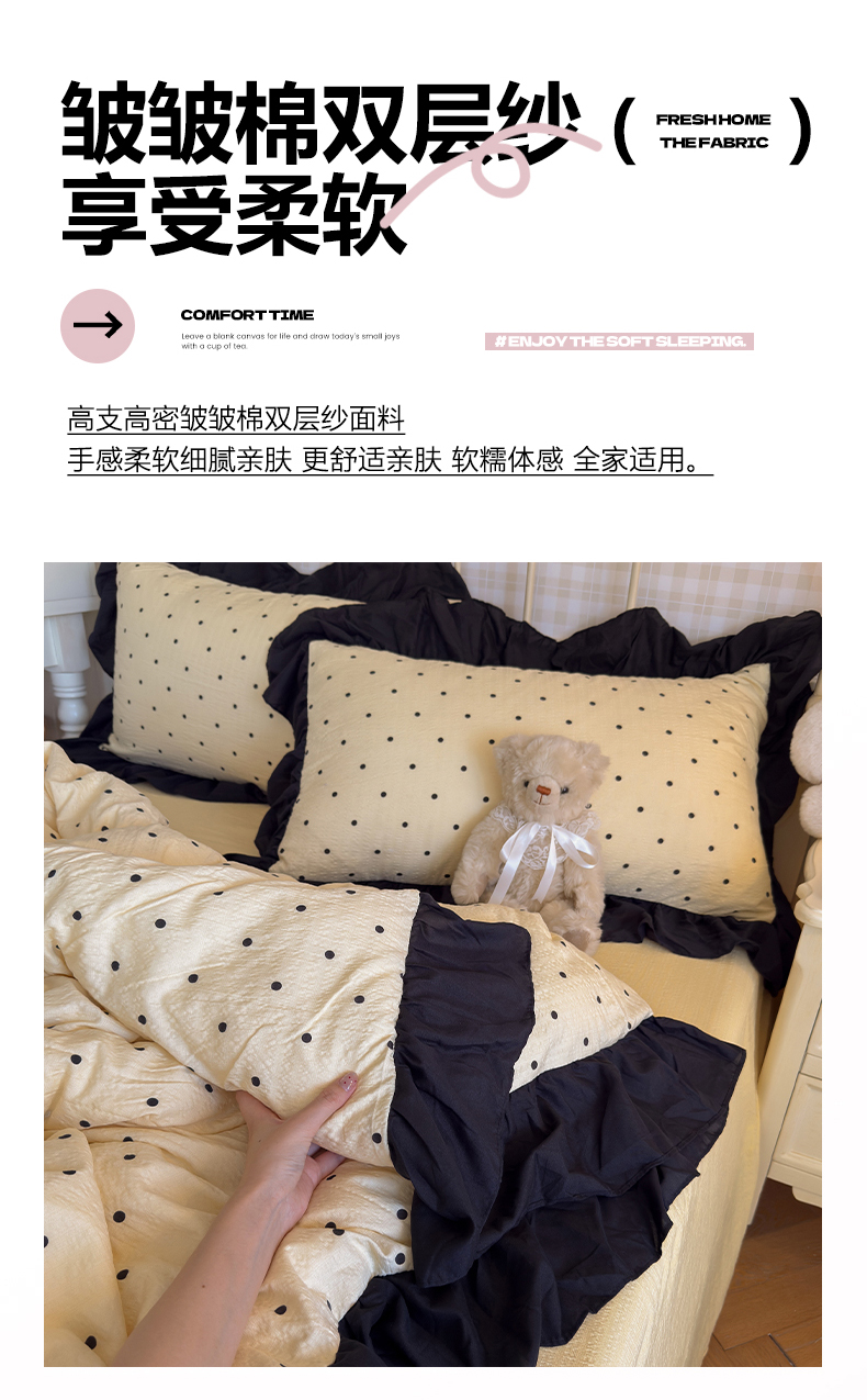 当前位置: 91家纺网 > 商品网购 > 床品套件 > 四件套 > 双层纱四件套 > 优卡迪家纺馆 2026新款皱皱棉双层纱黑花边四件套下载文件包含买家秀 波点生活-奶黄