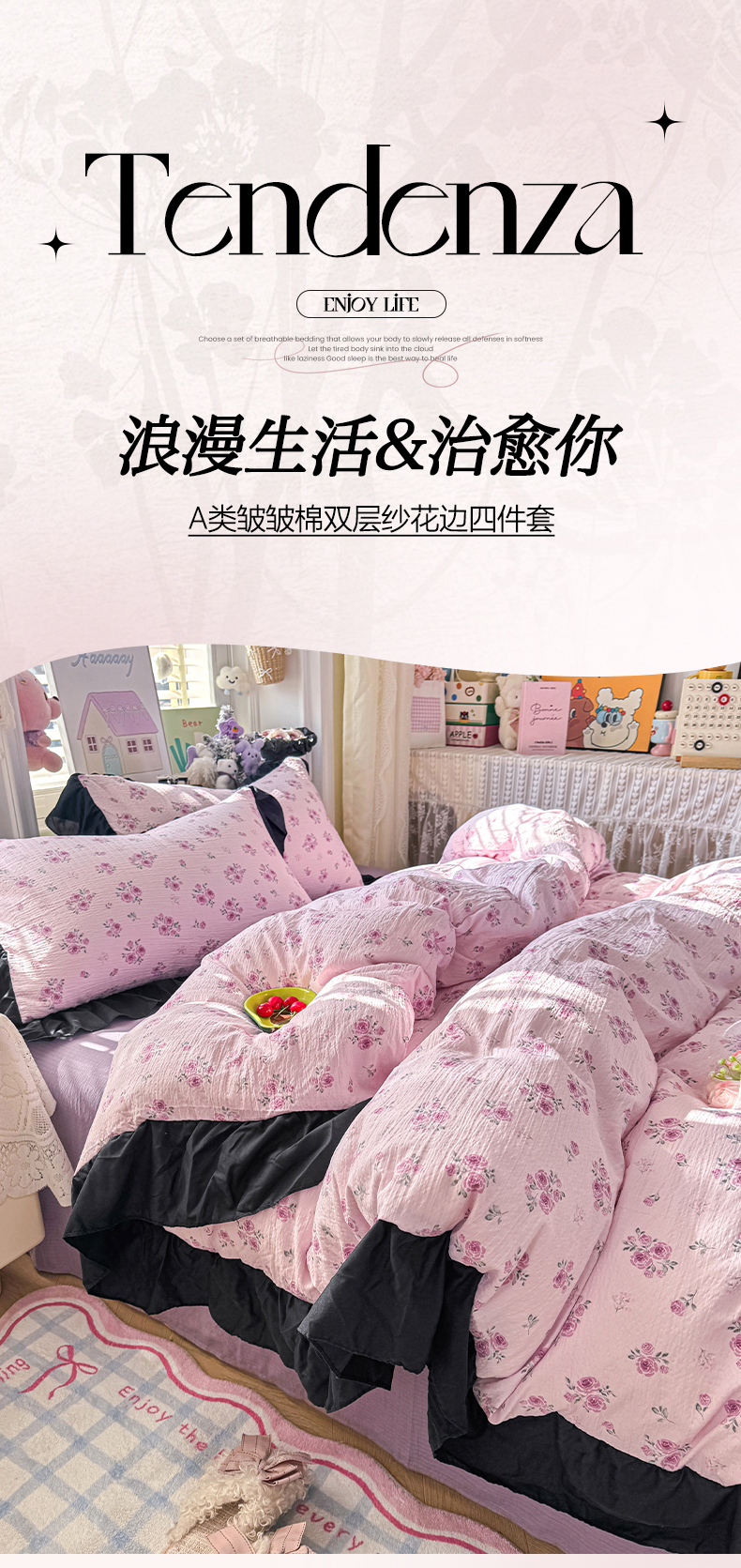 当前位置: 91家纺网 > 商品网购 > 床品套件 > 四件套 > 双层纱四件套 > 优卡迪家纺馆 2026新款皱皱棉双层纱黑花边四件套下载文件包含买家秀 泡沫之夏