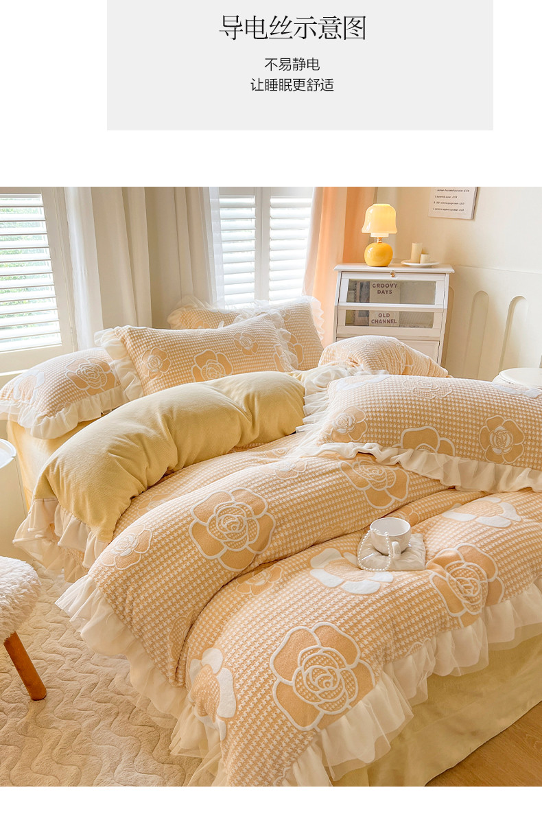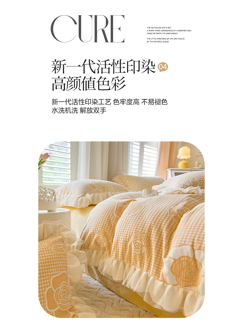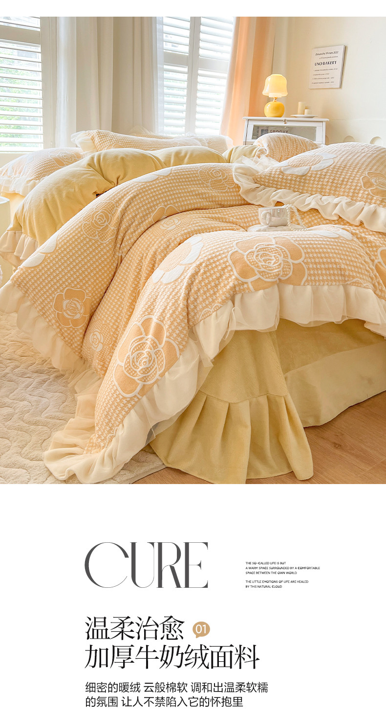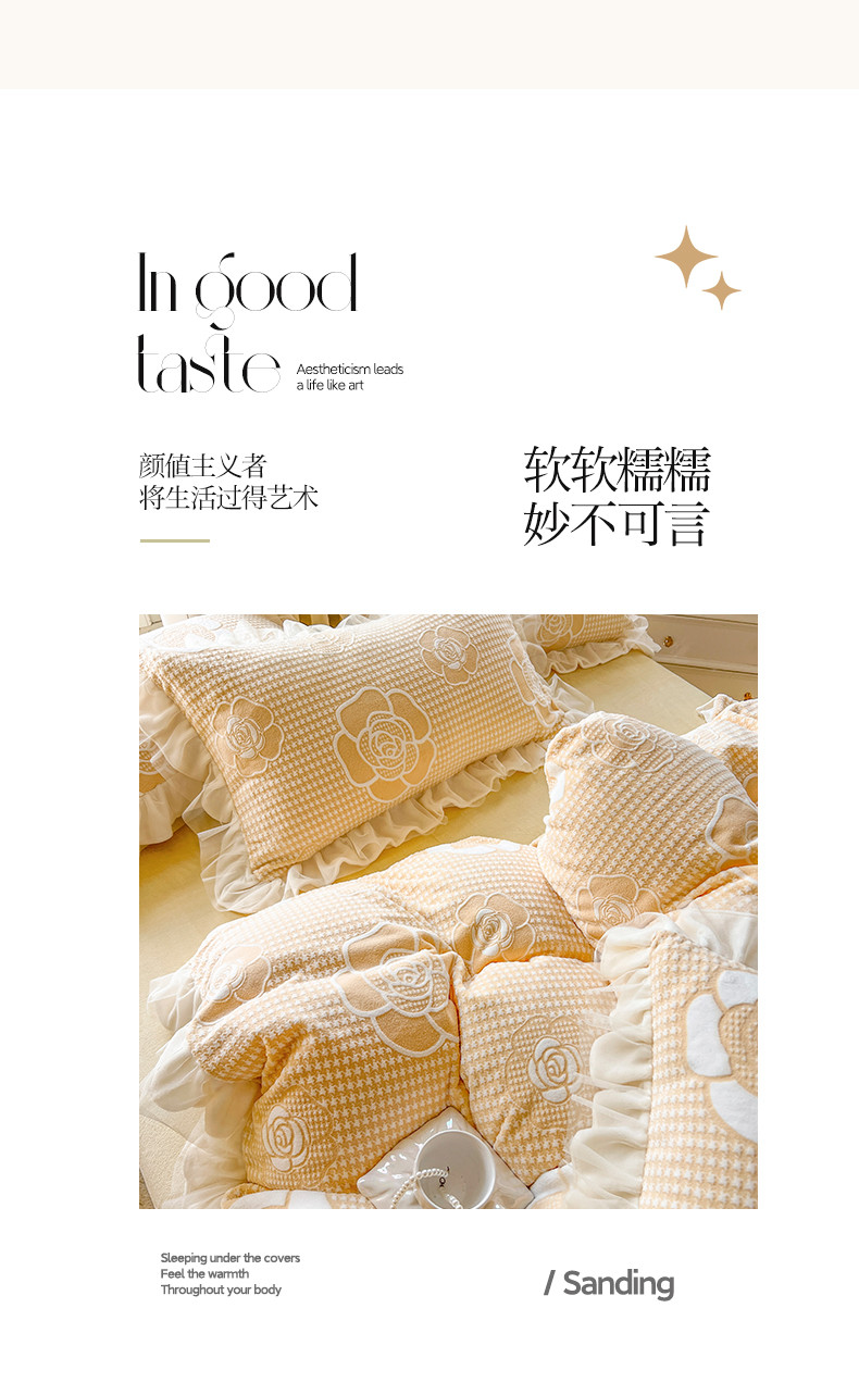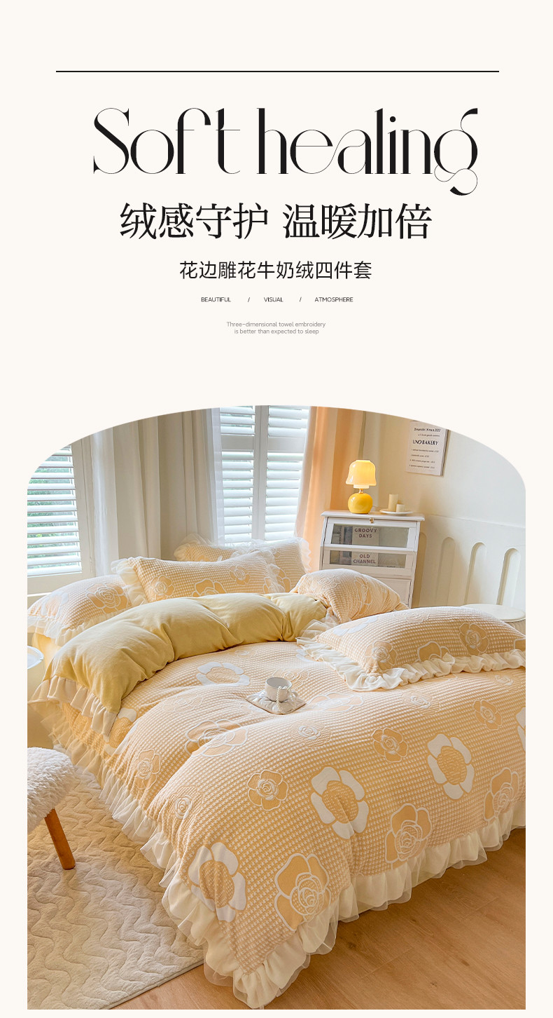 商品名称:麒豆豆 2023新款立体花边雕花牛奶绒四件套直播爆款 倾心花语-米黄