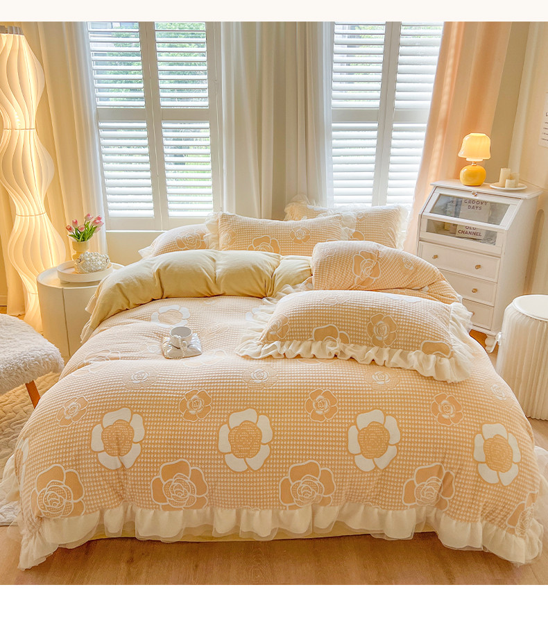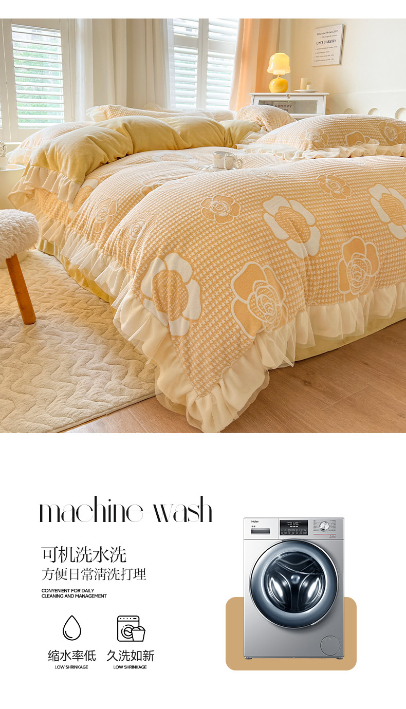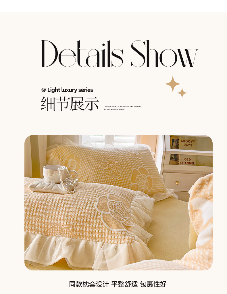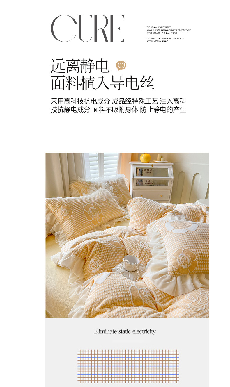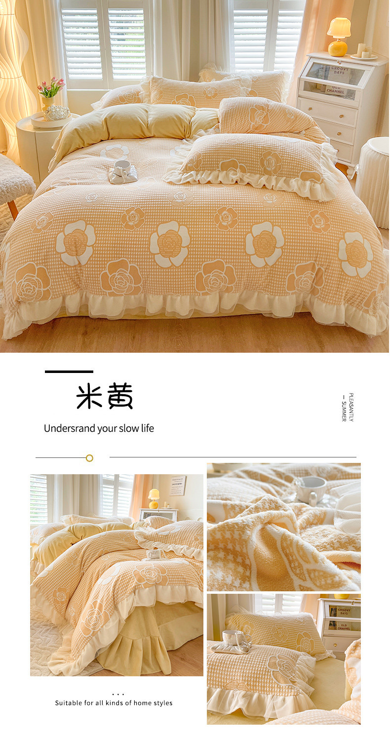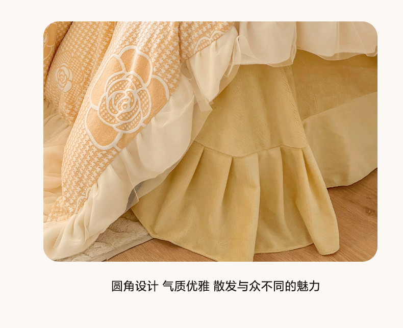 商品名称:麒豆豆 2023新款立体花边雕花牛奶绒四件套直播爆款 倾心花语-米黄