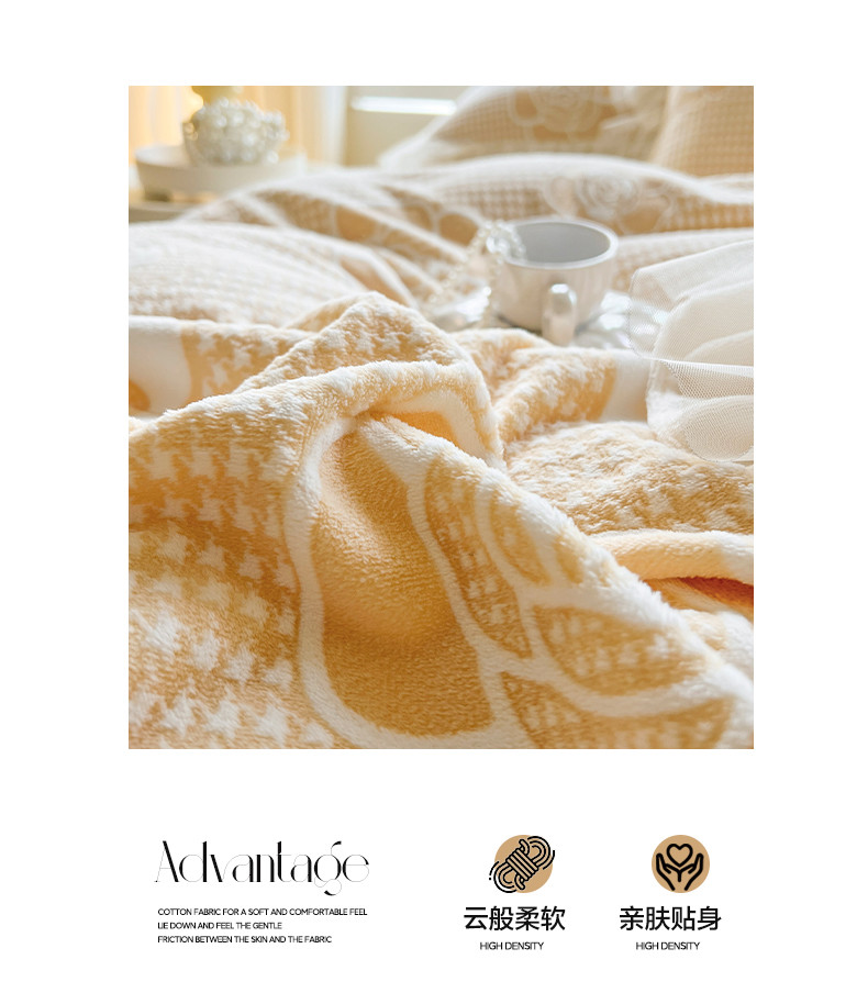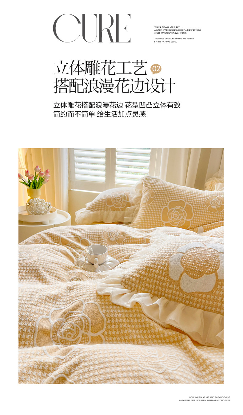 麒豆豆 2023新款立体花边雕花牛奶绒四件套直播爆款 倾心花语-米黄