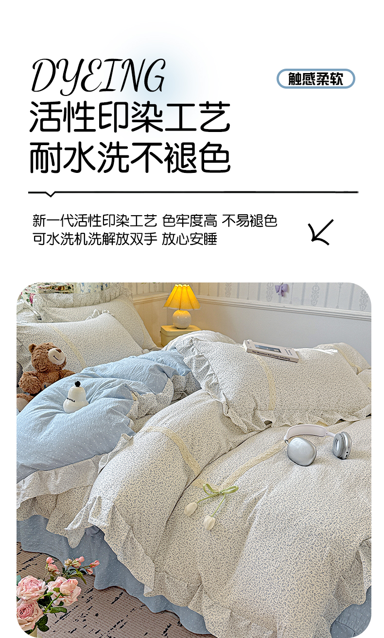 (总)富米莱(原臻工厂) 2026春夏新款仿棉A类韩系大花边床盖床裙四件套,小杏芙,波点汽球,悠悠花香,烟火气星辰,小花蓝,小花粉,晚樱落海,山樱漫岛,玫瑰庄园,花影,耳机猫猫,动物世界,七彩点点,艾利花园