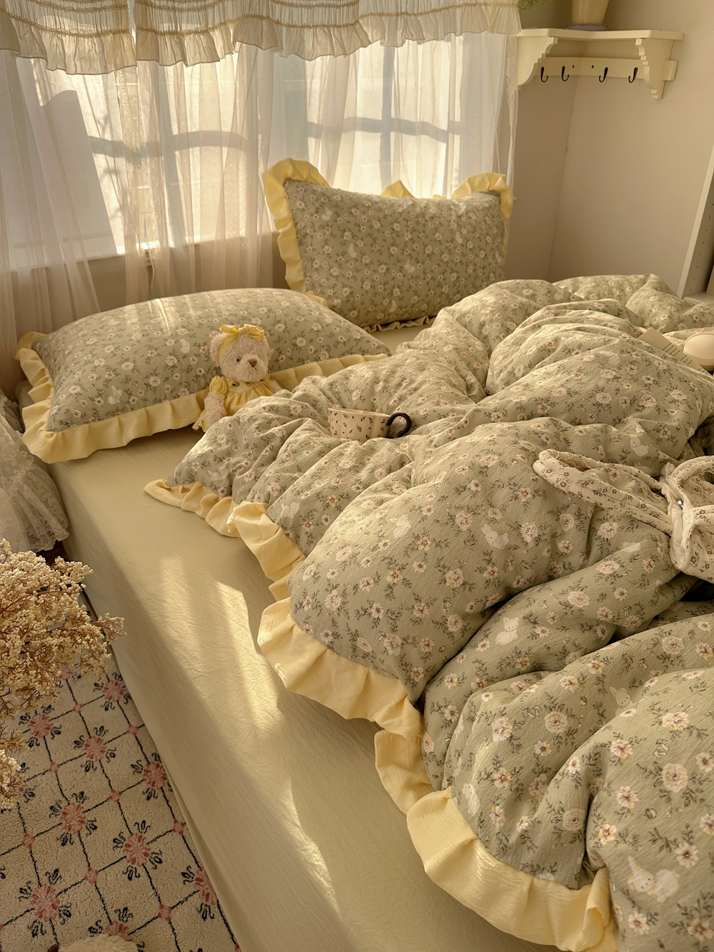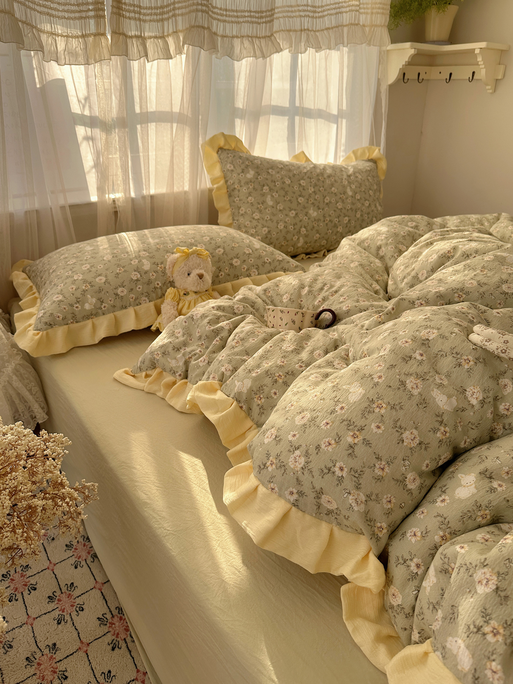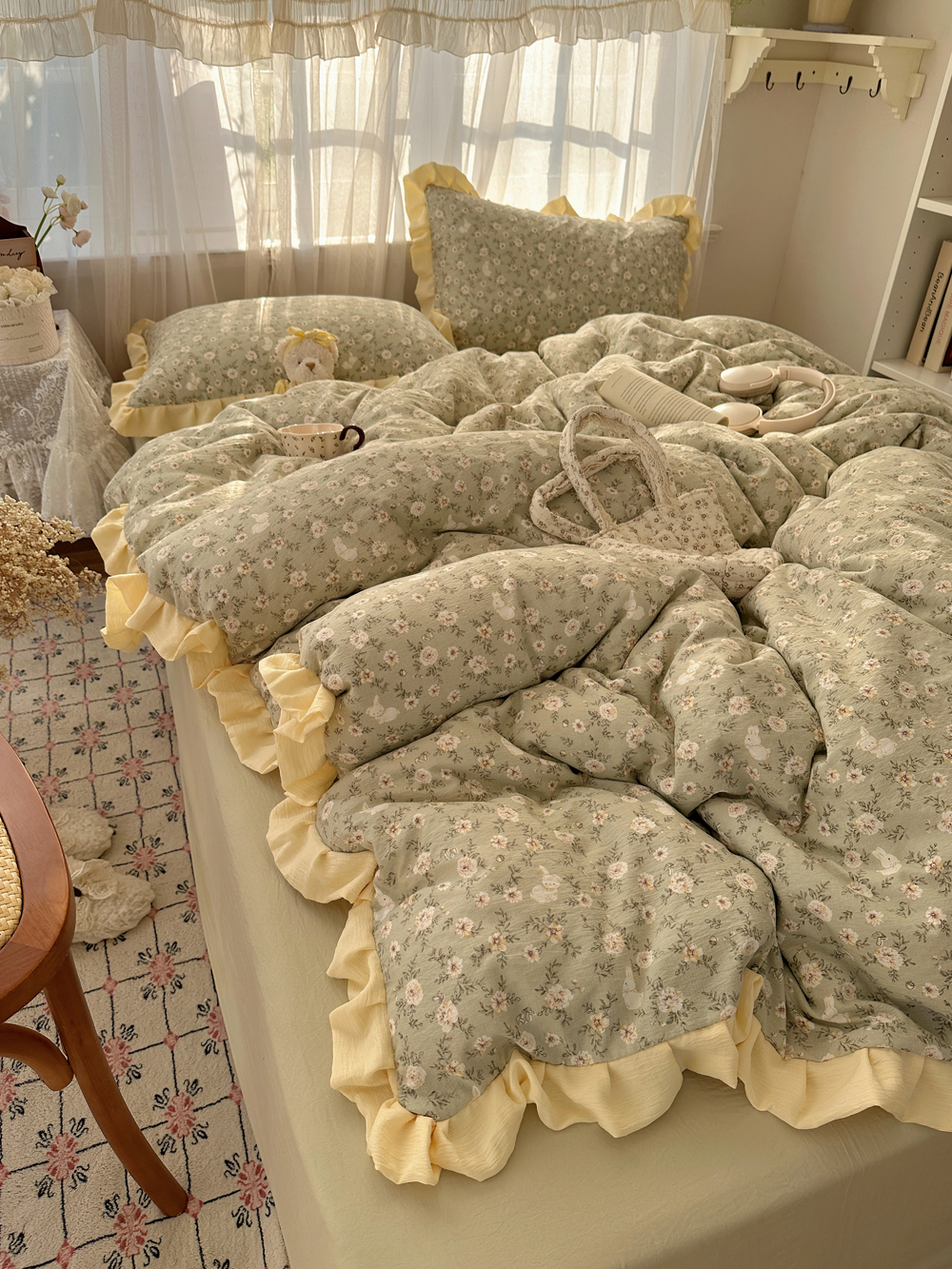 当前位置: 91家纺网 > 商品网购 > 床品套件 > 四件套 > 双层纱四件套 > 顾里家纺 2025新款韩系花边皱皱纱四件套 紫樱兔
