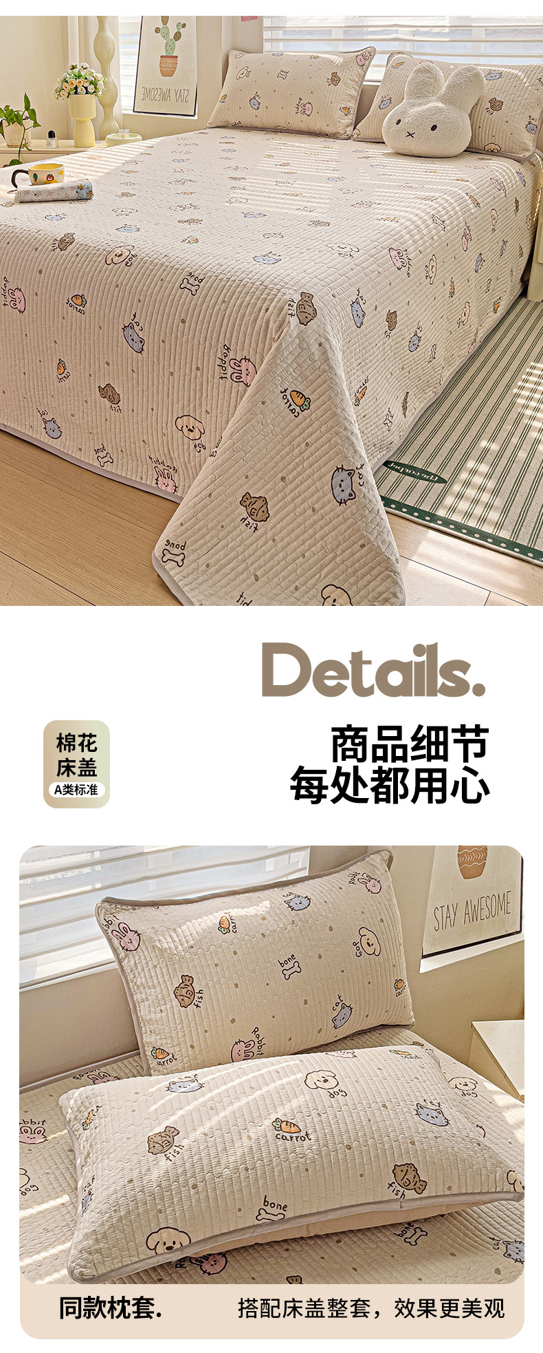 暖萌 2025新款A类全棉棉花床盖印花三件套 宠物时间-米
