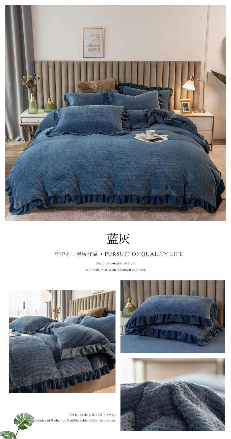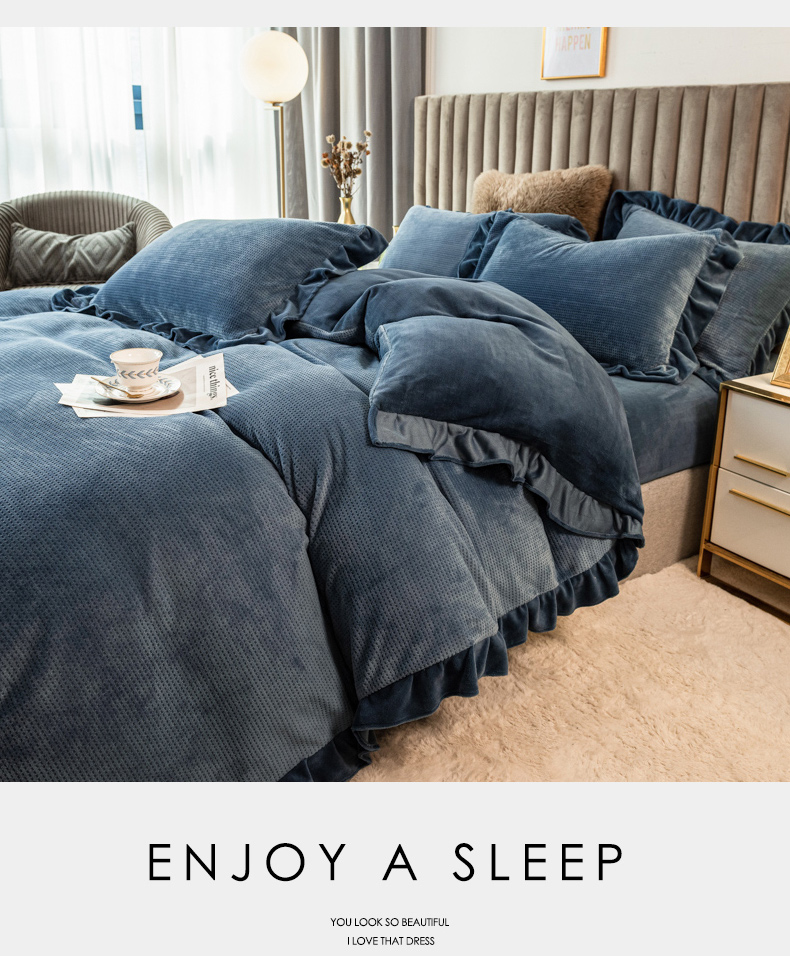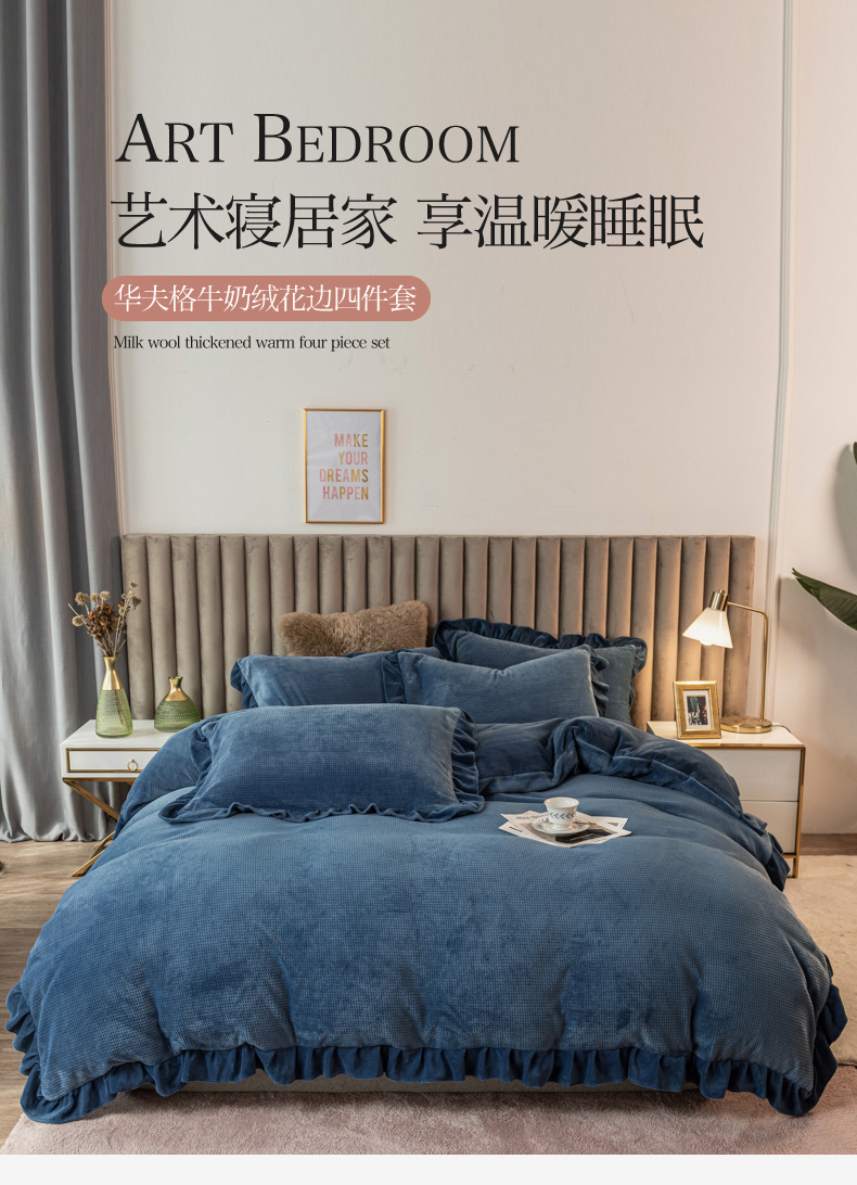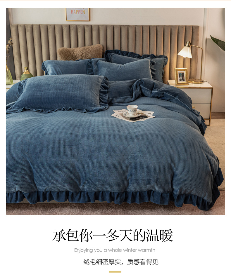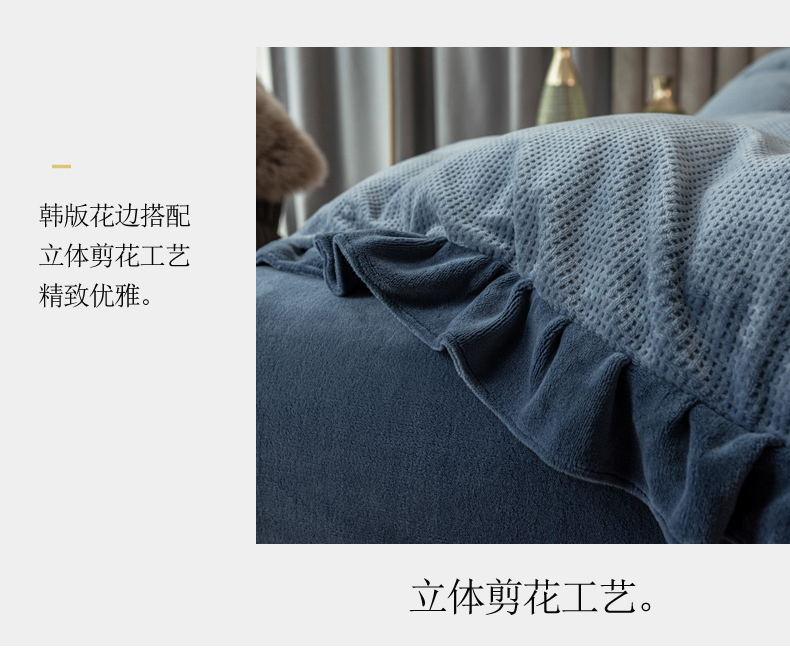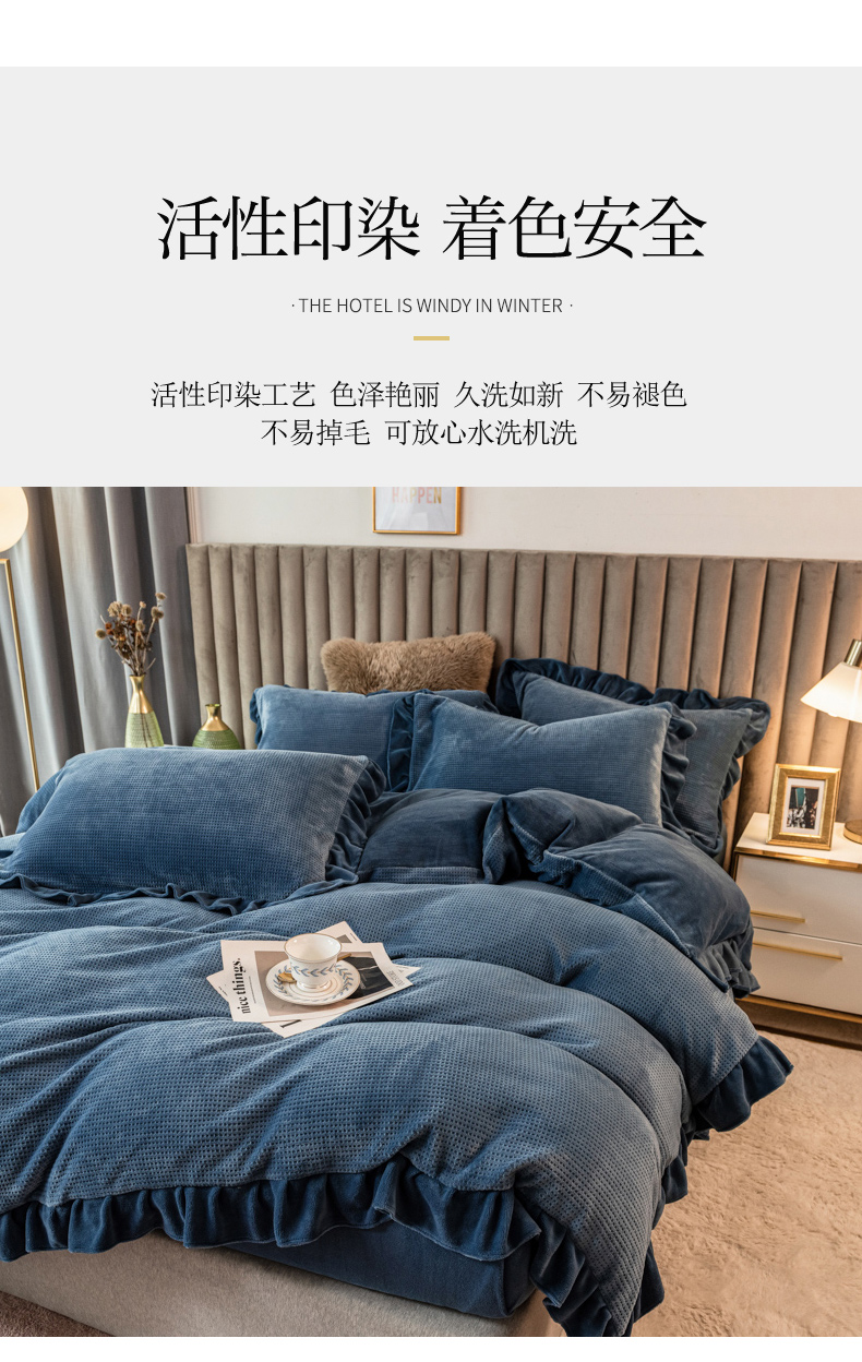 当前位置: 91家纺网 > 商品网购 > 床品套件 > 四件套 > 牛奶绒四件套 > 印季家纺 2025新款华夫格牛奶绒花边四件套 蓝灰