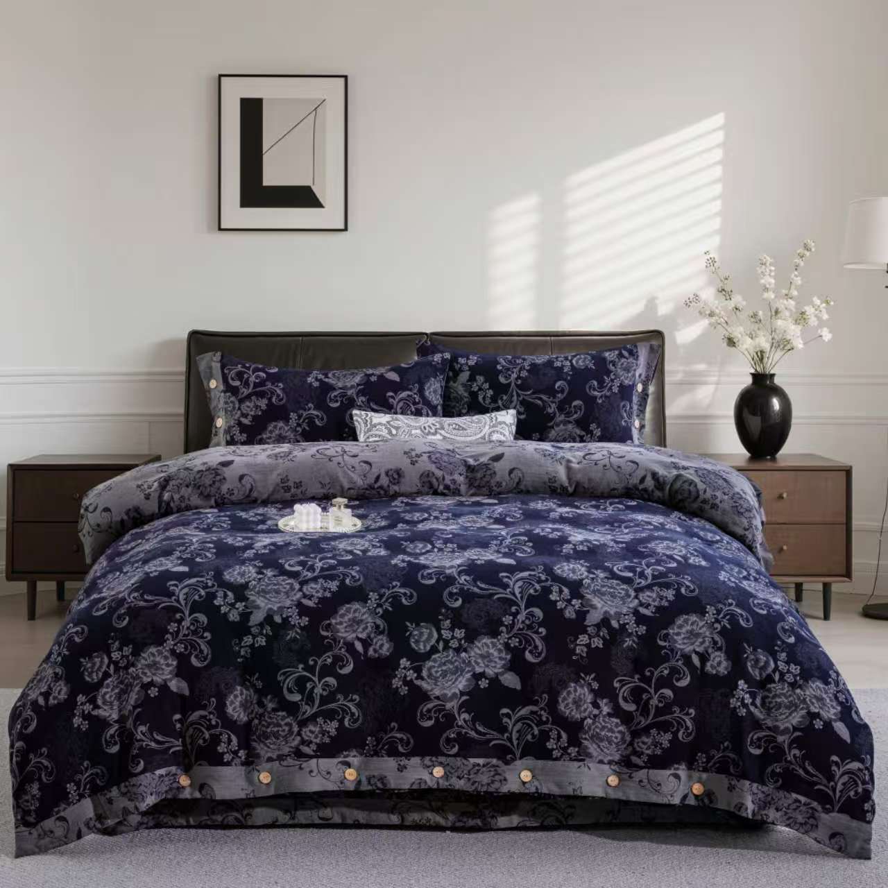 商品名称:双层纱家居 2025新款纯棉双层纱纽扣款四件套 凤尾花