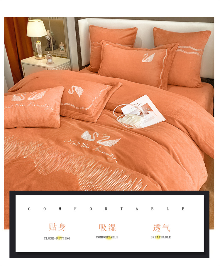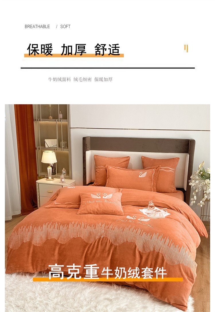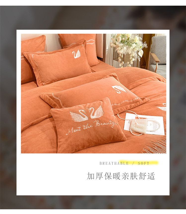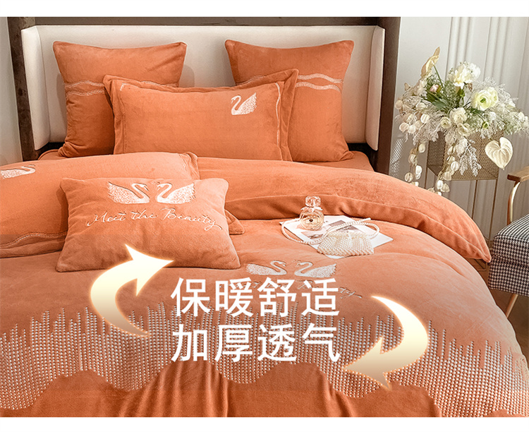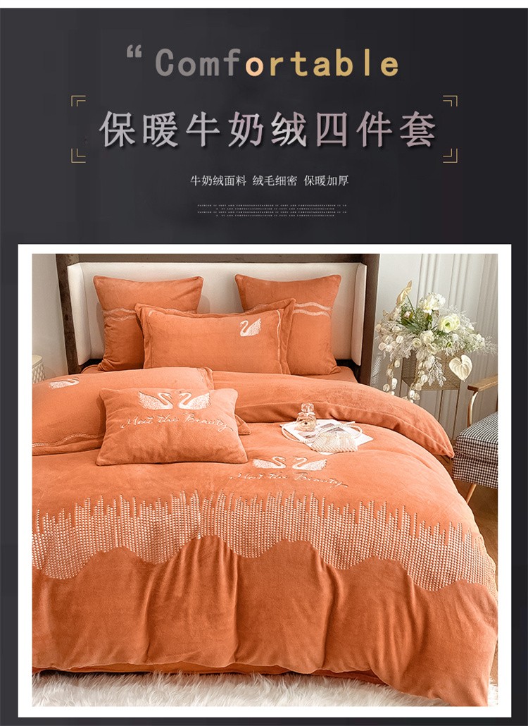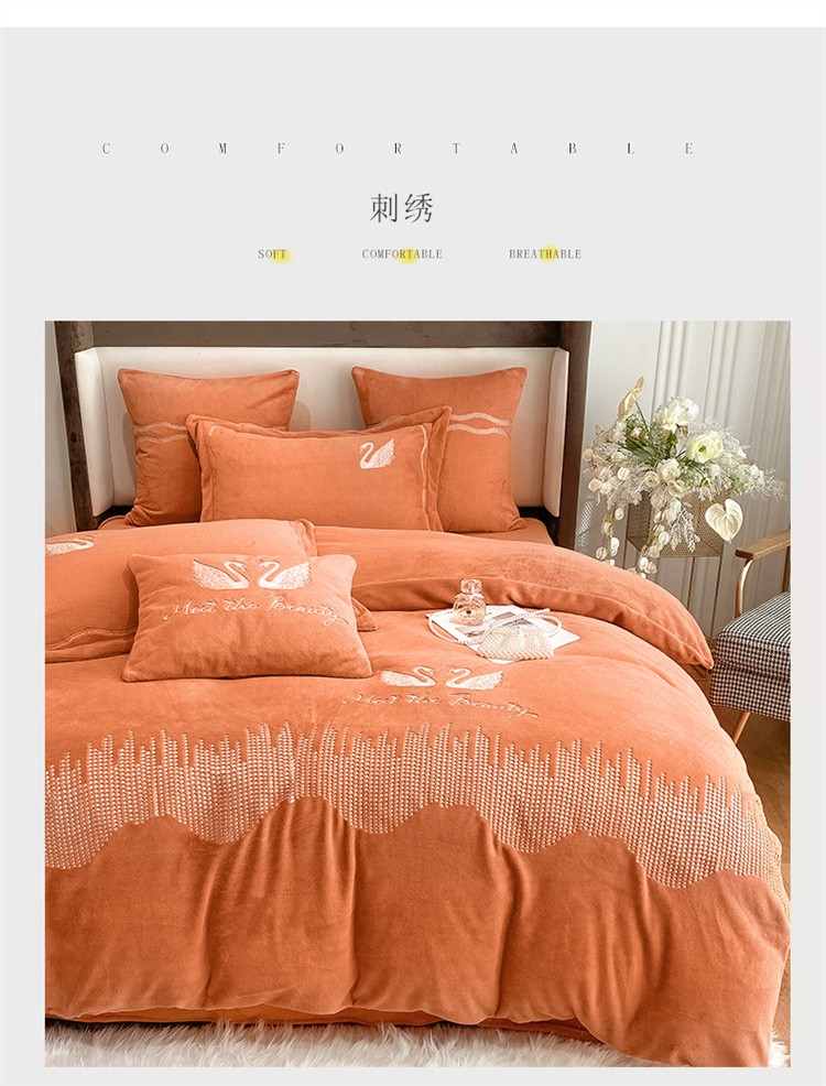 商品名称:安妮 2021新款高克重牛奶绒刺绣四件套-施华洛 南瓜橘