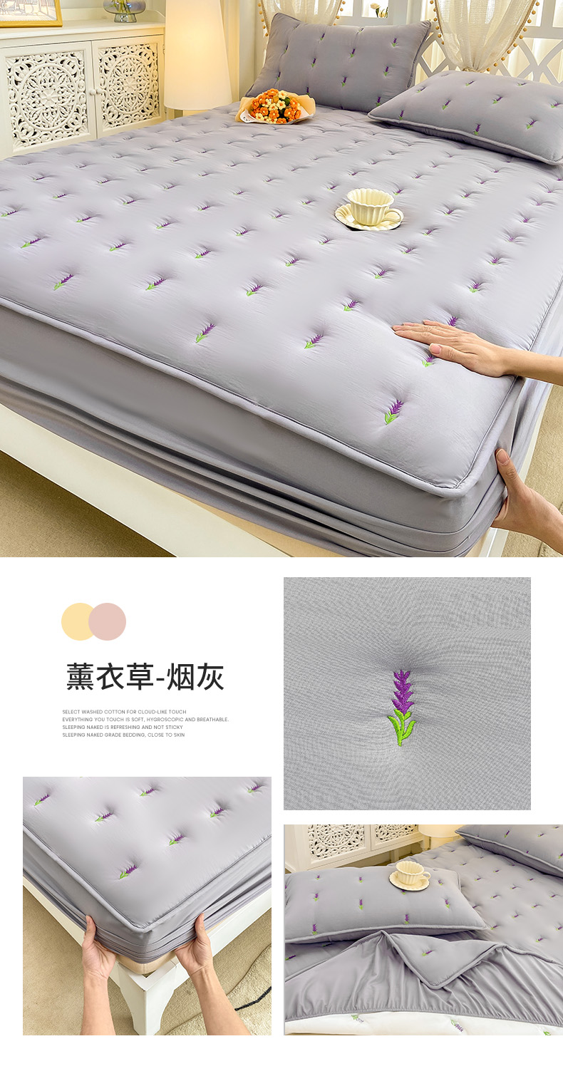 安逸恋 2024新款A类水洗棉大豆刺绣绣花床褥式夹棉床笠 薰衣草-烟灰