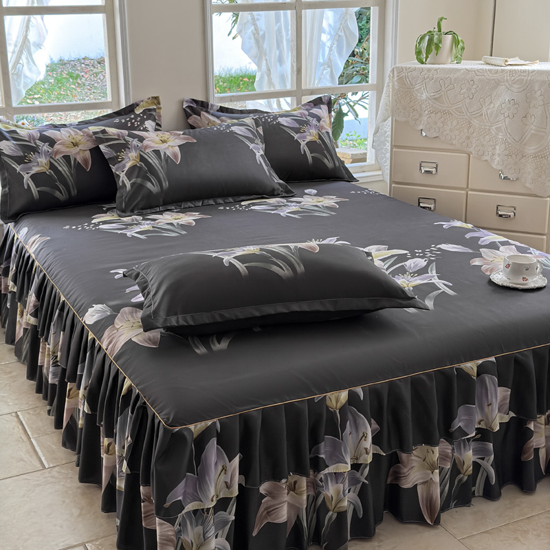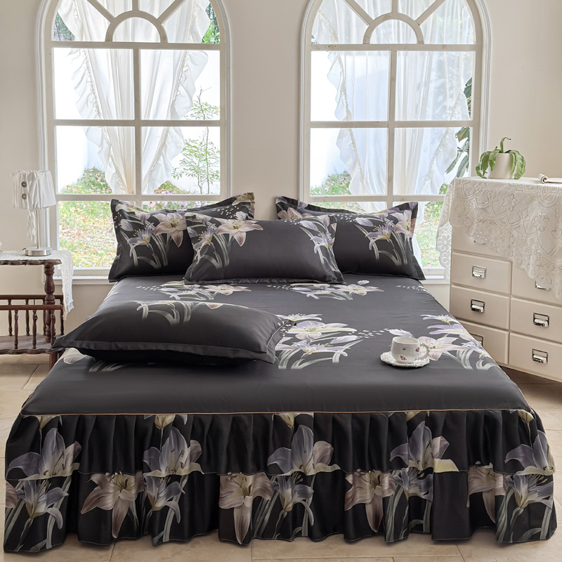 (总)雨田家纺 2025新款外贸跨境直播亲肤印花床裙三件套,百合花,柔情似水,鲜花盛开,向阳而生,罗卡娜,生如花夏灰