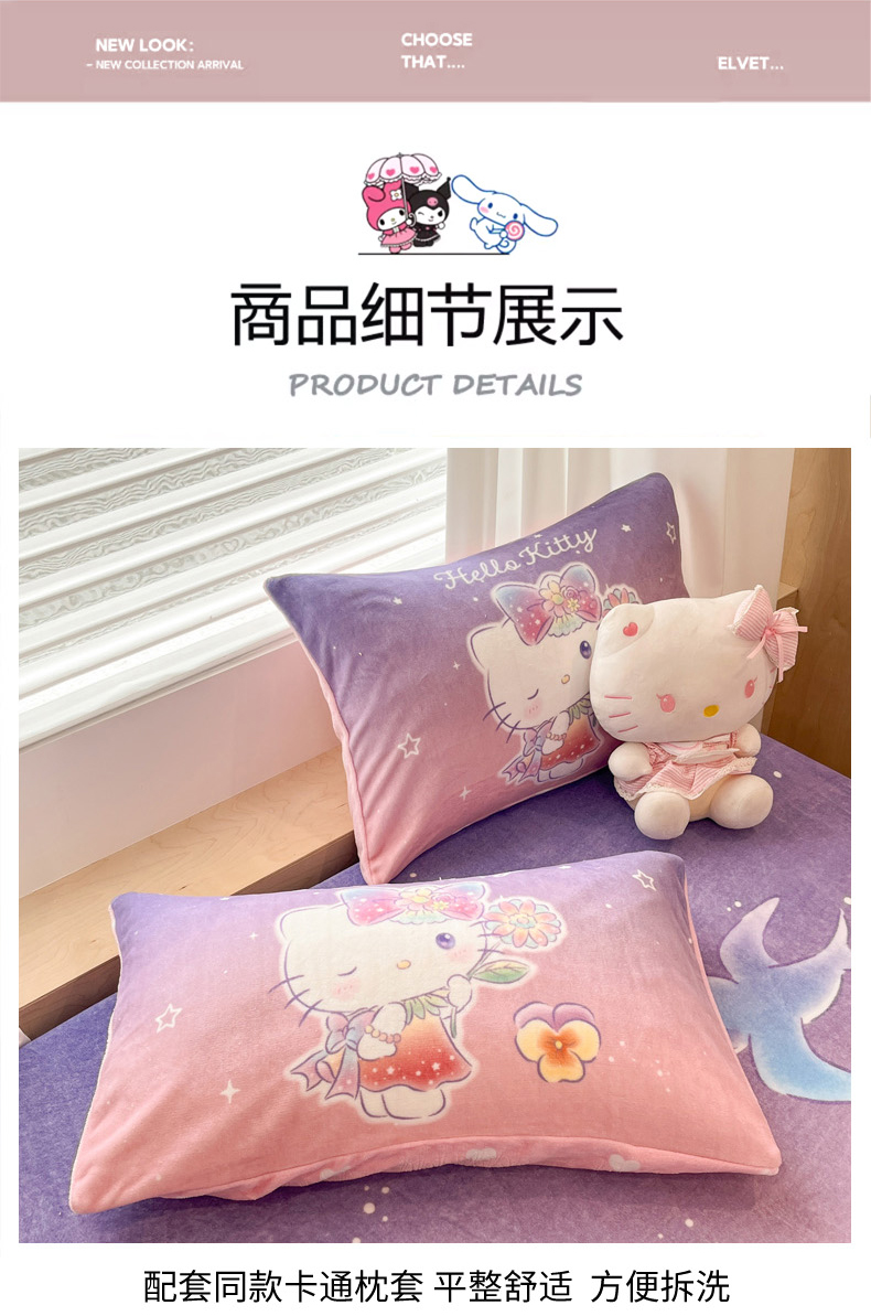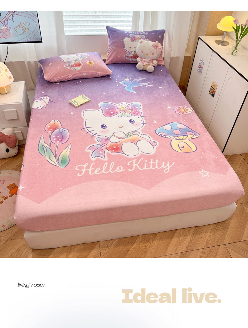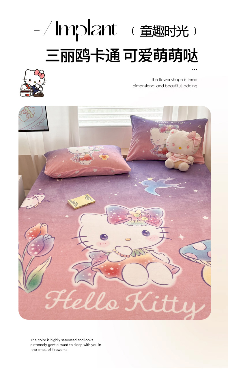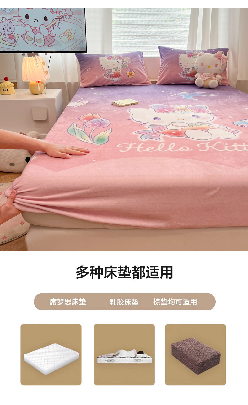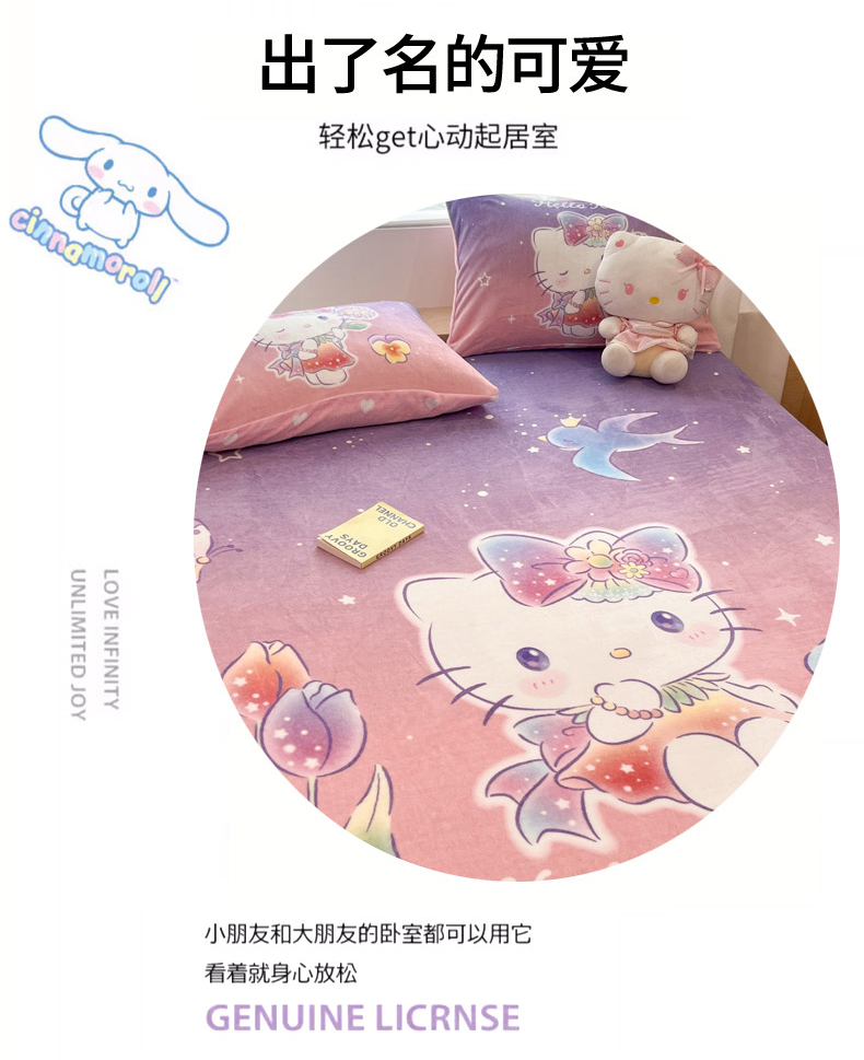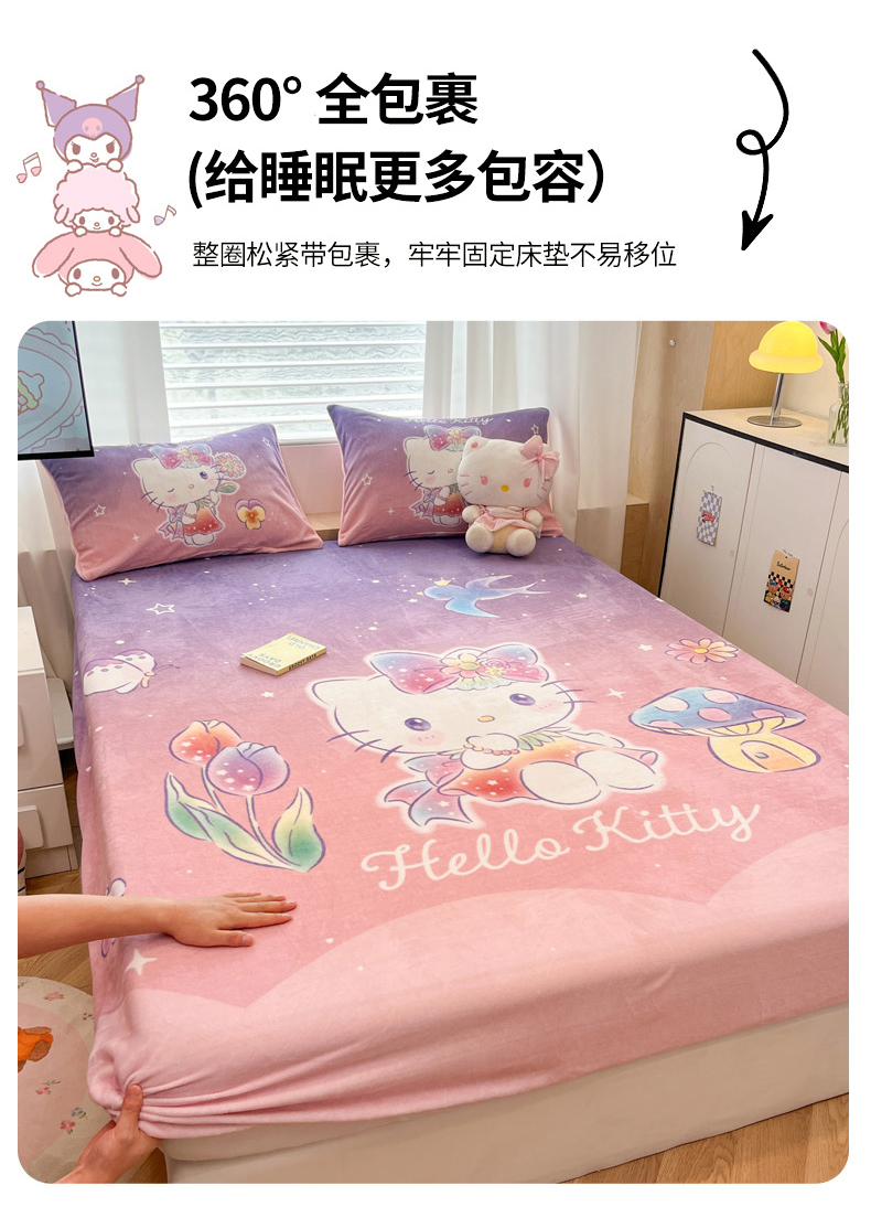 商品名称:暮思家居 2025新款正版授权三丽鸥大版牛奶绒数码印花单品床笠单件床笠(带标价格) 绒A版-梦幻KT