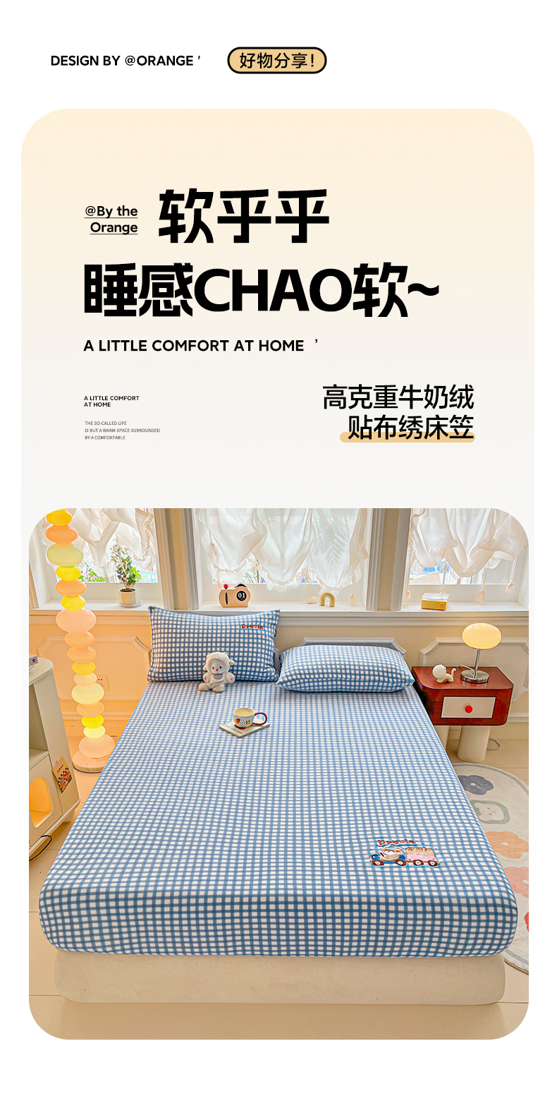 商品名称:乐美家纺 2025新款A类高克重贴布绣牛奶绒床笠三件套 面包熊