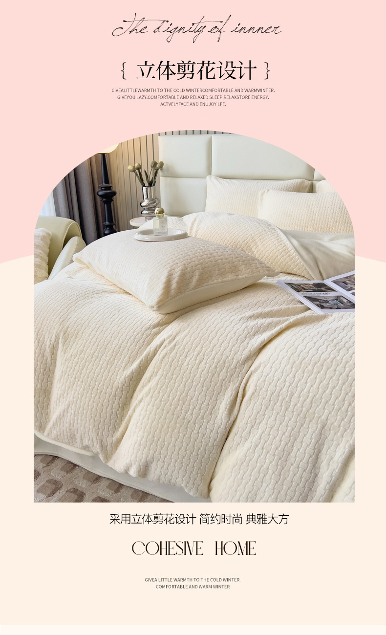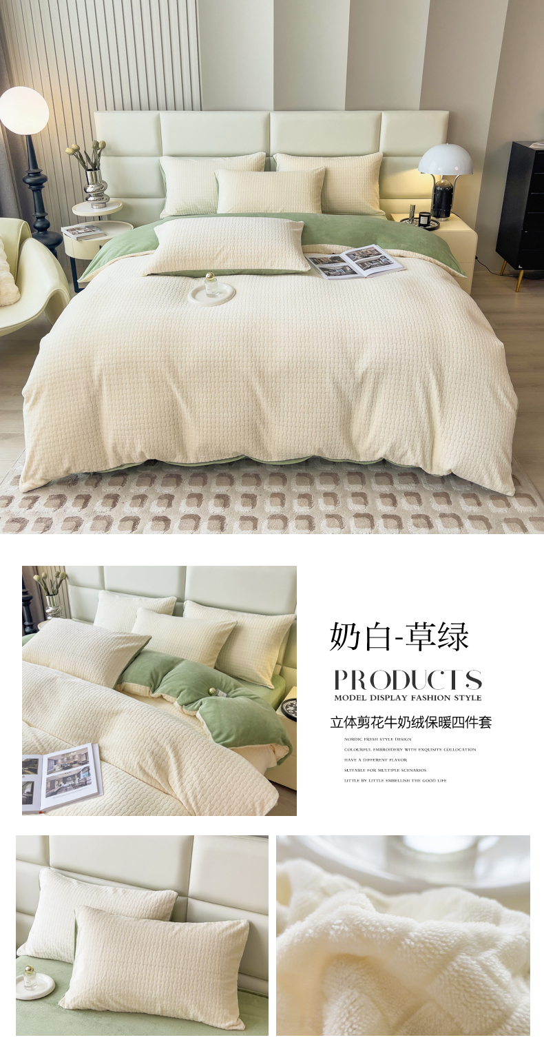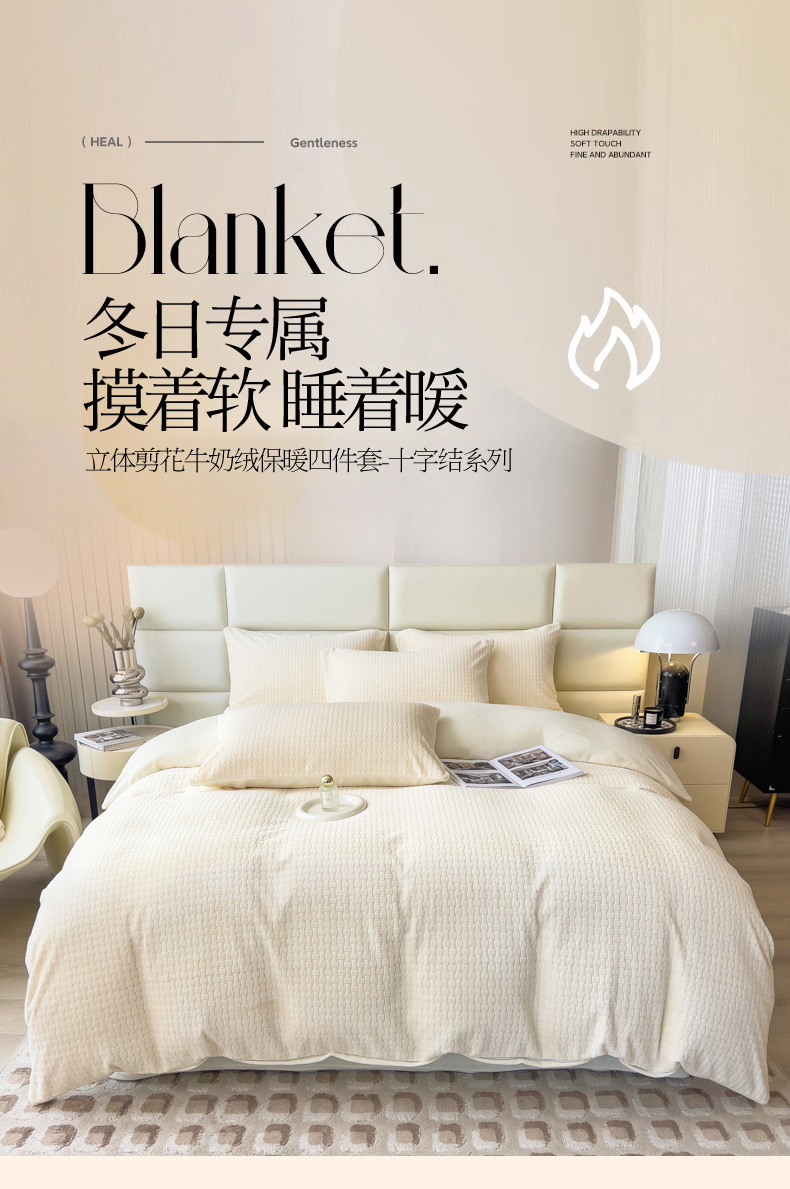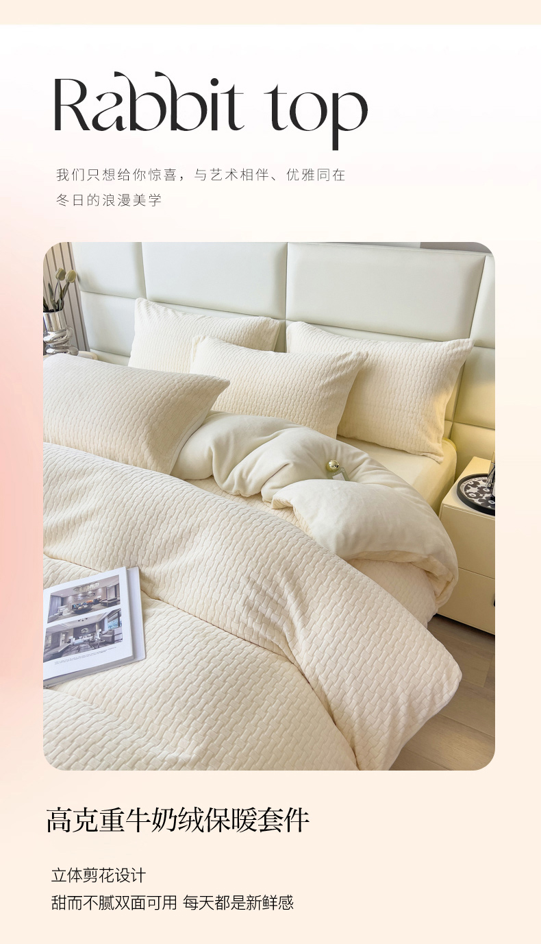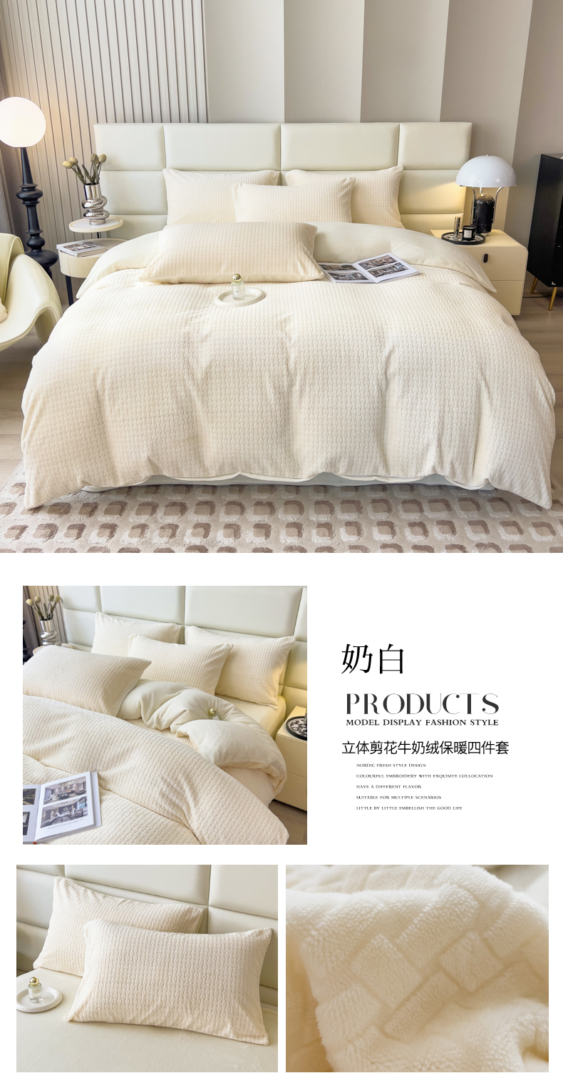 当前位置: 91家纺网 > 商品网购 > 床品套件 > 四件套 > 牛奶绒四件套 > 印季家纺 2025新款立体剪花十字结牛奶绒四件套 奶白