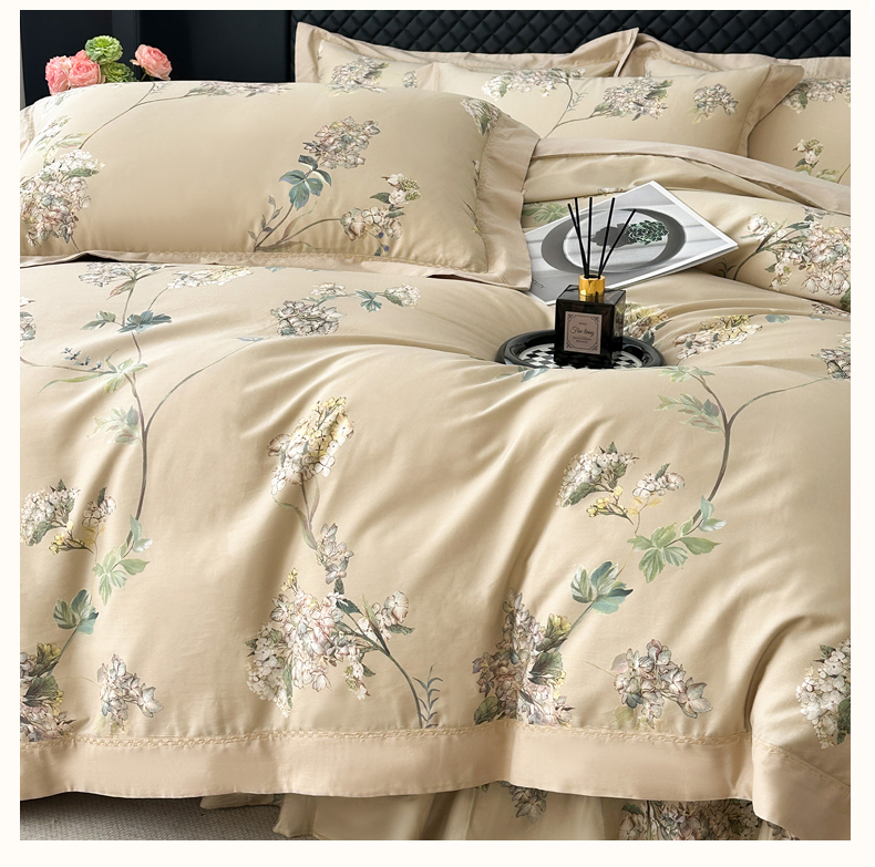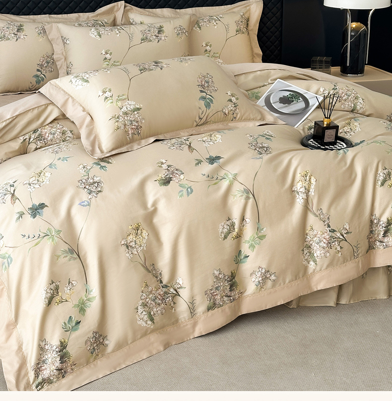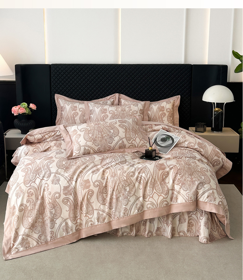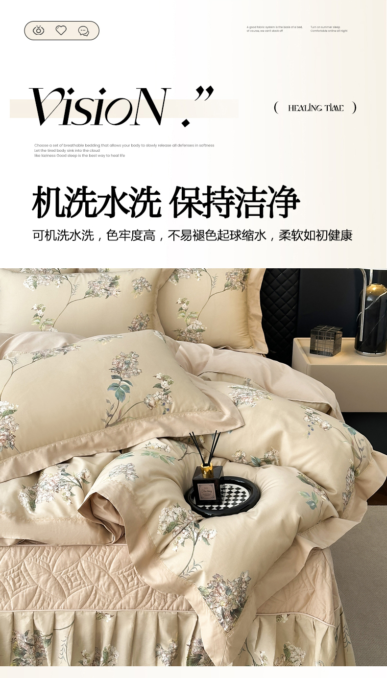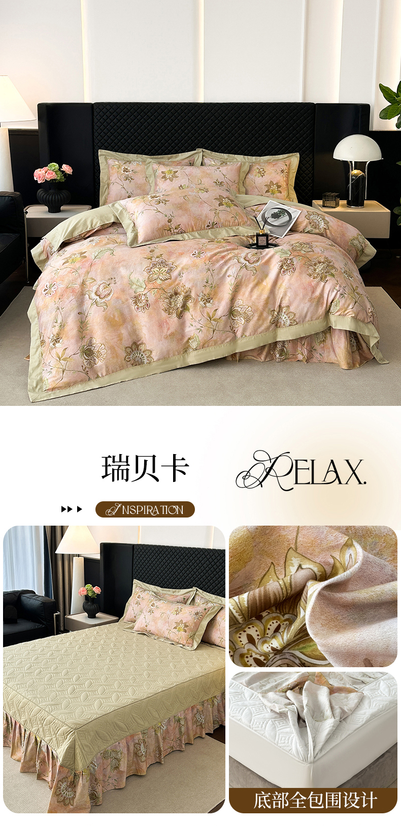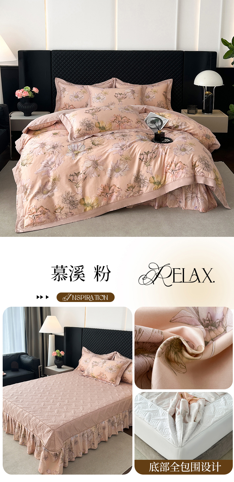 福丽莱家纺 2025新款高端60纯棉数码印花夹棉床裙四件套 慕溪-粉
