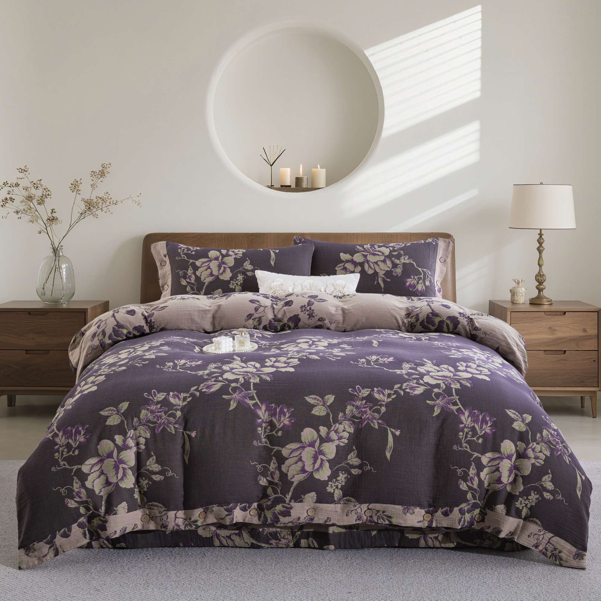 商品名称:双层纱家居 2025新款纯棉双层纱纽扣款四件套 黑茶