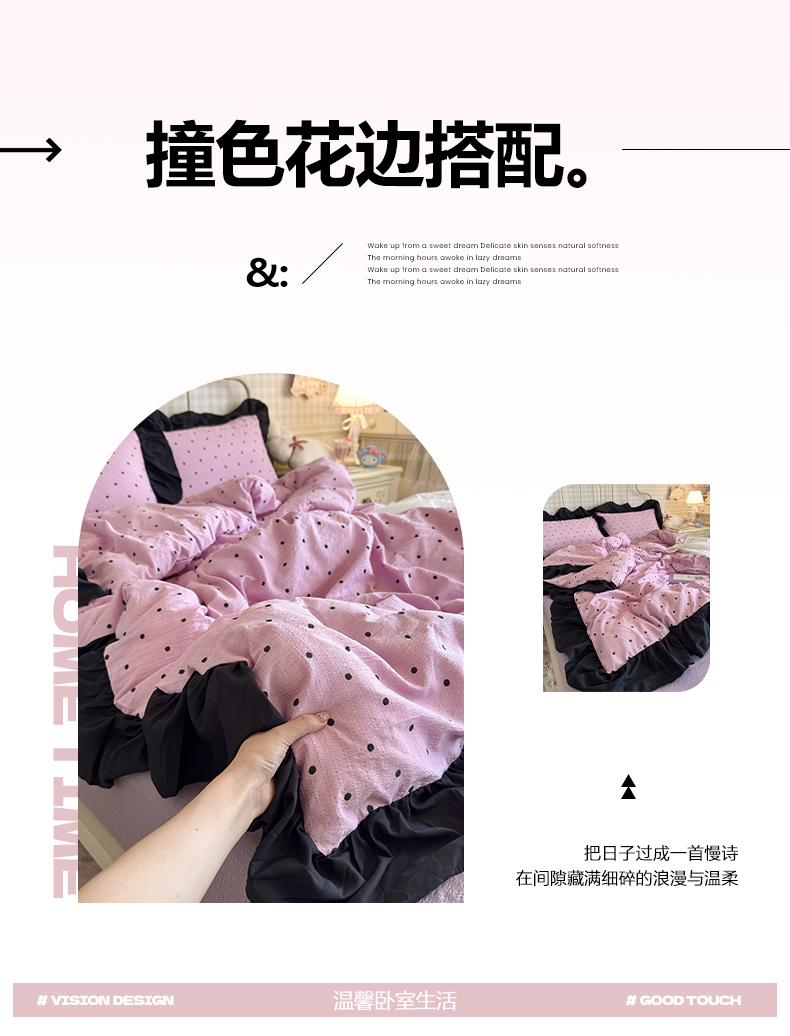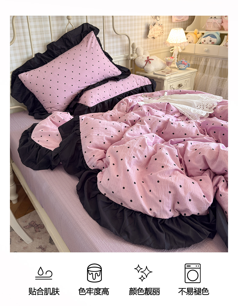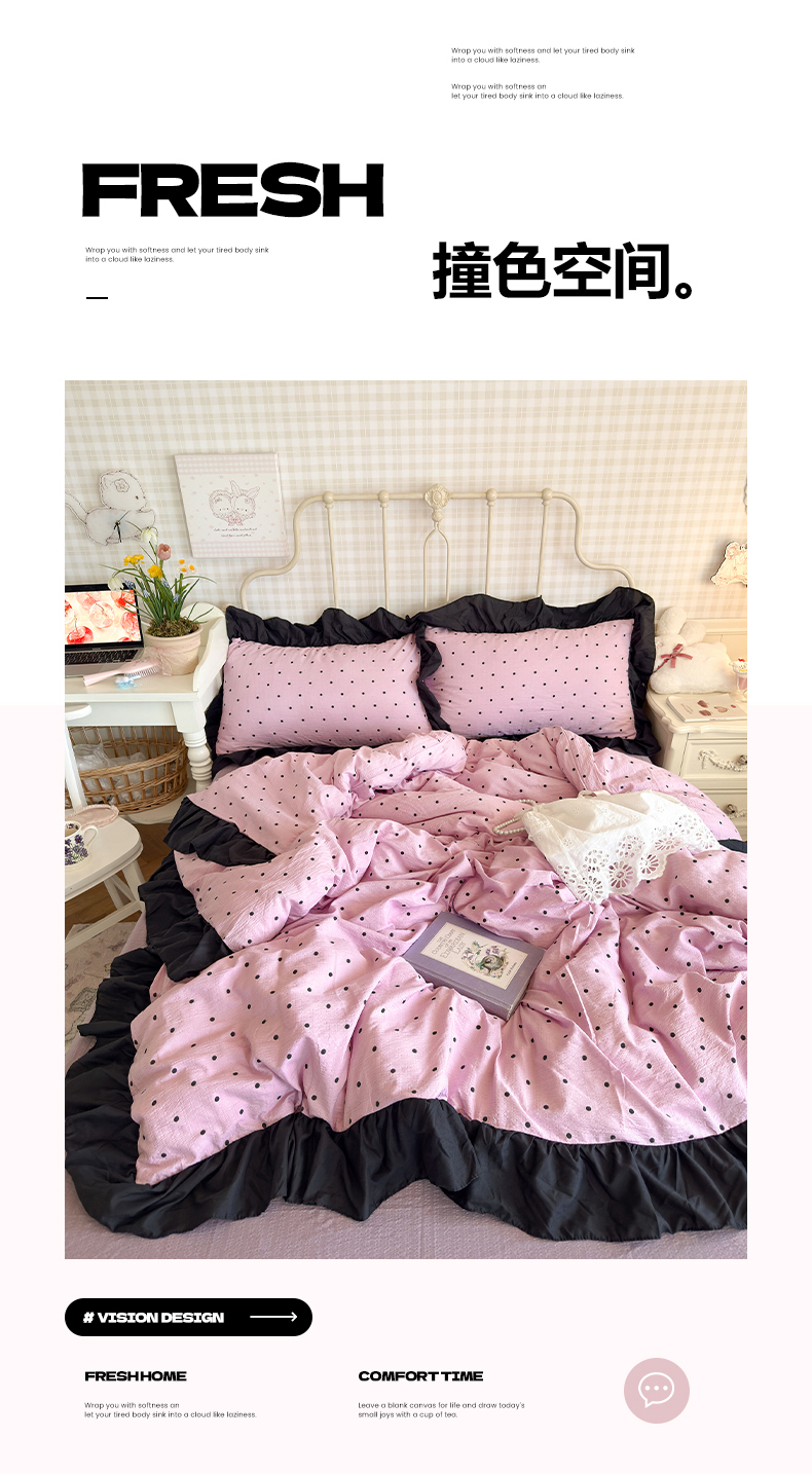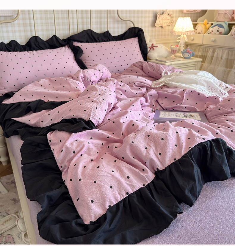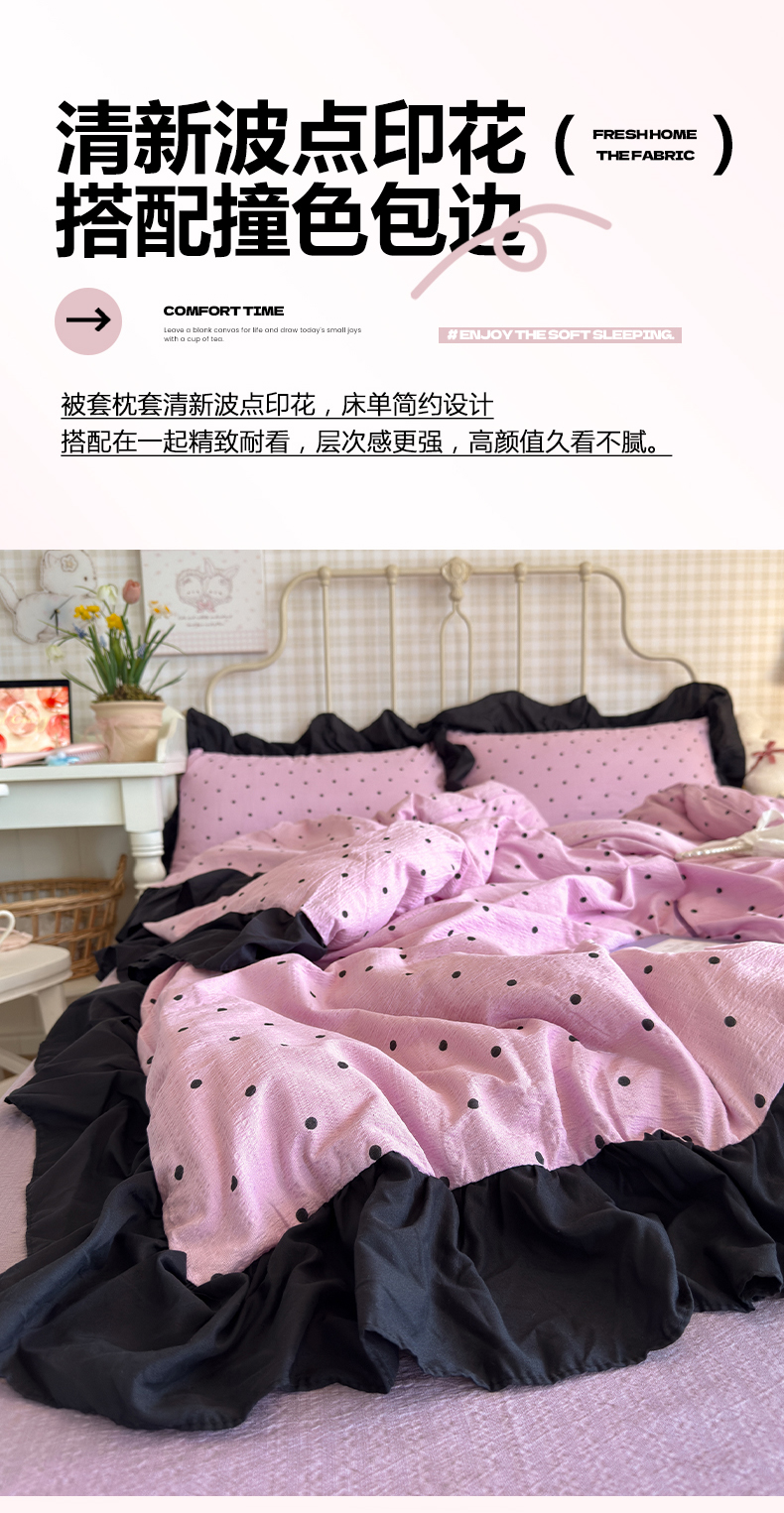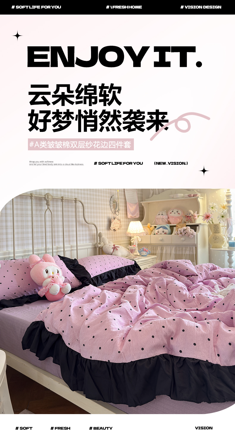当前位置: 91家纺网 > 商品网购 > 床品套件 > 四件套 > 双层纱四件套 > 优卡迪家纺馆 2026新款皱皱棉双层纱黑花边四件套下载文件包含买家秀 波点生活-紫