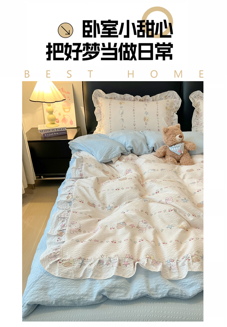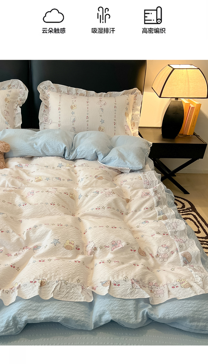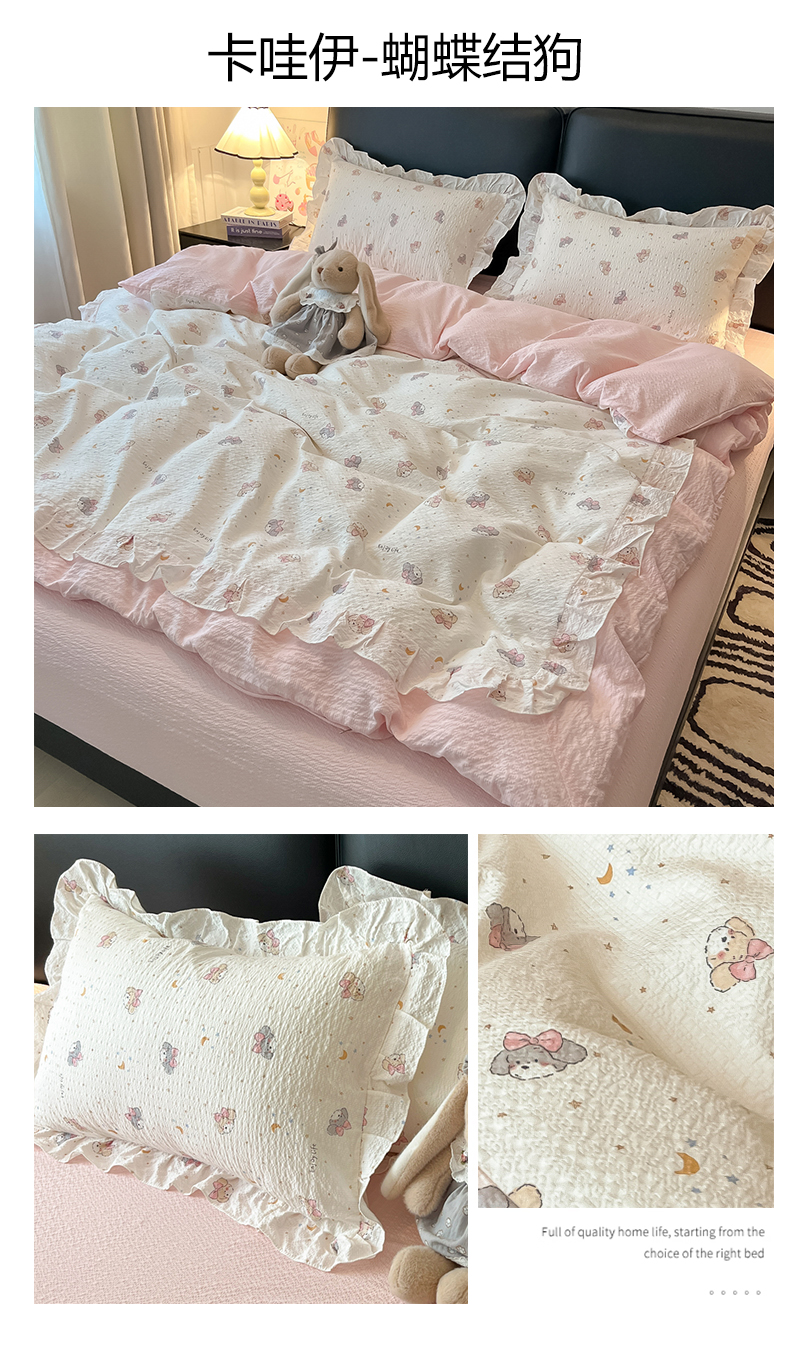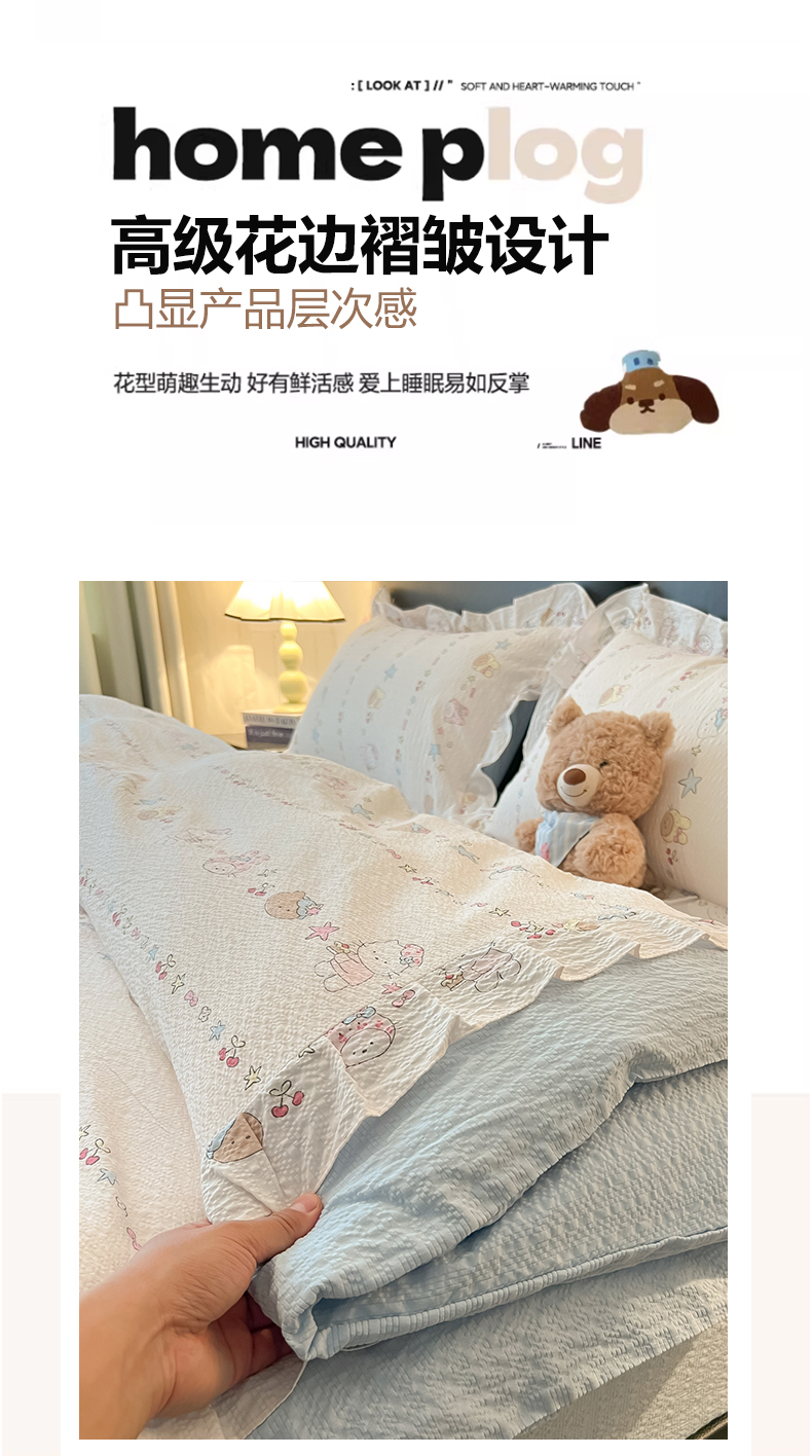 当前位置: 91家纺网 > 商品网购 > 床品套件 > 四件套 > 其它四件套 > 子钦家纺 2026春夏新款提花泡芙棉花边拼角工艺床单床笠四件套-卡哇伊 卡哇伊-快乐家族