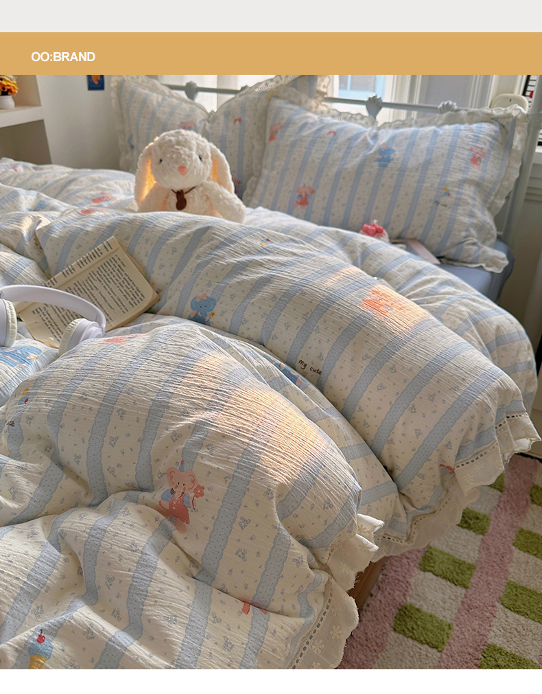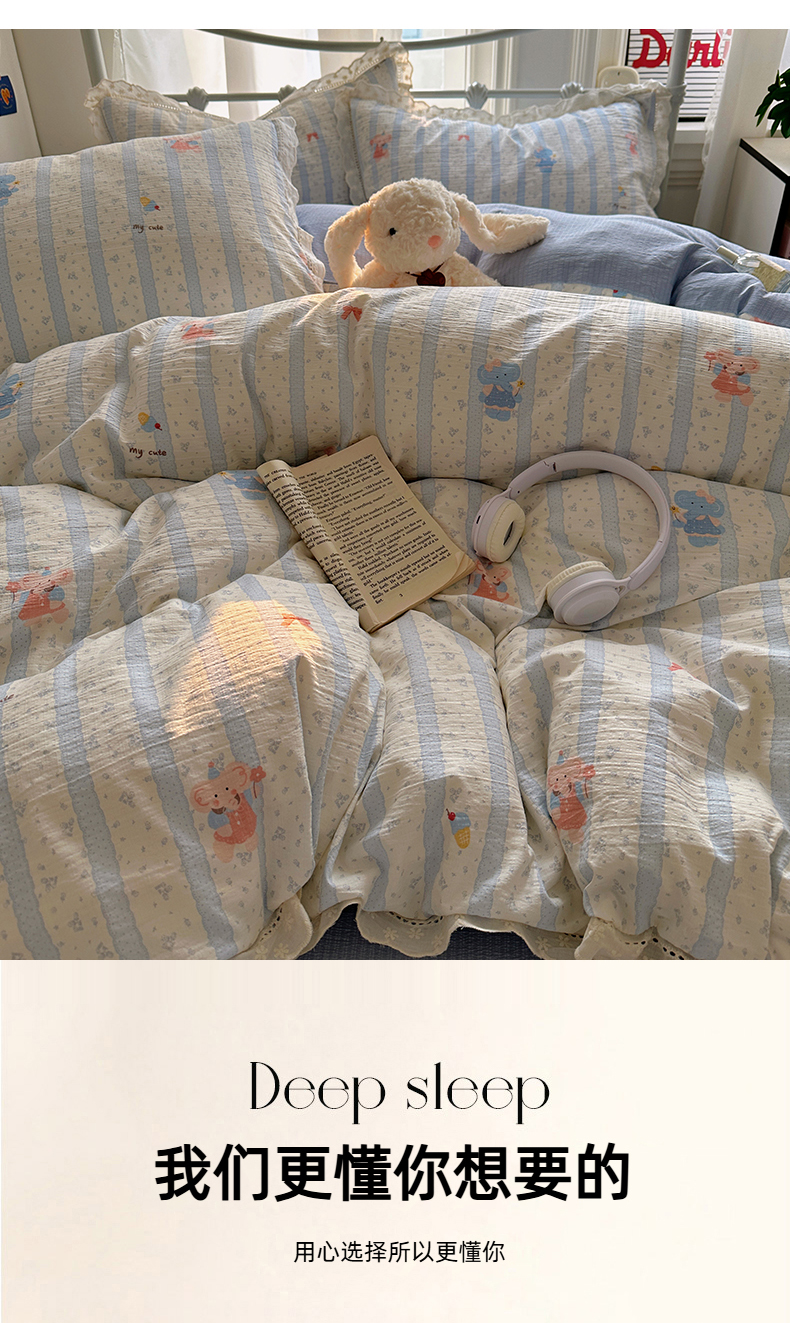 乐沐家纺 2025新款云感皱皱双层纱全棉镂空花边四件套 泡芙小象