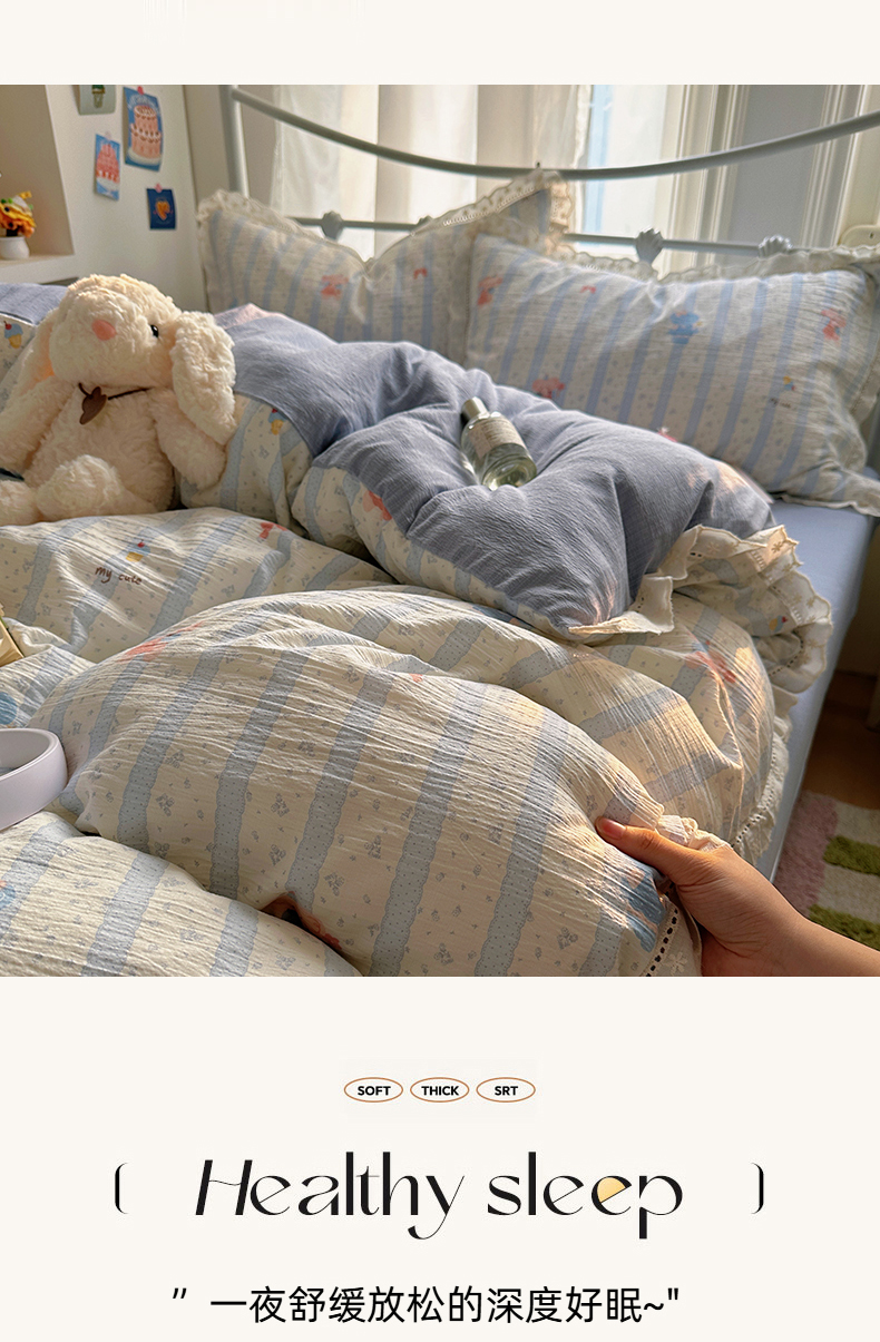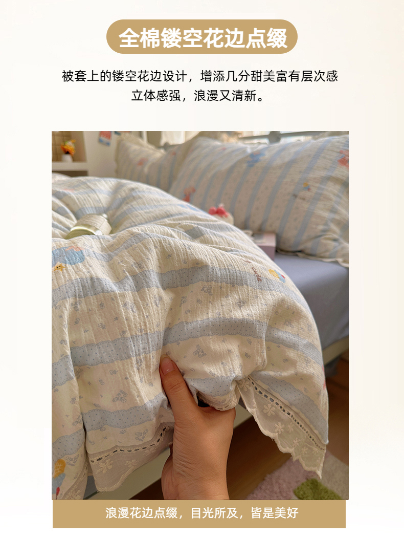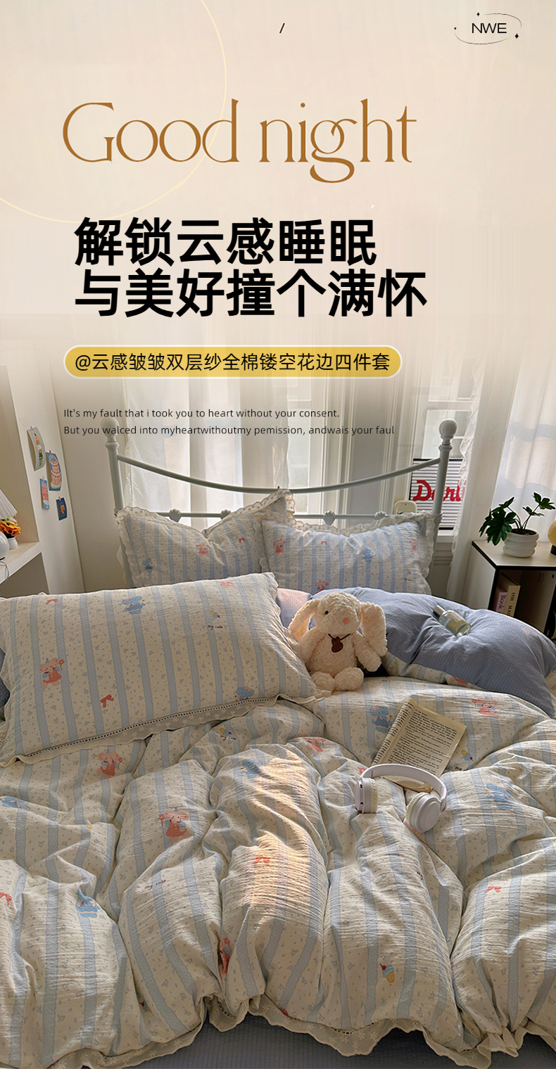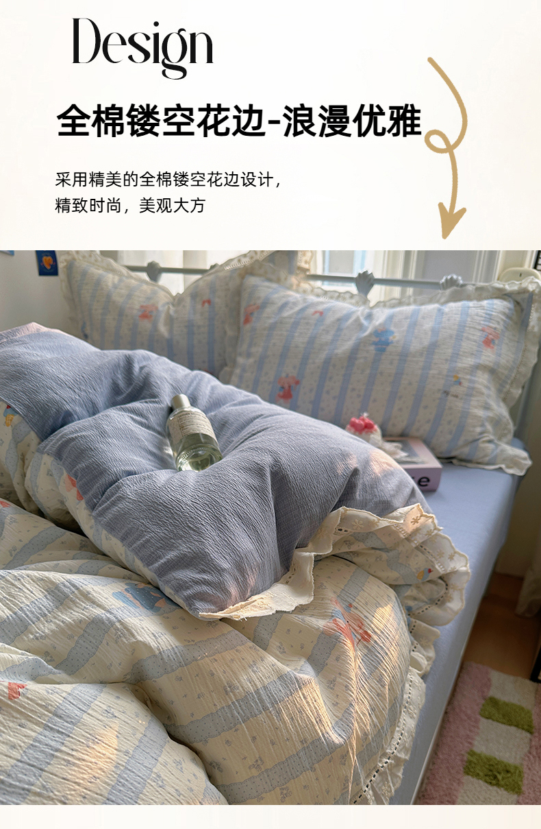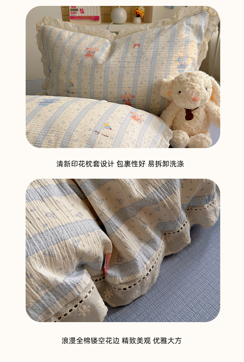 (总)乐沐家纺 2025新款云感皱皱双层纱全棉镂空花边四件套,草莓小兔,春日兔语,泡芙小象,倾心,素瑾,甜梦狗狗,夏日,织梦