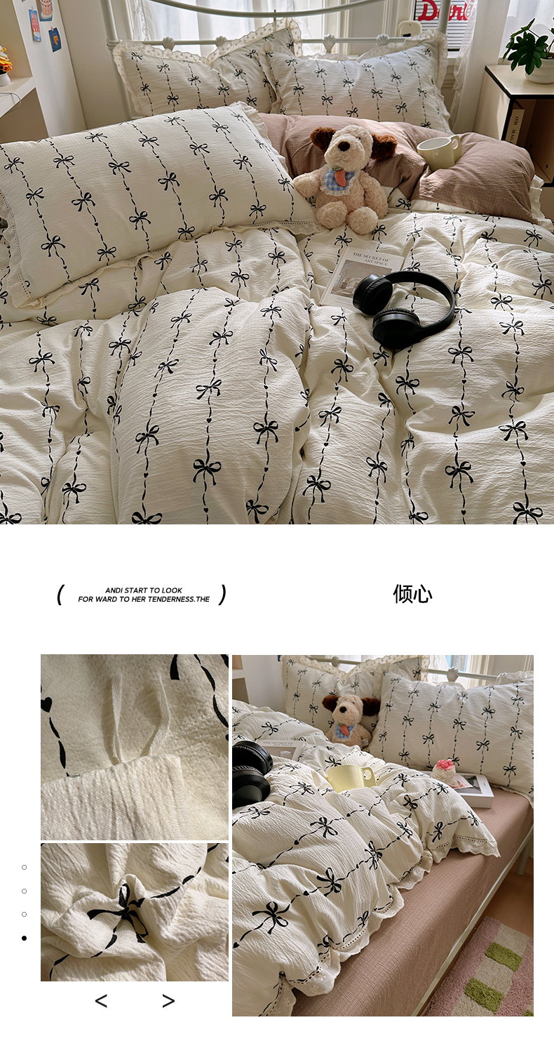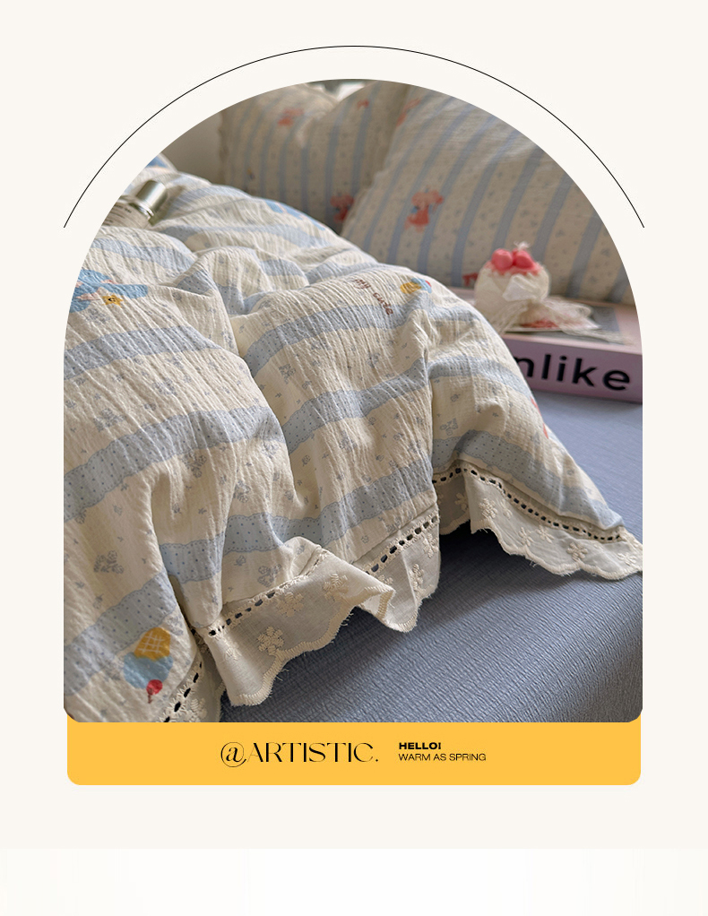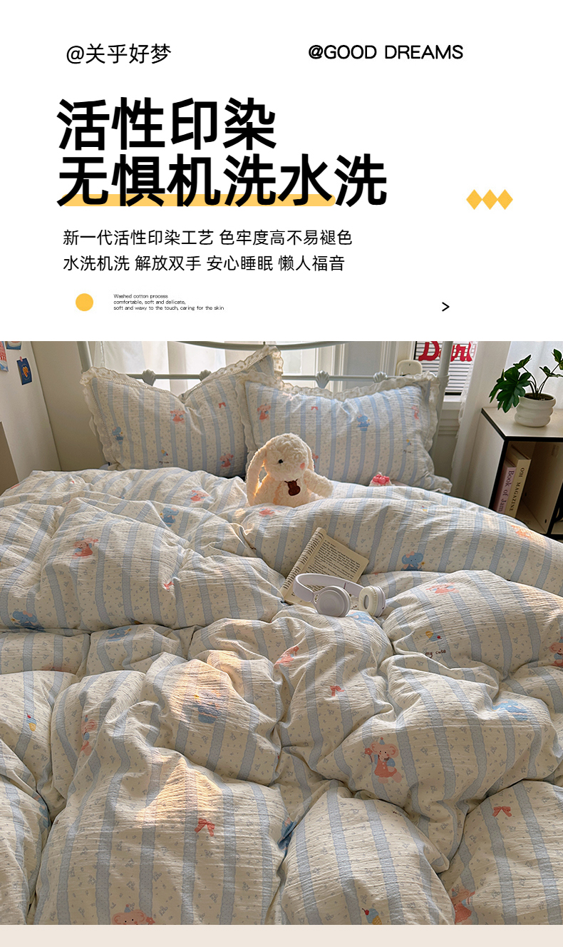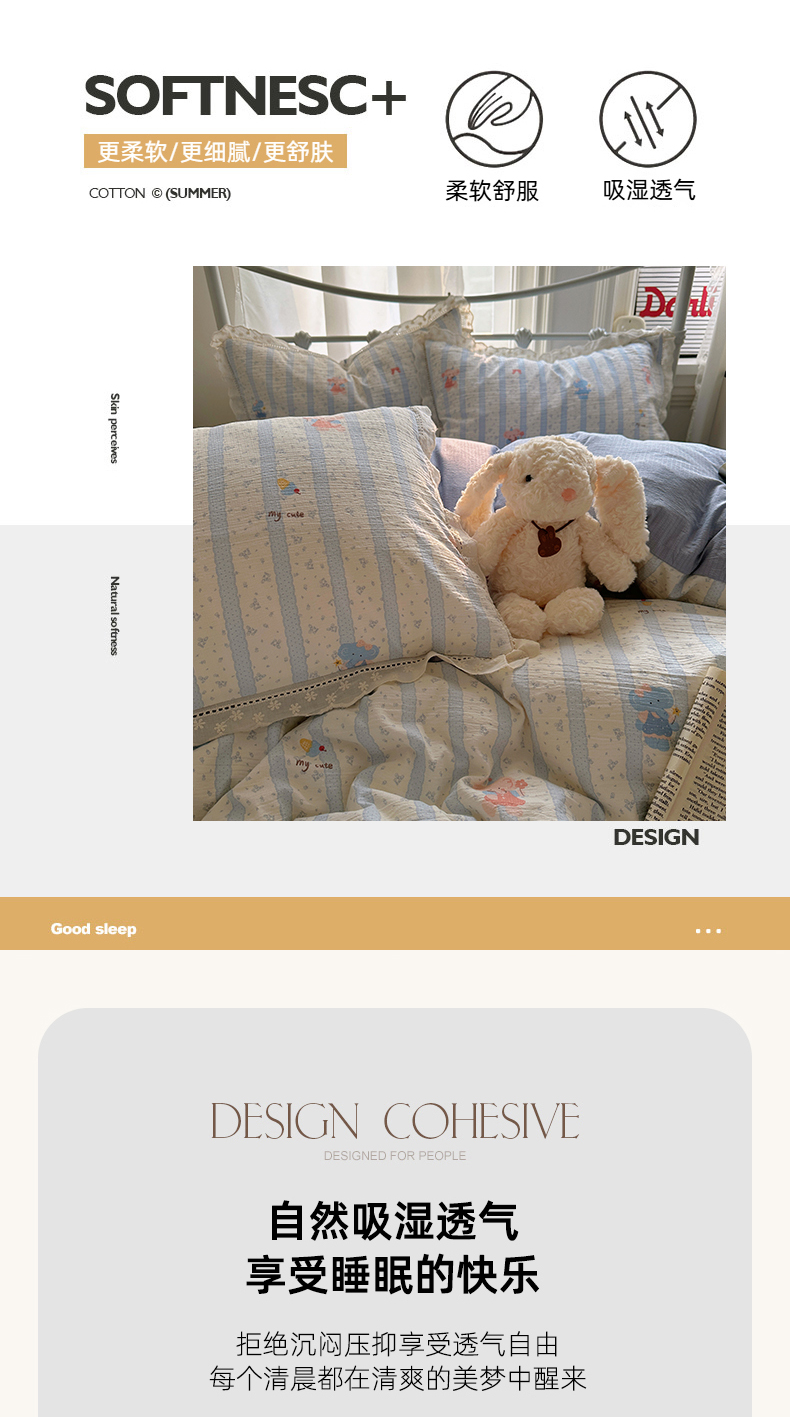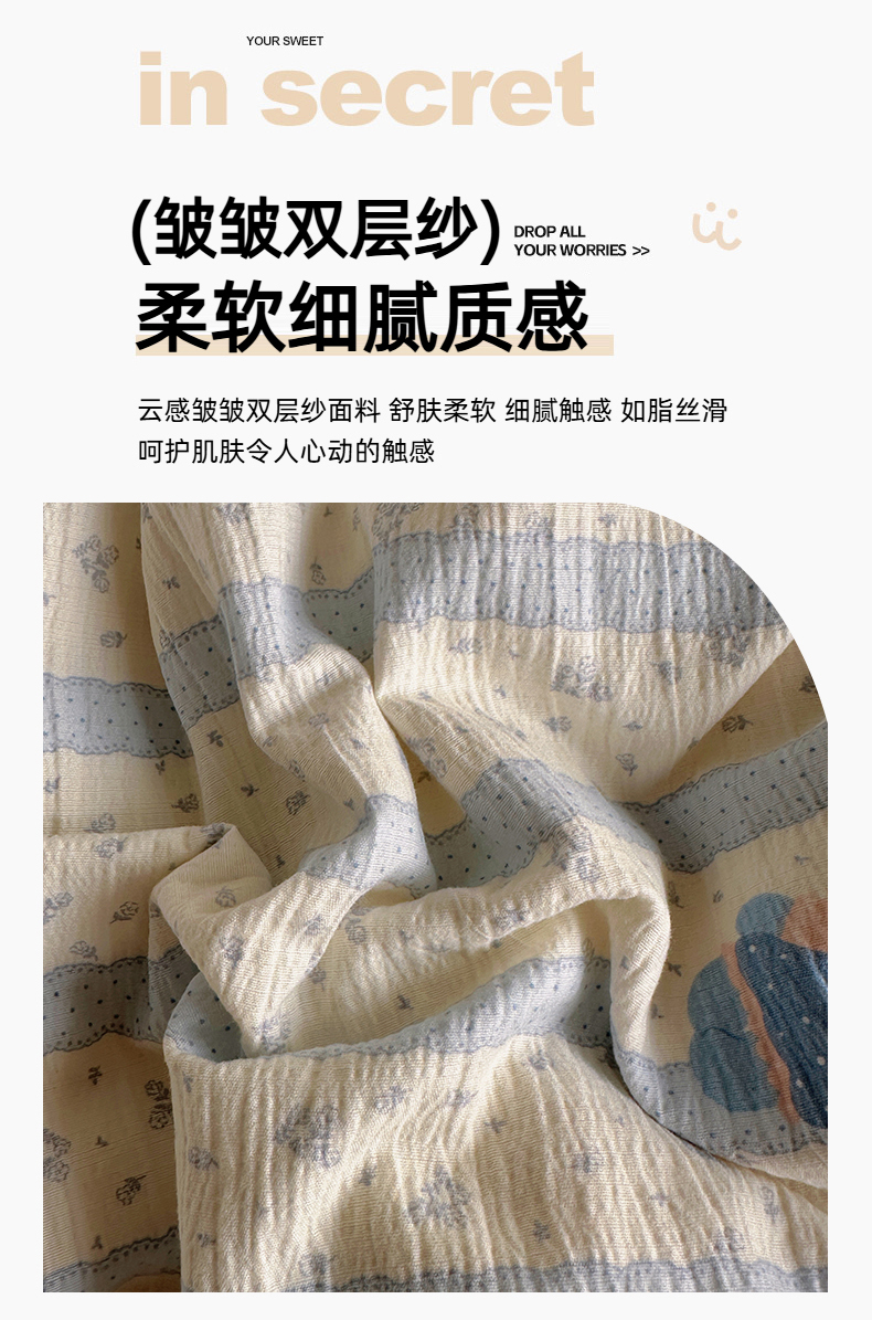 (总)乐沐家纺 2025新款云感皱皱双层纱全棉镂空花边四件套,草莓小兔,春日兔语,泡芙小象,倾心,素瑾,甜梦狗狗,夏日,织梦