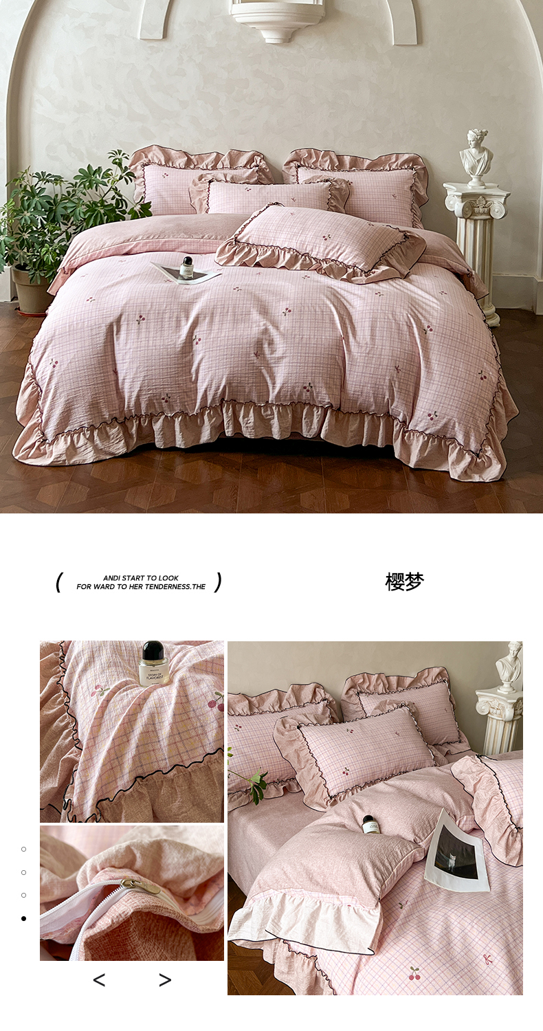 (总)乐沐家纺 2025新款云感皱皱双层纱全棉镂空花边四件套,草莓小兔,春日兔语,泡芙小象,倾心,素瑾,甜梦狗狗,夏日,织梦