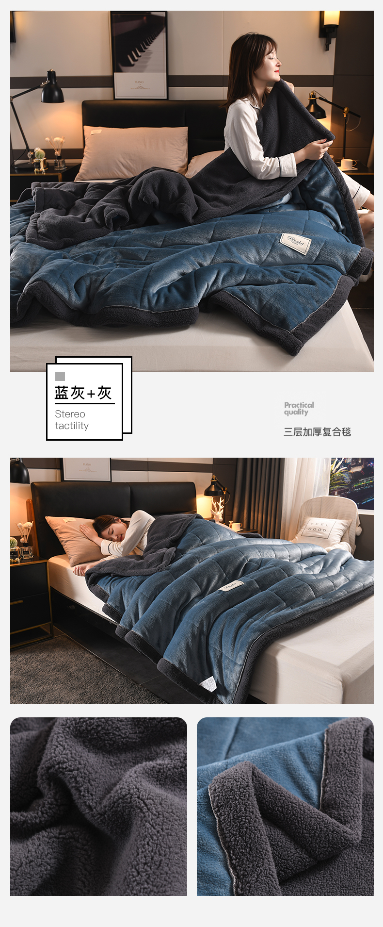 印季家纺 2025秋冬新款三层夹棉加厚复合羊羔绒毛毯毯子多功能盖毯 墨绿+白