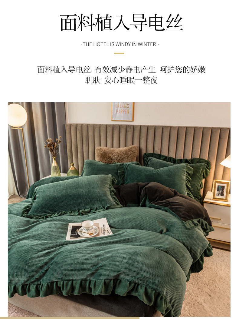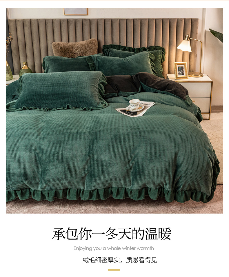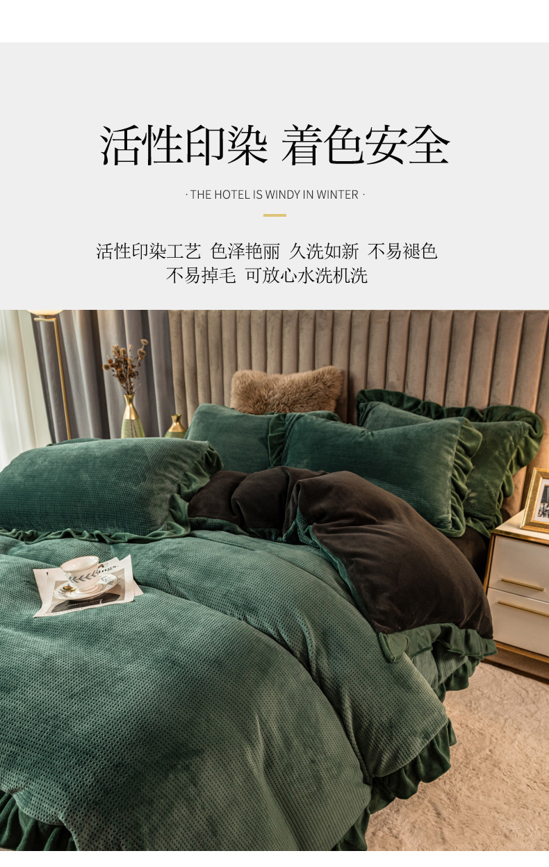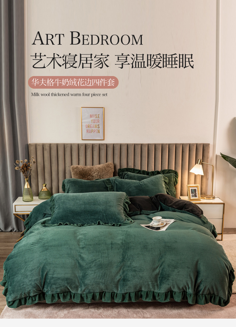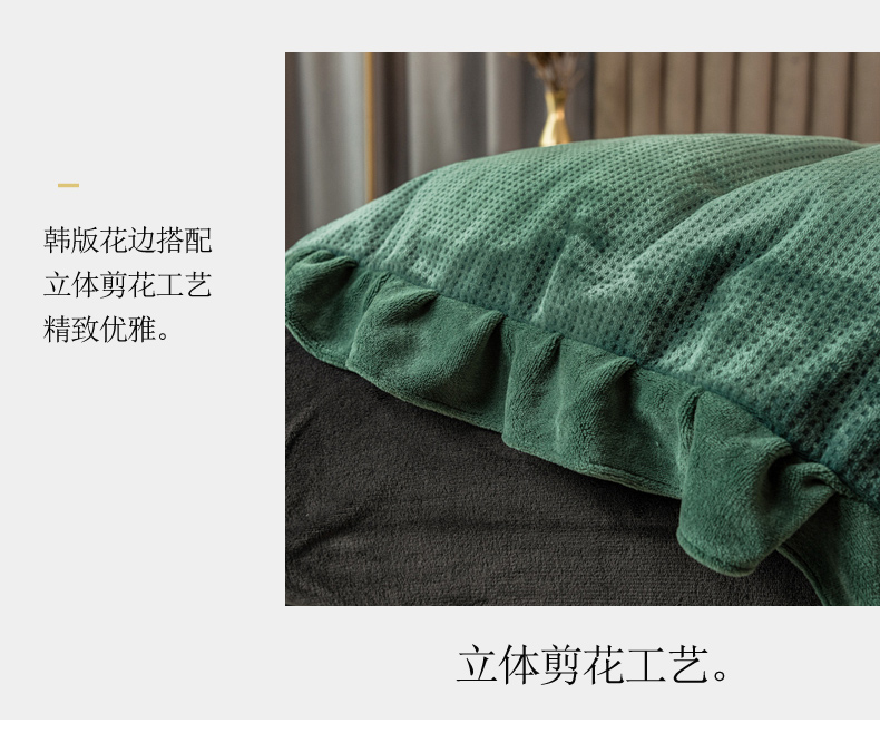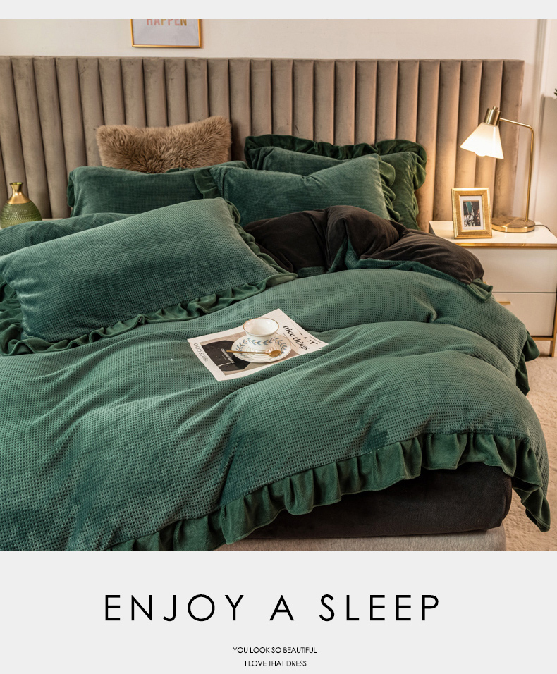 当前位置: 91家纺网 > 商品网购 > 床品套件 > 四件套 > 牛奶绒四件套 > 印季家纺 2025新款华夫格牛奶绒花边四件套 墨绿-灰