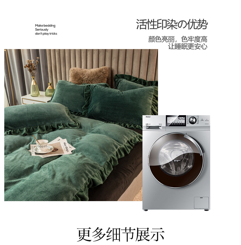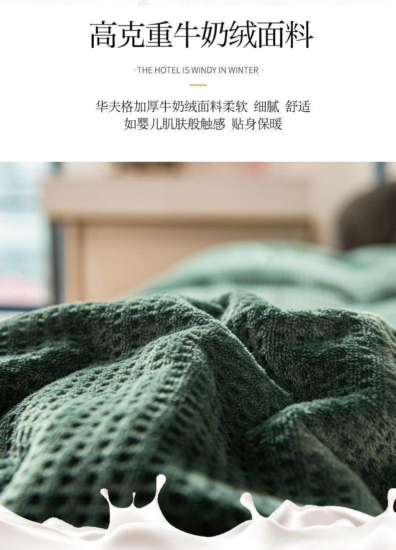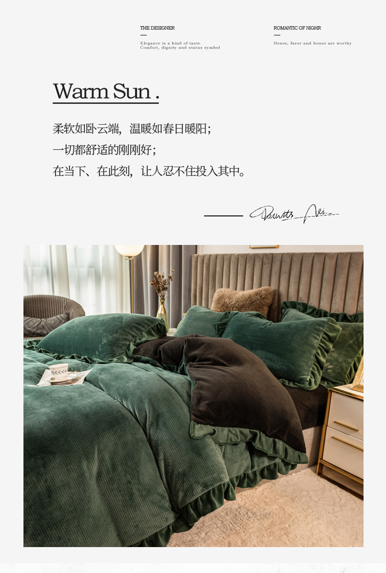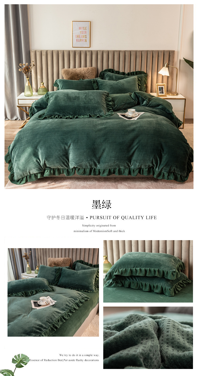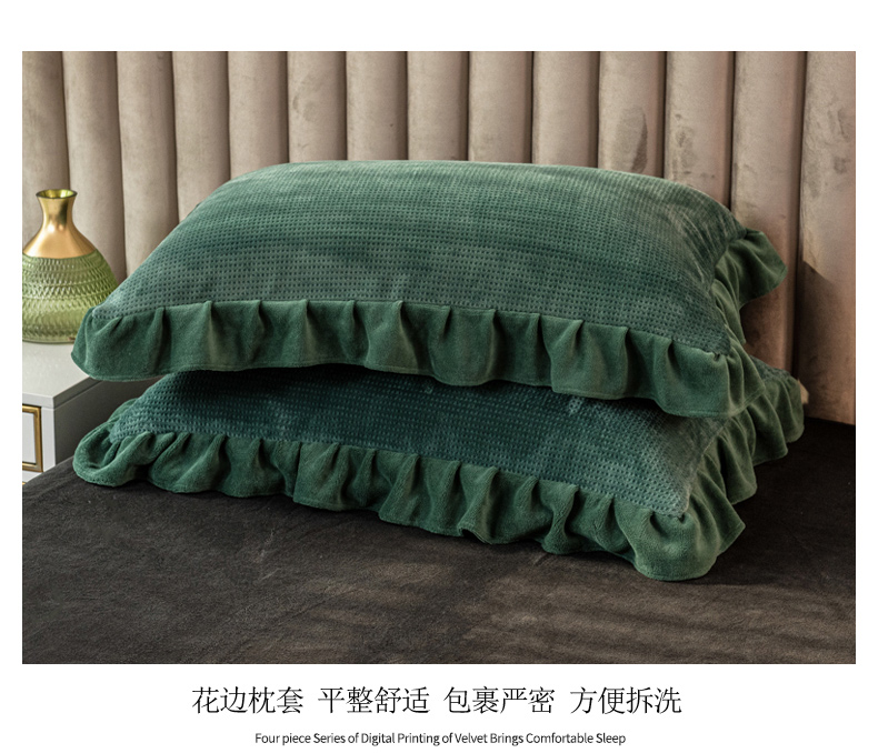 当前位置: 91家纺网 > 商品网购 > 床品套件 > 四件套 > 牛奶绒四件套 > 印季家纺 2025新款华夫格牛奶绒花边四件套 墨绿-灰