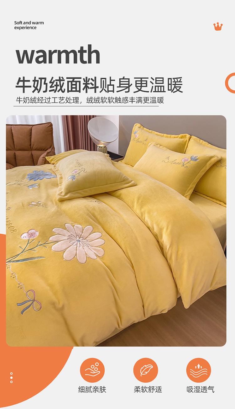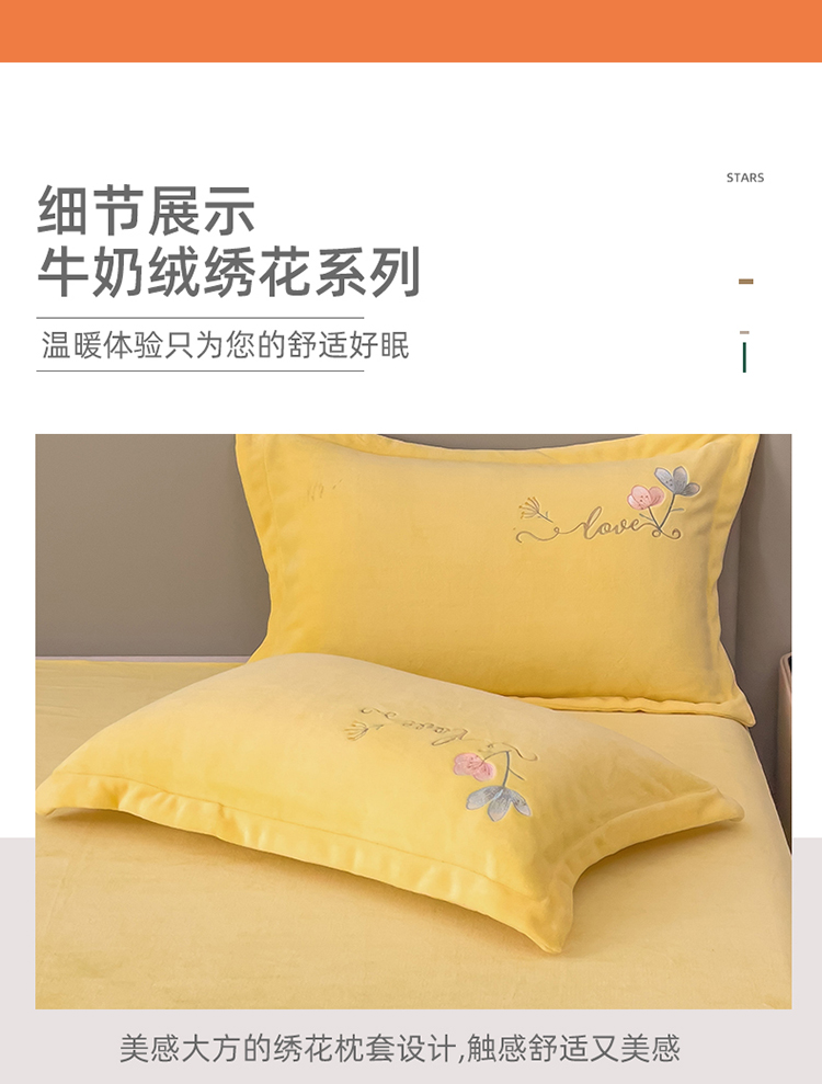 靓生活 2022新款纯色牛奶绒绣花小清新床裙四件套-初遇 奶油黄