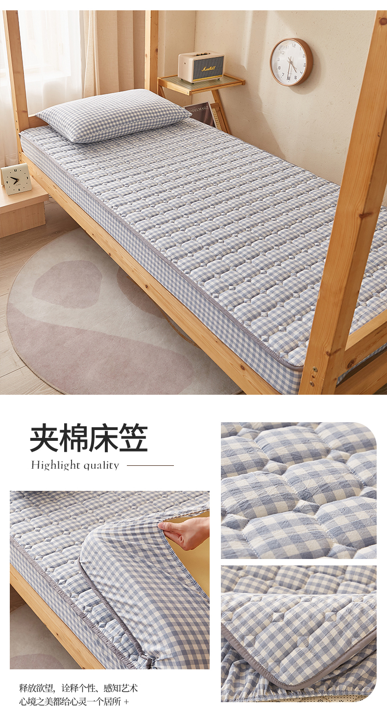 迪乐妮家居 2024新款单人床色织全棉夹棉床笠(无印家居风) 蓝小格