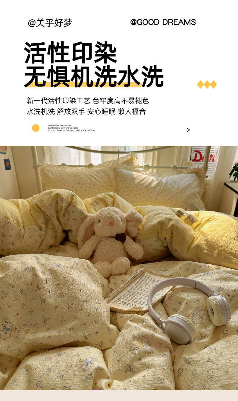 (总)乐沐家纺 2025新款云感皱皱双层纱全棉镂空花边四件套,草莓小兔,春日兔语,泡芙小象,倾心,素瑾,甜梦狗狗,夏日,织梦