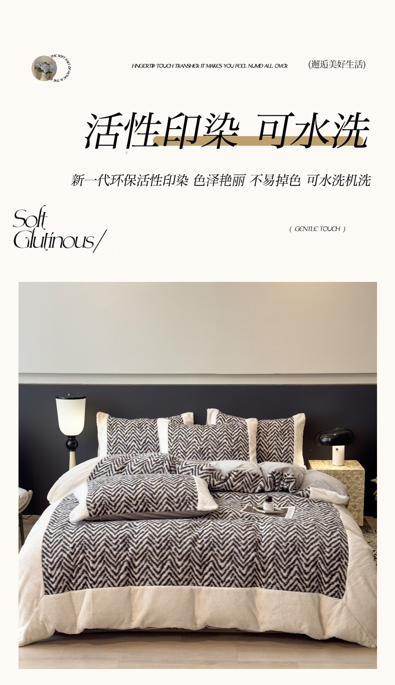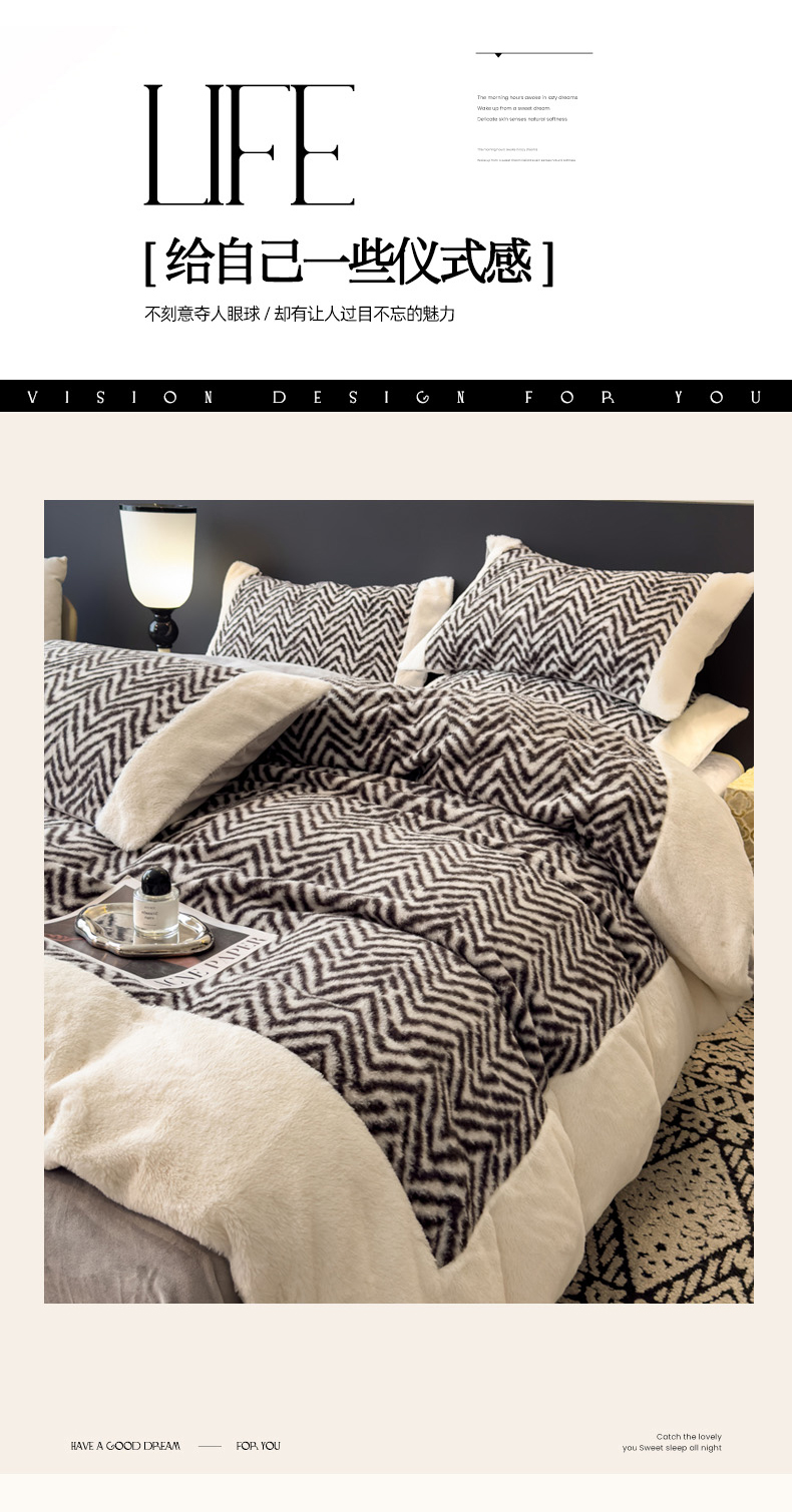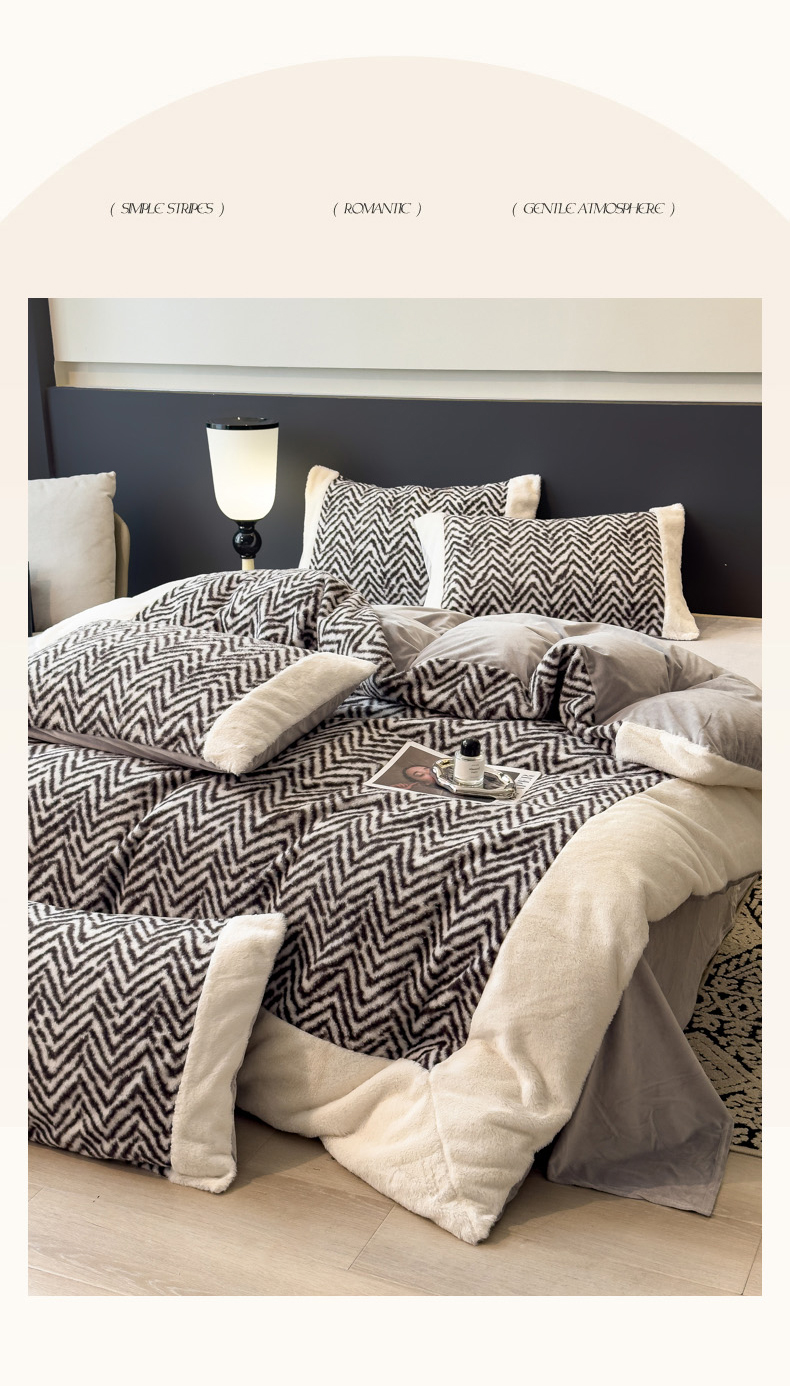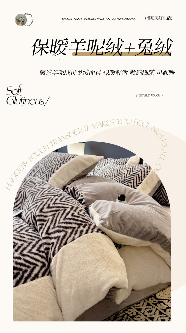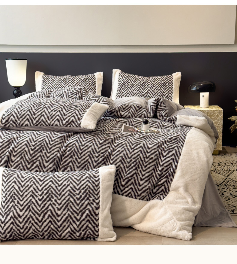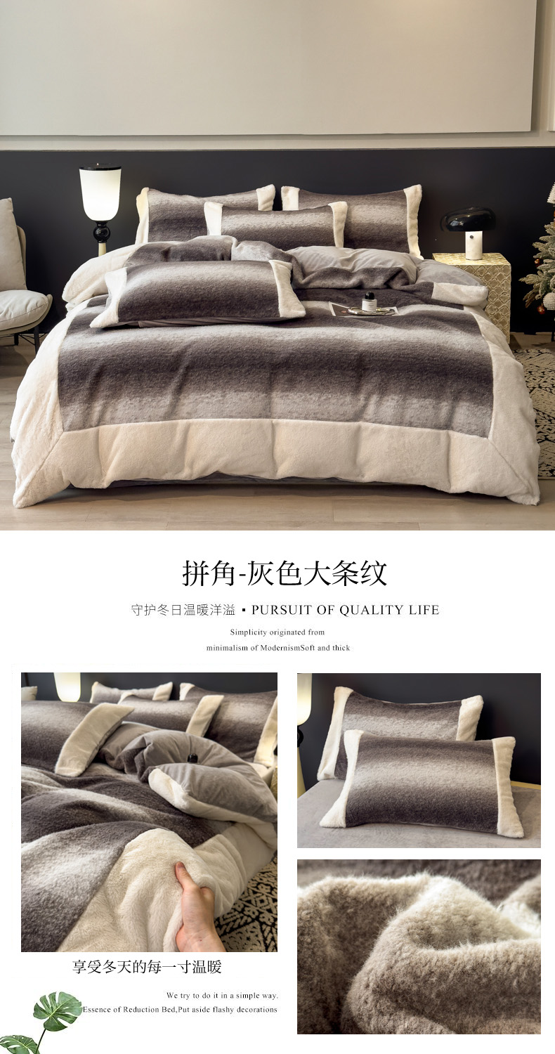 当前位置: 91家纺网 > 商品网购 > 床品套件 > 四件套 > 其它四件套 > 印季家纺 2025新款羊呢绒兔毛大拼角四件套 拼角-灰色波浪