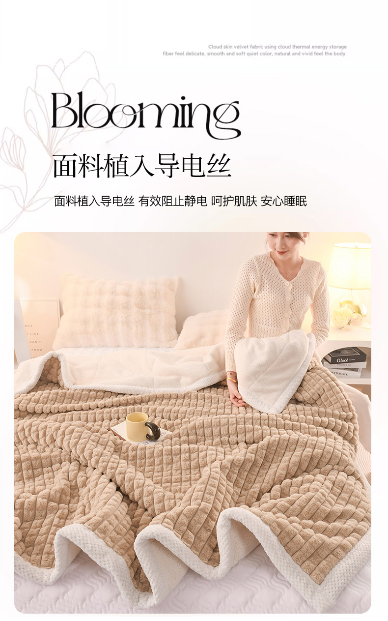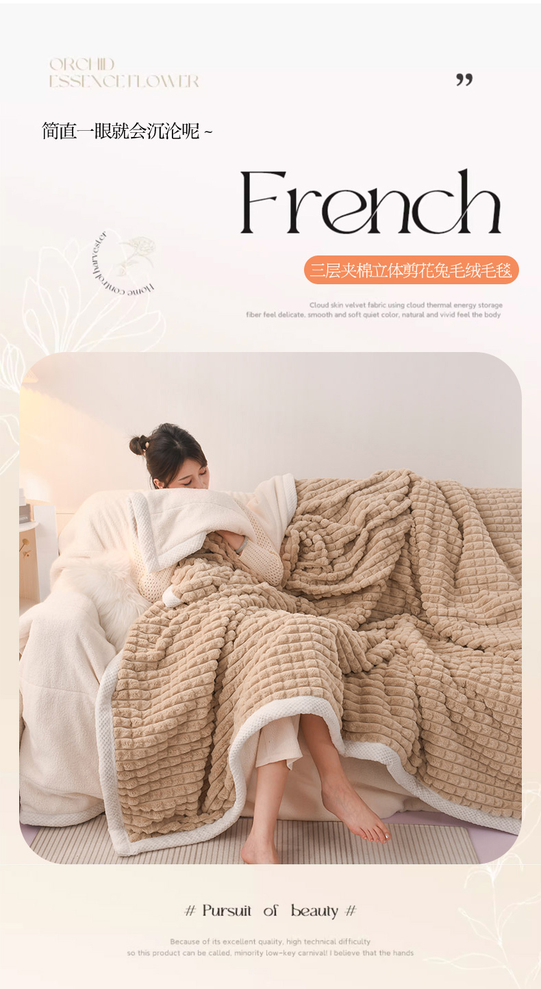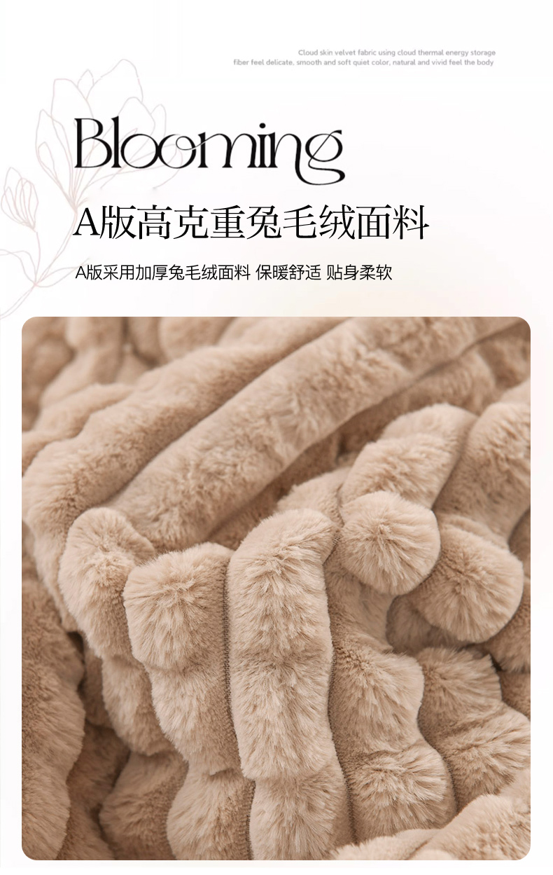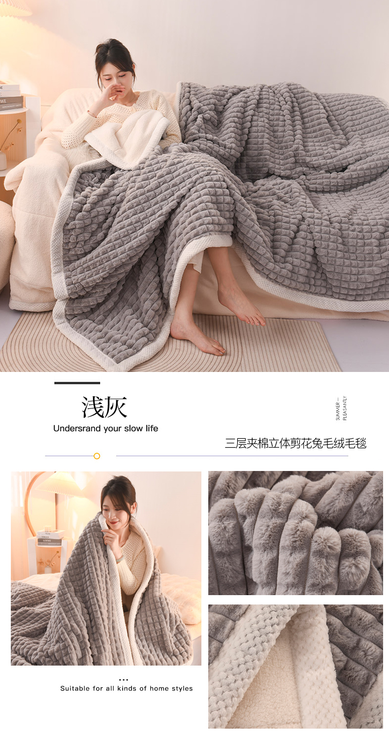 商品名称:印季家纺 2025新款三层夹棉立体剪花兔毛绒毛毯毯子多功能盖毯-亮场景 驼色