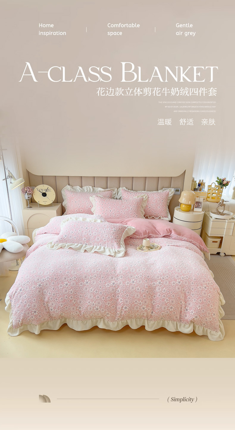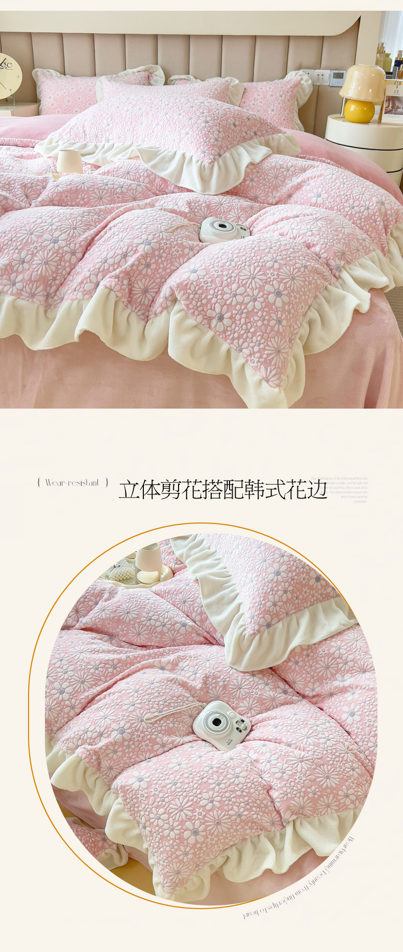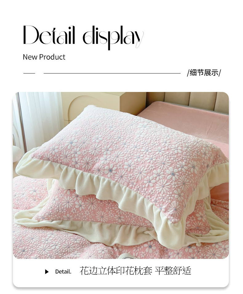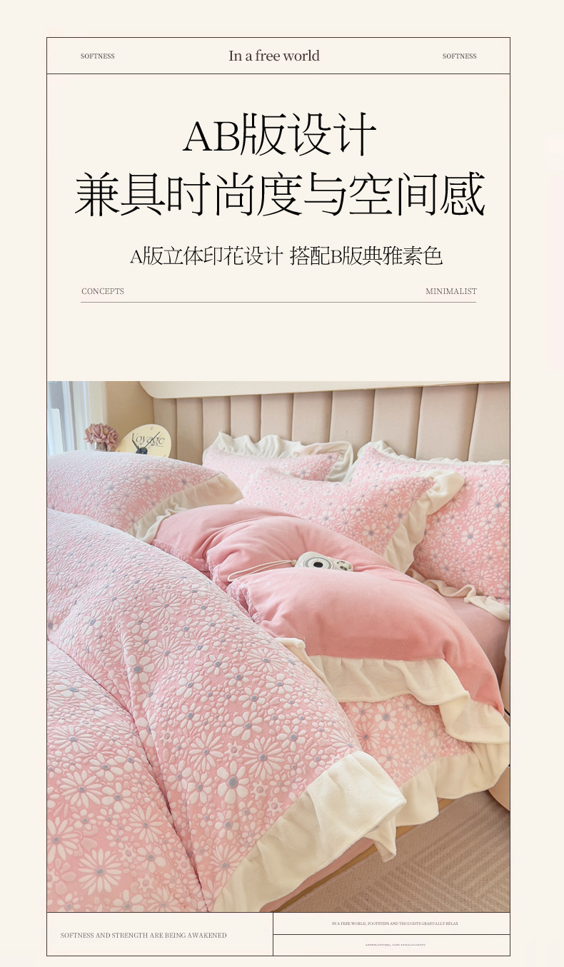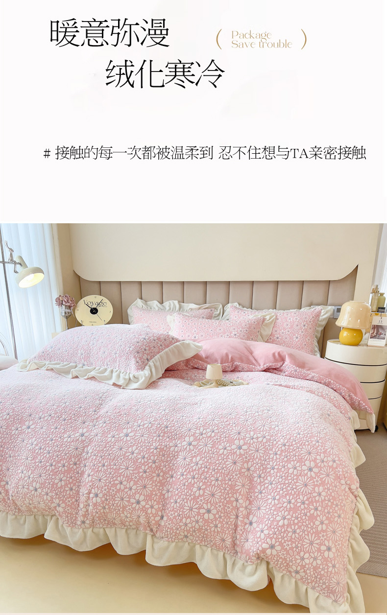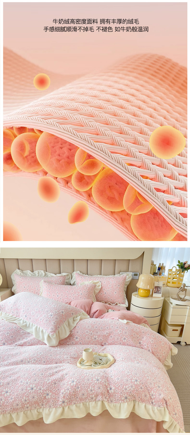 当前位置: 91家纺网 > 商品网购 > 床品套件 > 四件套 > 牛奶绒四件套 > 印季家纺 2025新款花边款立体剪花牛奶绒四件套 粉红