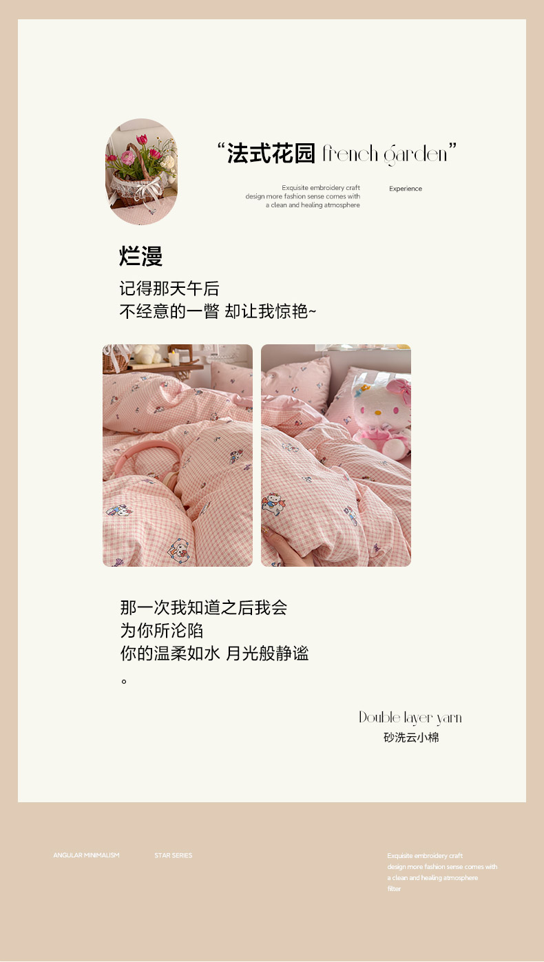 当前位置: 91家纺网 > 商品网购 > 床品套件 > 四件套 > 其它四件套 > 金梦拉家纺 2026新款春夏古法水洗仿棉砂洗云小棉小布袋四件套 小苍兰