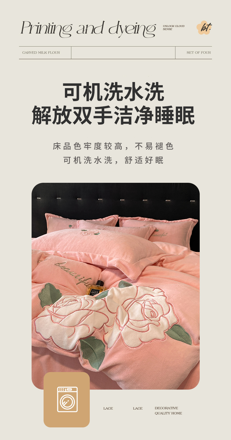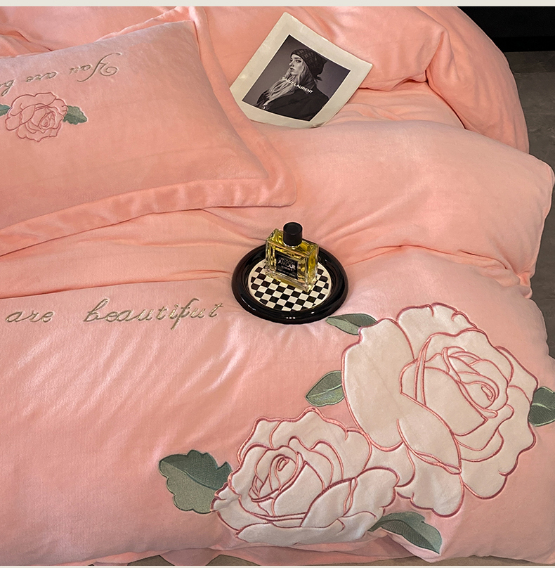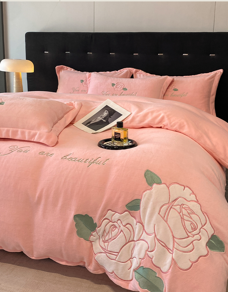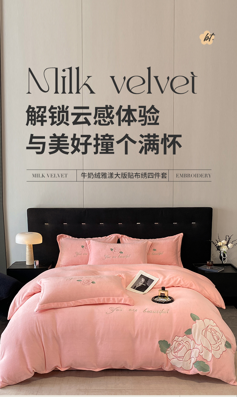 当前位置: 91家纺网 > 商品网购 > 床品套件 > 四件套 > 牛奶绒四件套 > 你好美丽 2025新款200克A类牛奶绒贴布绣大阪四件套雅漾-芬芳 雅漾粉