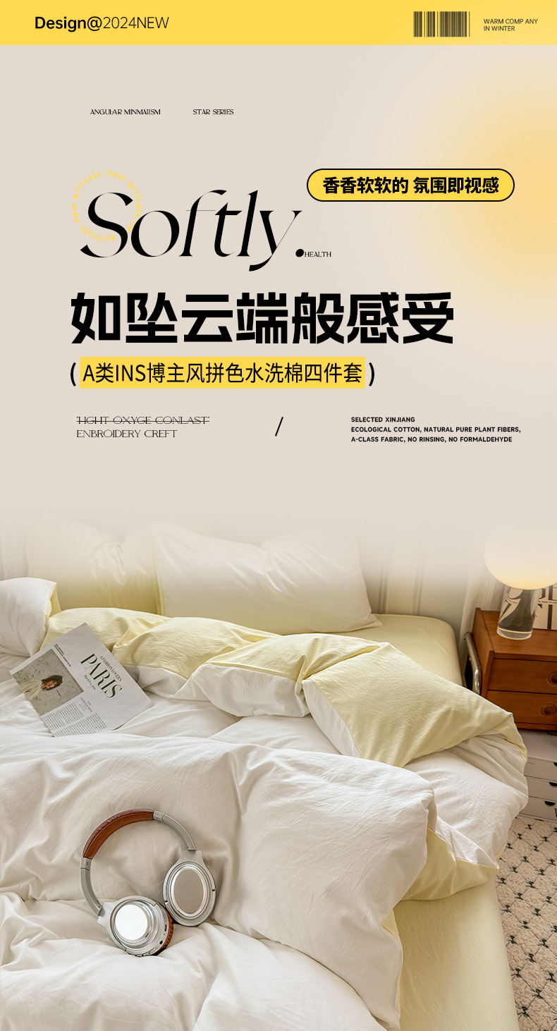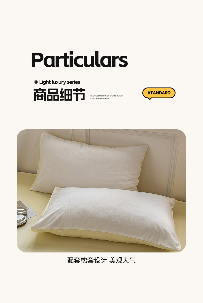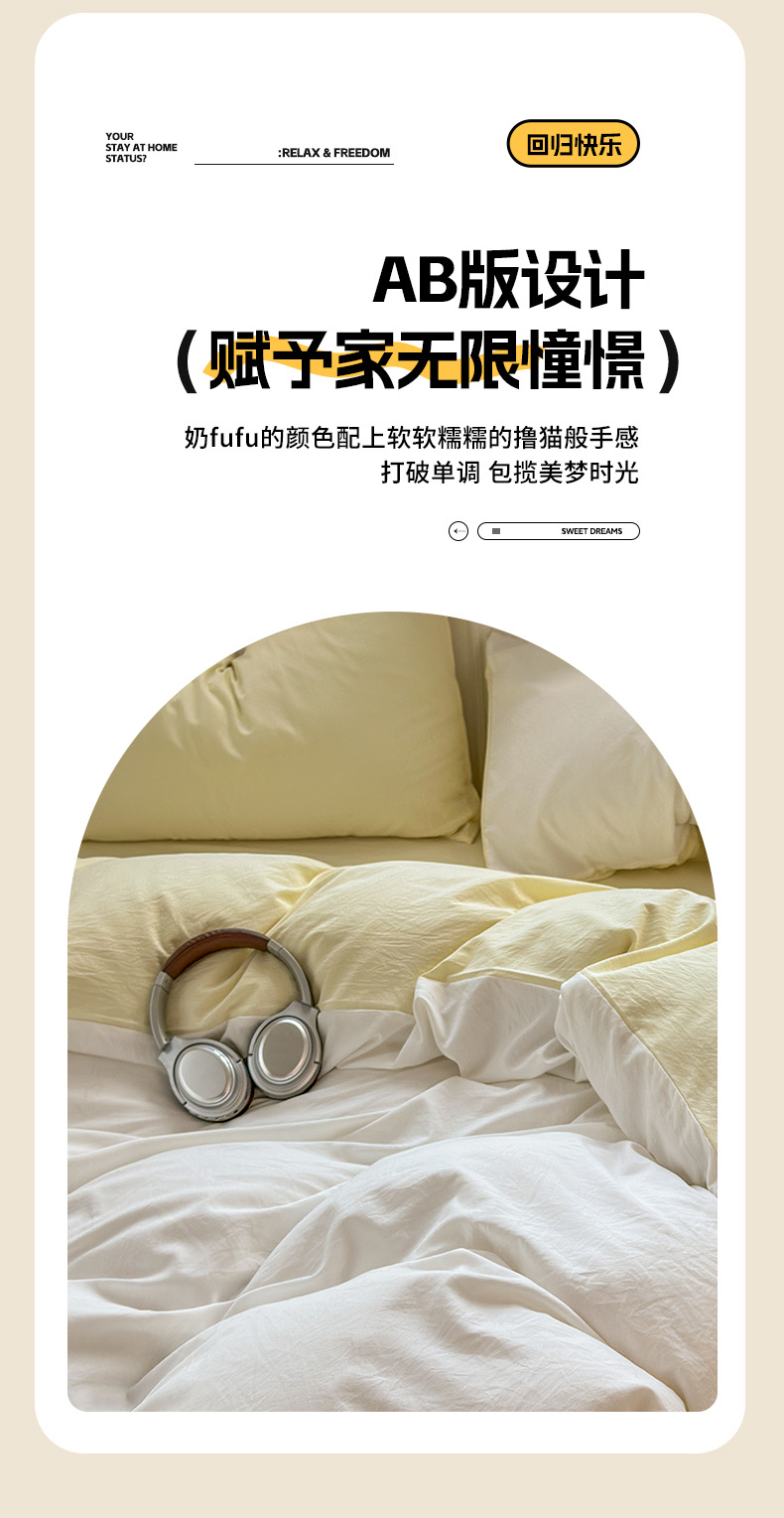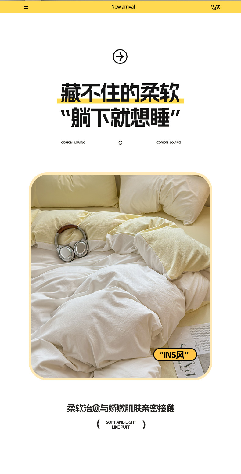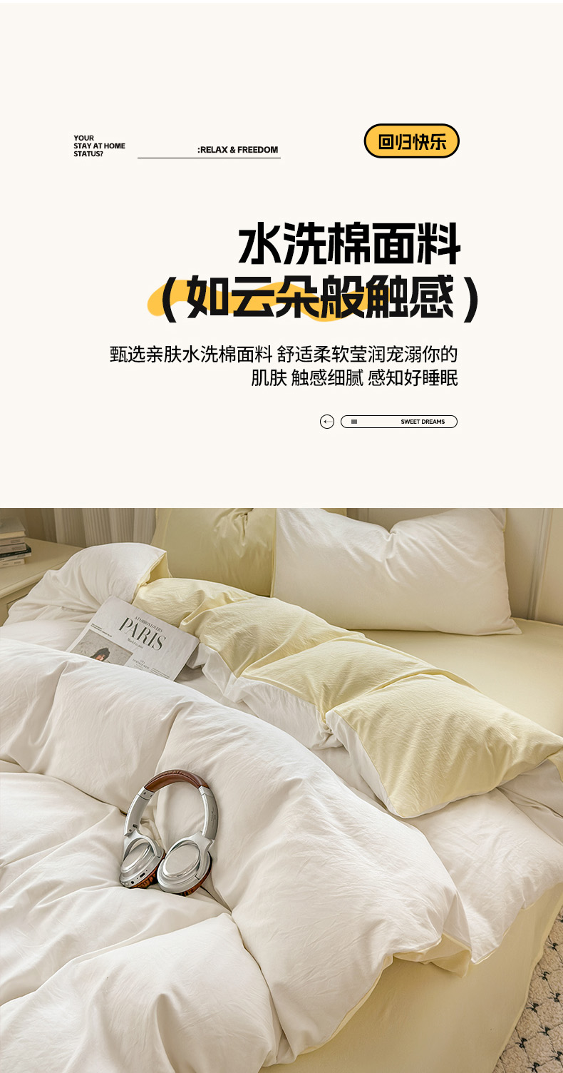 商品名称:冕悠家纺 2025新款A类105克超柔褶皱水洗棉拼色四件套-单被套 奶昔白+芝士黄
