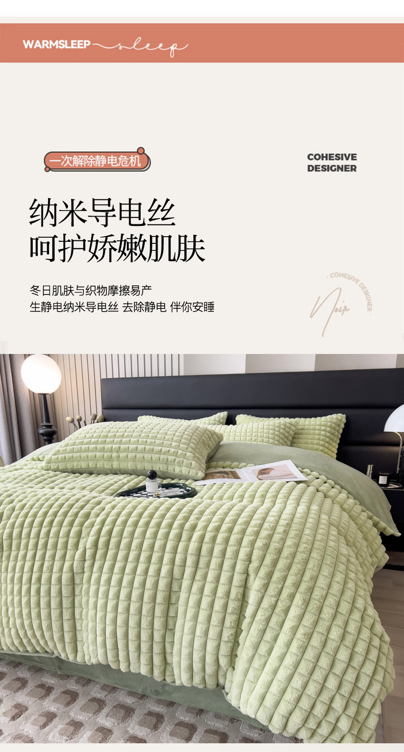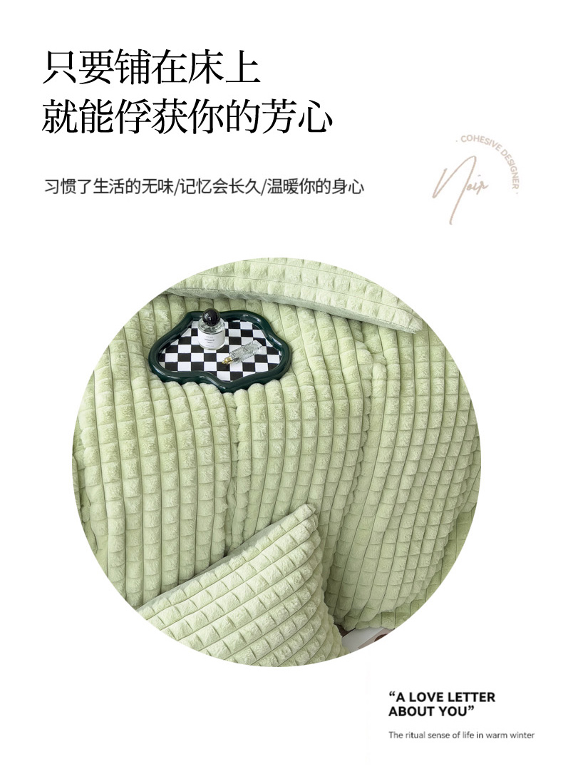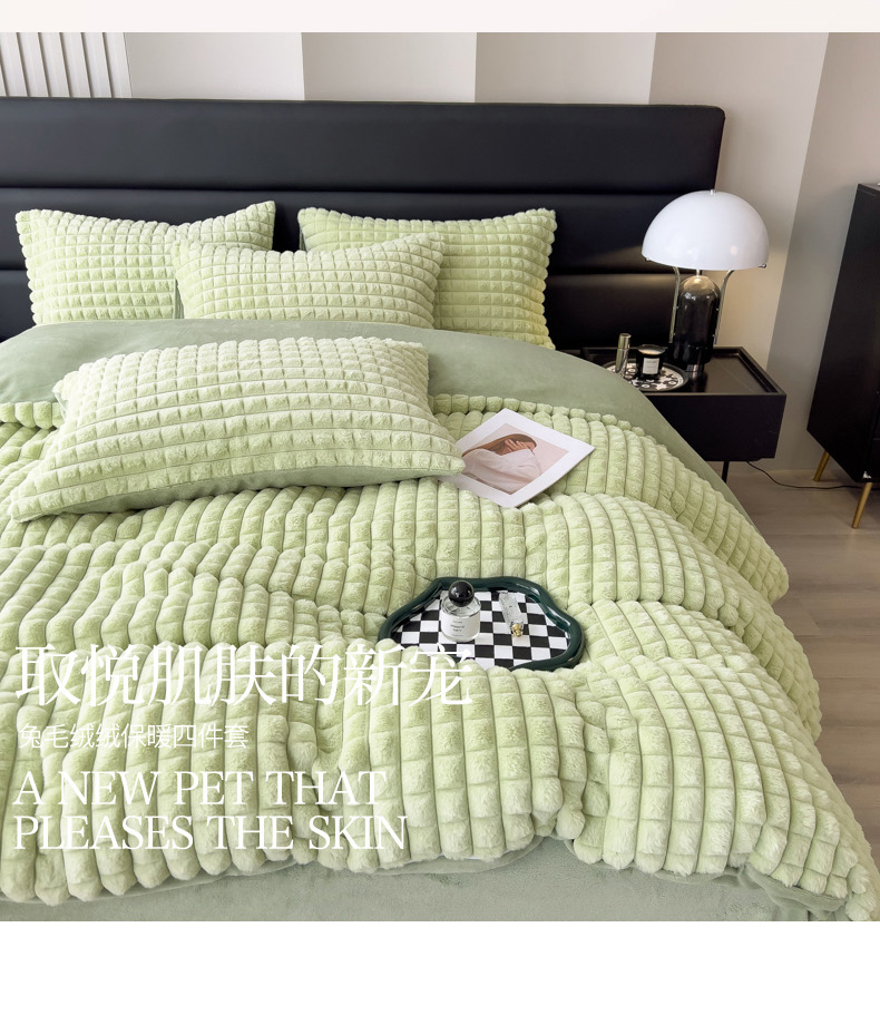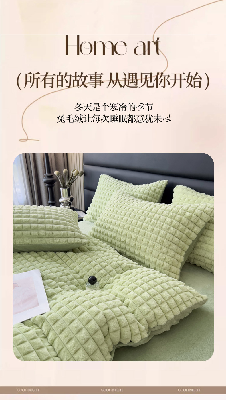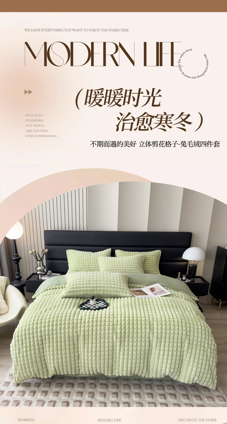 当前位置: 91家纺网 > 商品网购 > 床品套件 > 四件套 > 兔毛绒四件套 > 印季家纺 2025新款立体剪花格子兔毛绒四件套 草绿