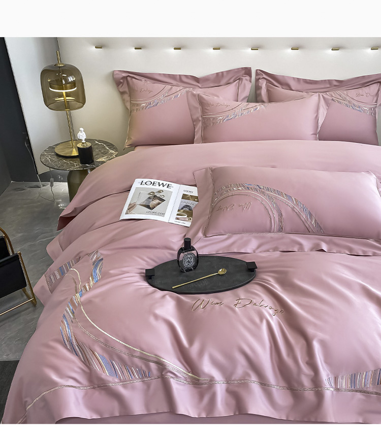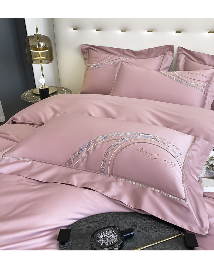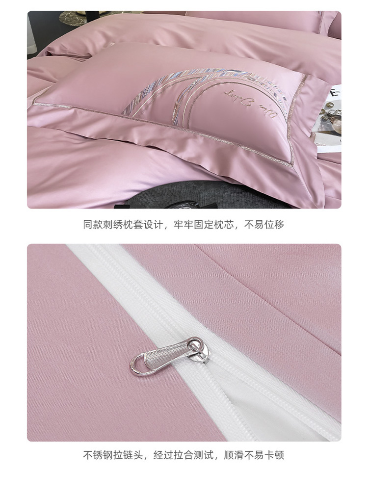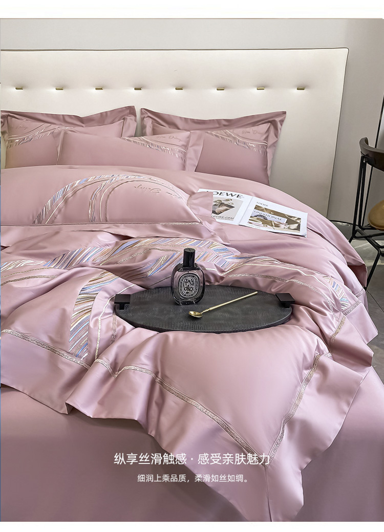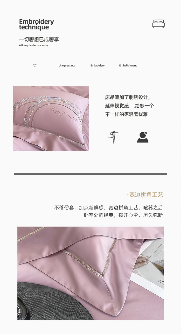 柔觉家纺 天丝刺绣贡缎提花全棉四件套,卡曼时尚-粉紫