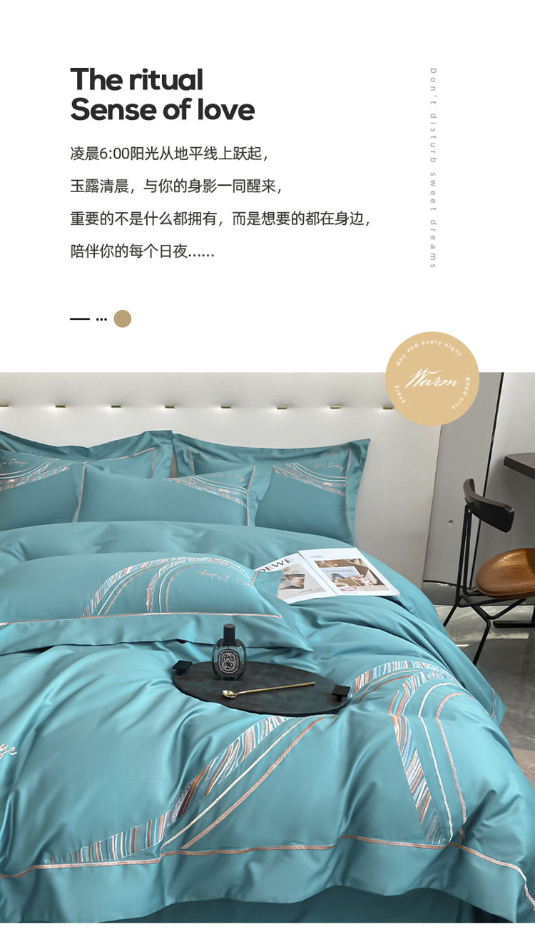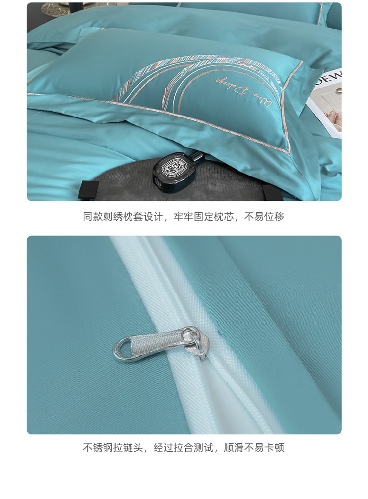 柔觉家纺 天丝刺绣贡缎提花全棉四件套,柔梦-海蓝