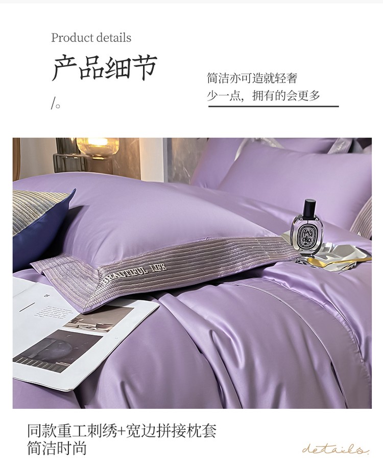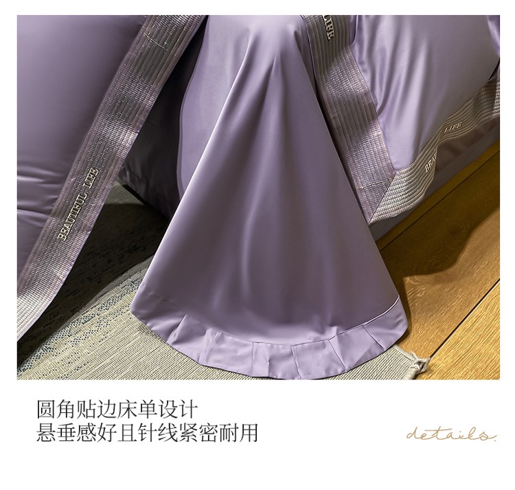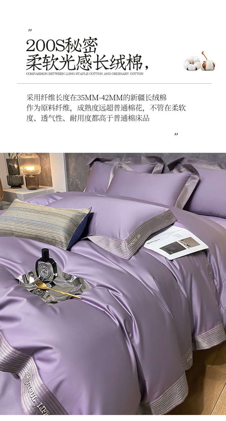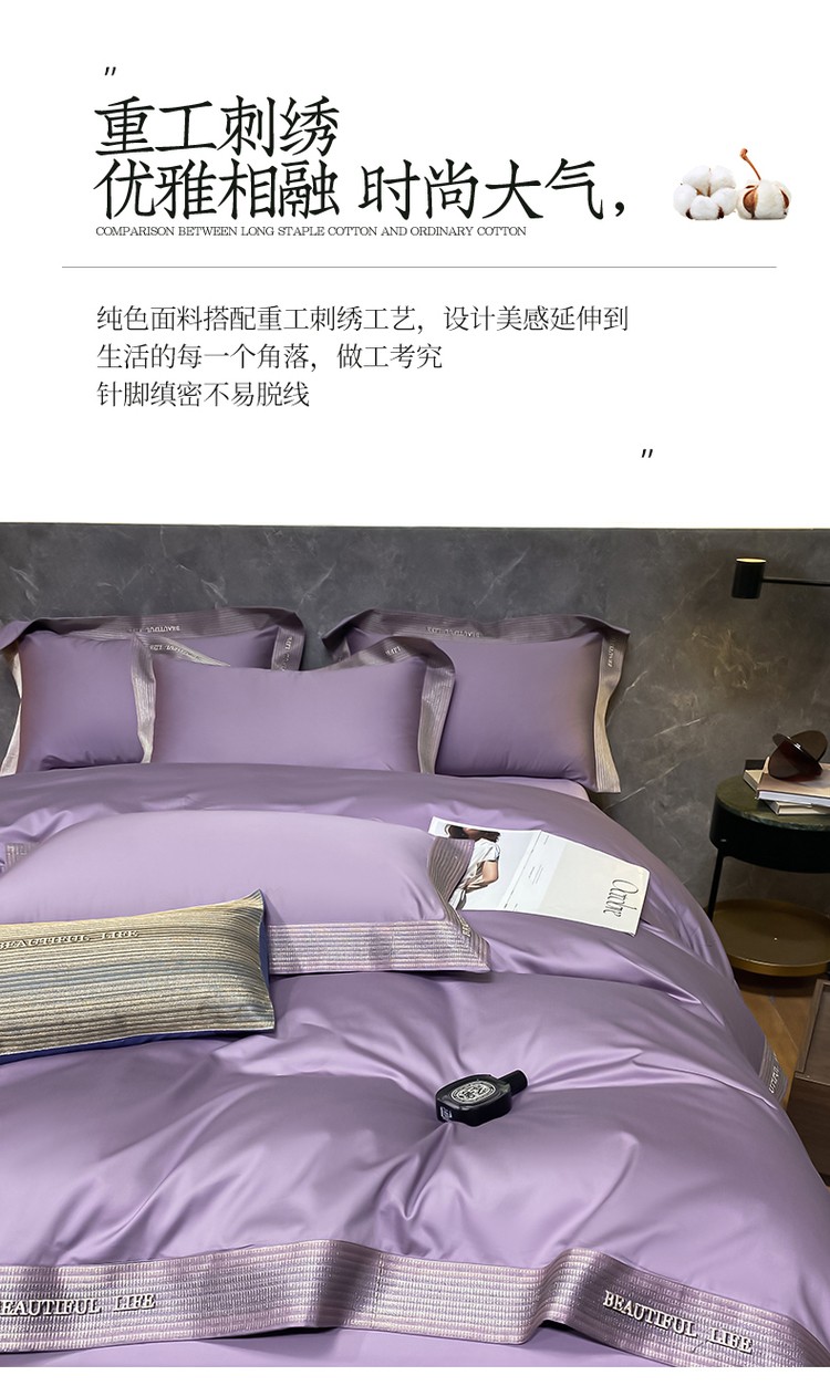 柔觉家纺 天丝刺绣贡缎提花全棉四件套,卡曼时尚-粉紫