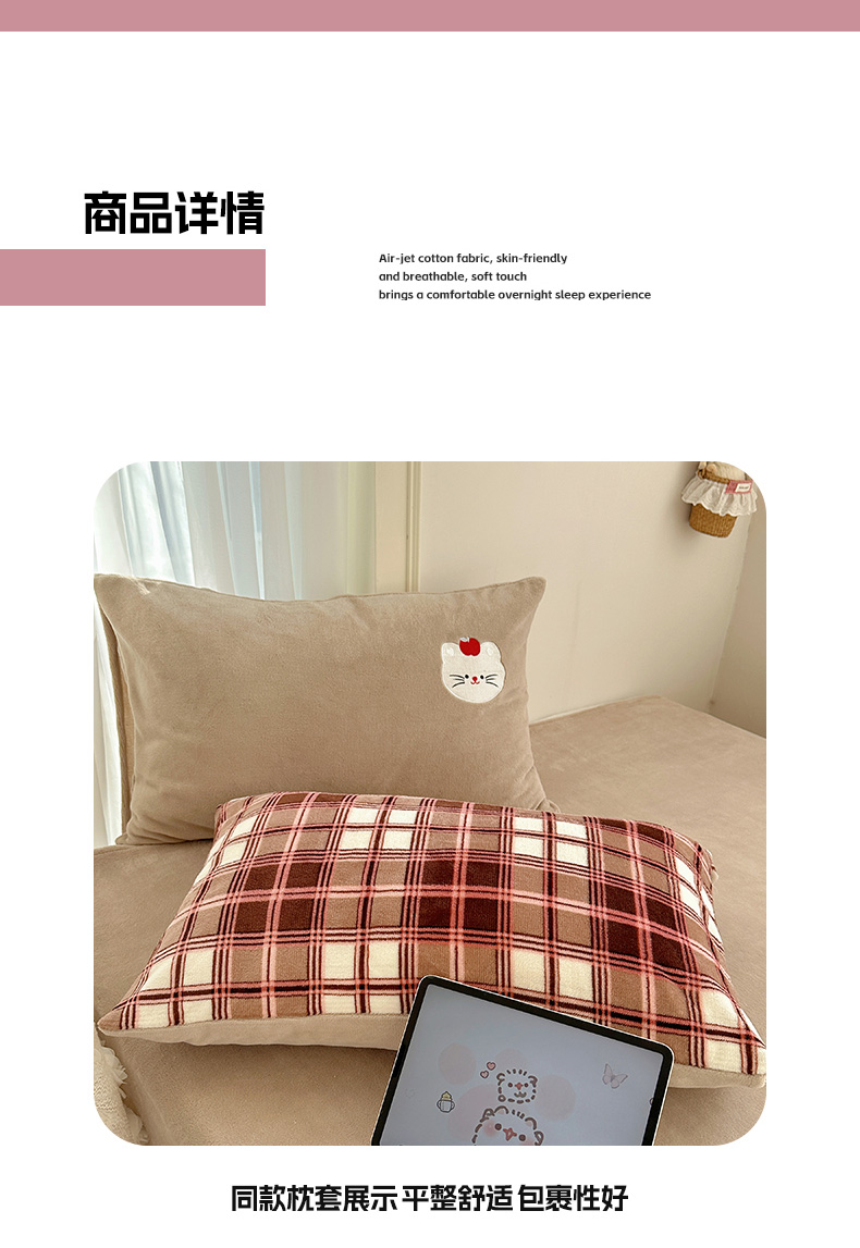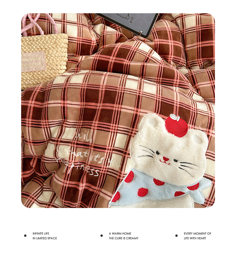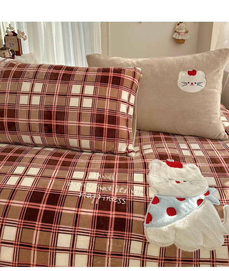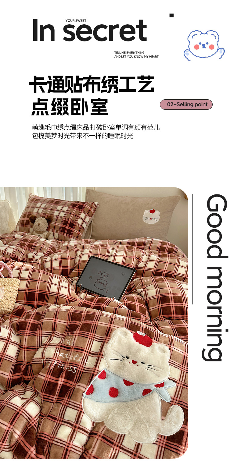 (总)顾里家纺 2024秋冬新款格子猫咪毛巾绣牛奶绒四件套,粉格猫咪,黄格猫咪,咖格猫咪,蓝格猫咪,绿格猫咪