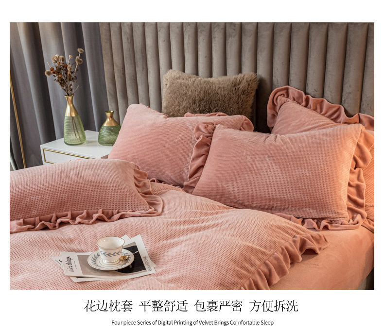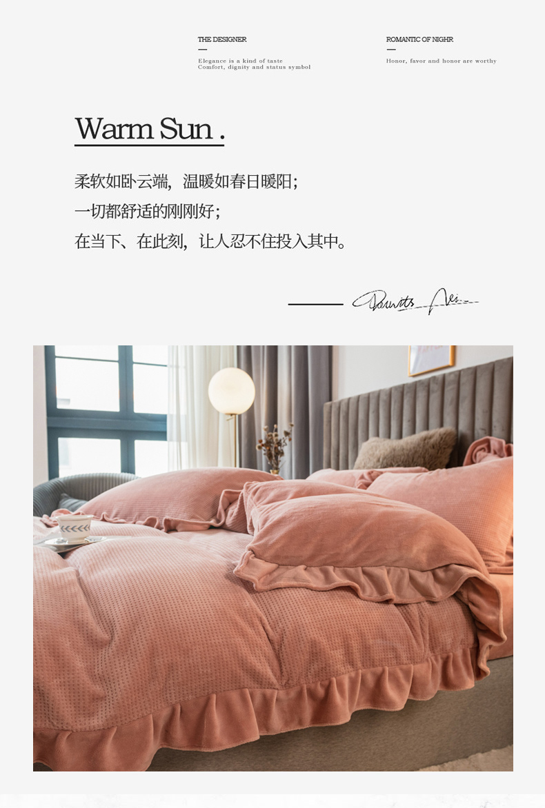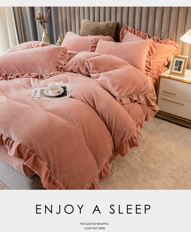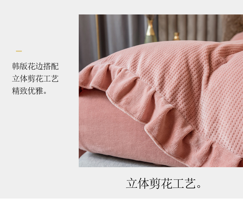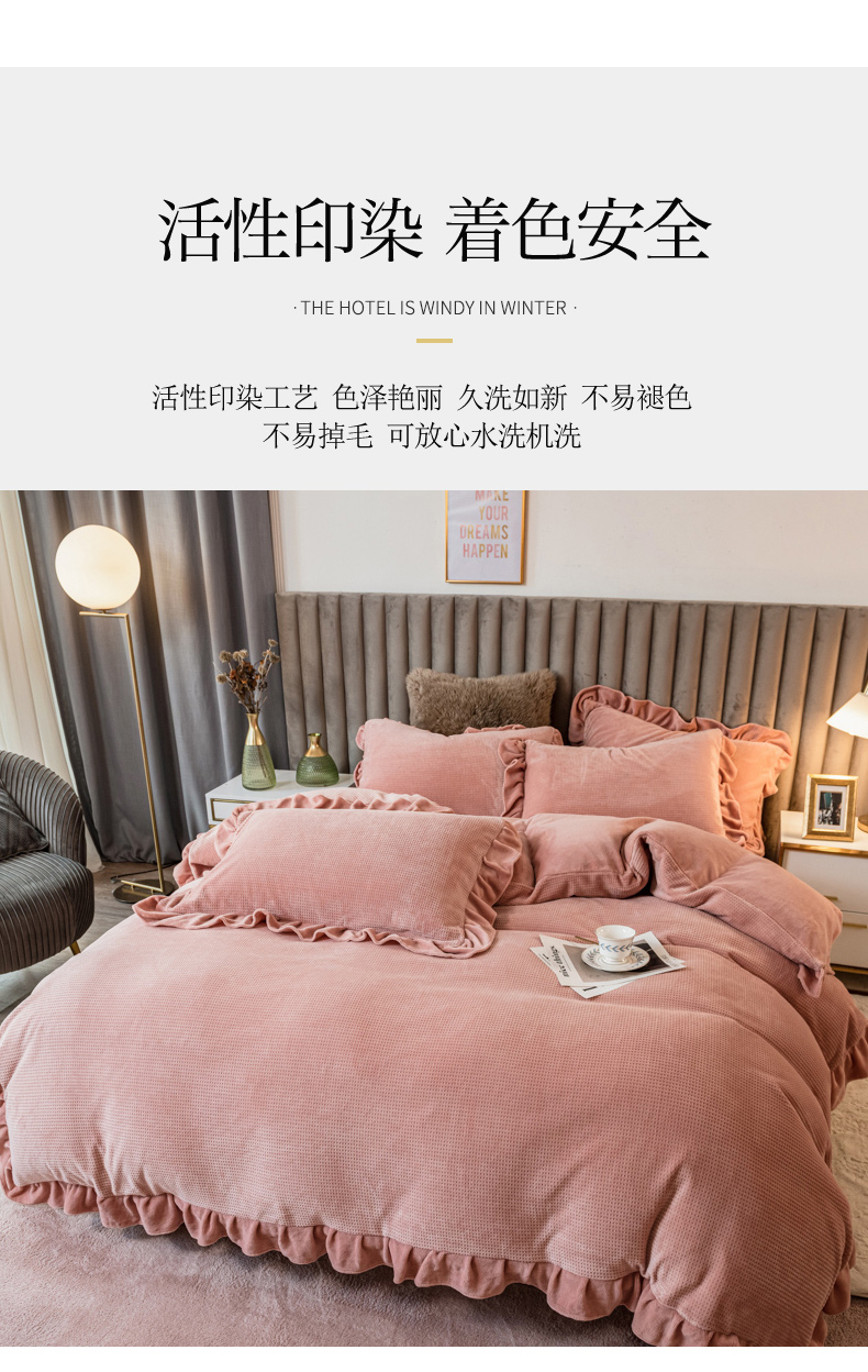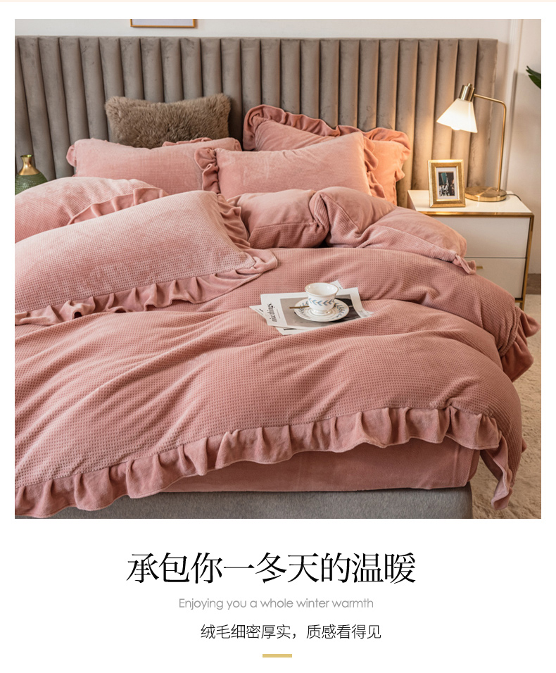 当前位置: 91家纺网 > 商品网购 > 床品套件 > 四件套 > 牛奶绒四件套 > 印季家纺 2025新款华夫格牛奶绒花边四件套 豆沙